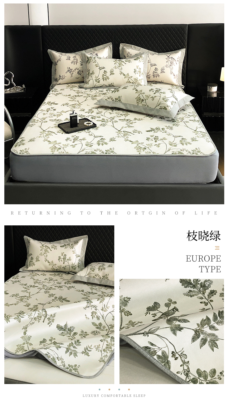 商品名称:三味舒屋 2025新款凉感抗菌防螨印花冰丝养生席手绘系列【花卉】床笠款 枝晓绿