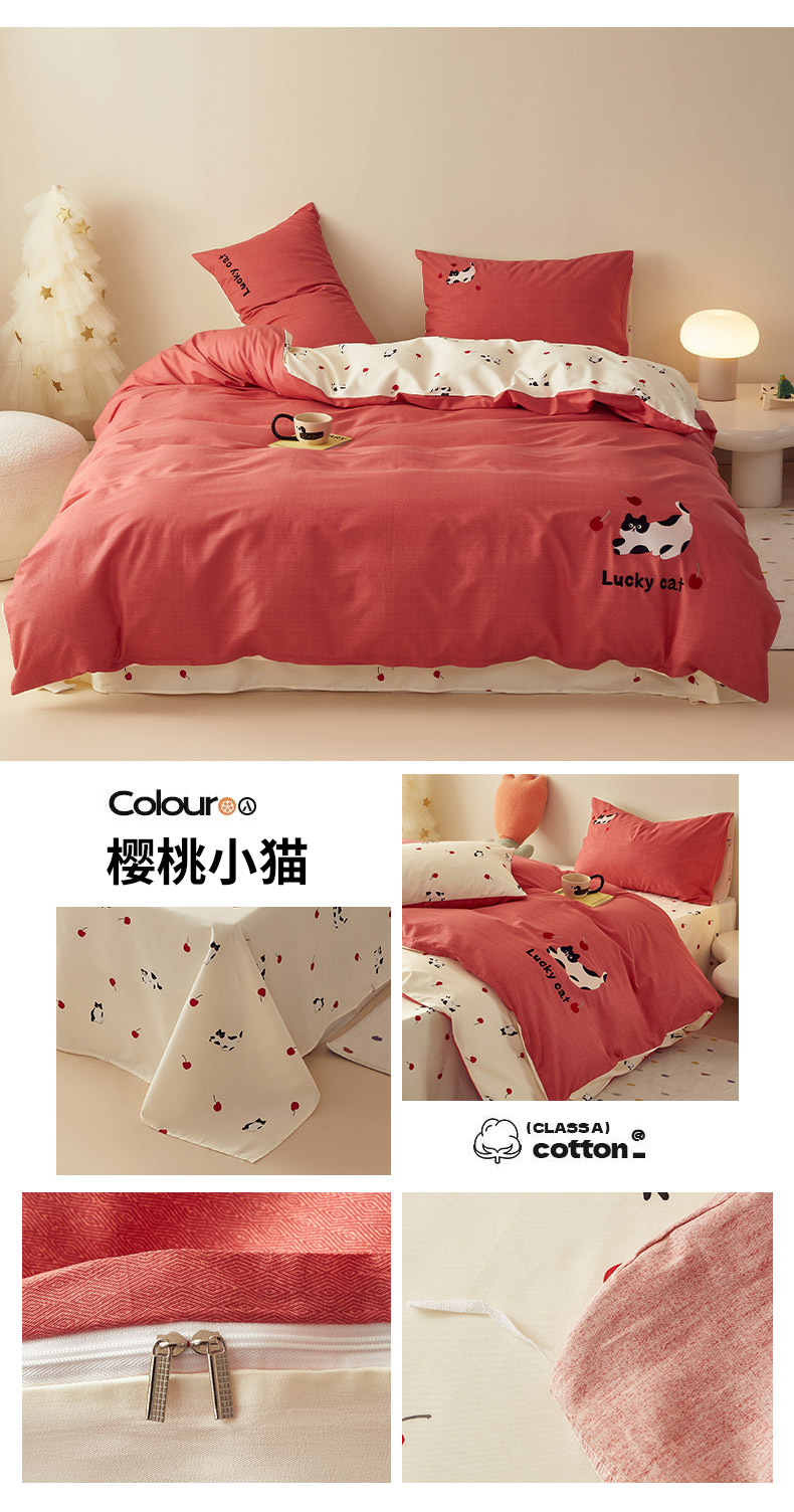 商品名称:怡家居 2024新款全棉印花加绣花四件套 樱桃小猫