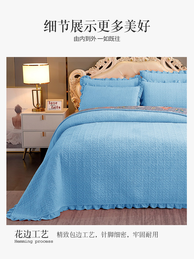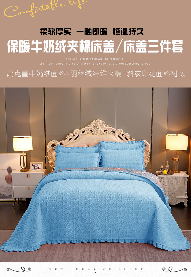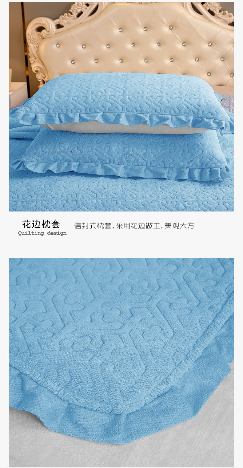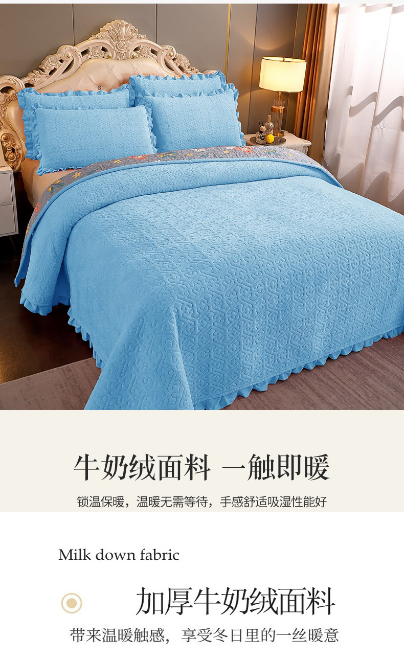 当前位置: 91家纺网 > 商品网购 > 床品套件 > 四件套 > 其它四件套 > 晶缦家纺 2024新款纯色小花边牛奶绒床盖三件套 暖馨-天蓝