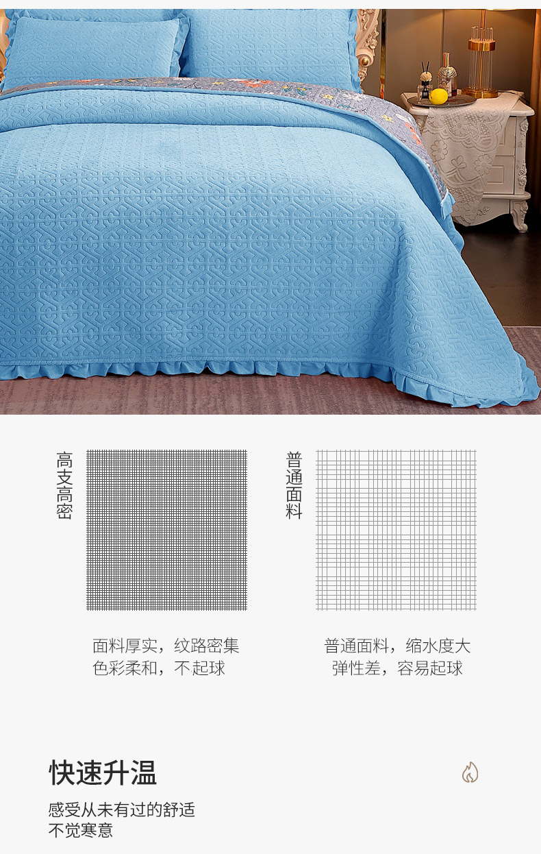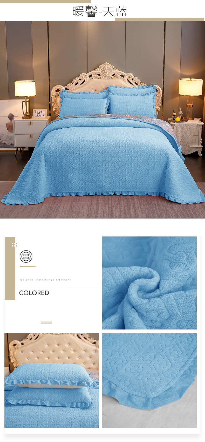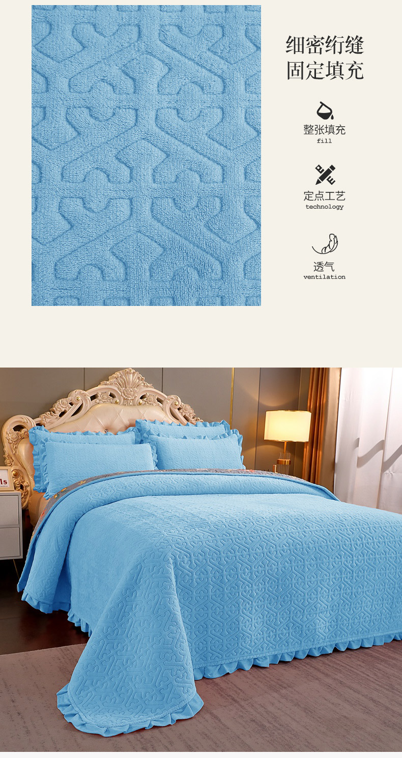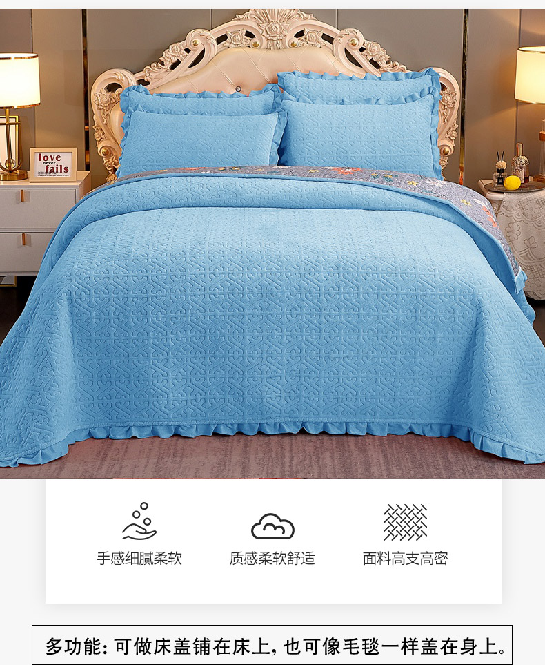 当前位置: 91家纺网 > 商品网购 > 床品套件 > 四件套 > 其它四件套 > 晶缦家纺 2024新款纯色小花边牛奶绒床盖三件套 暖馨-天蓝