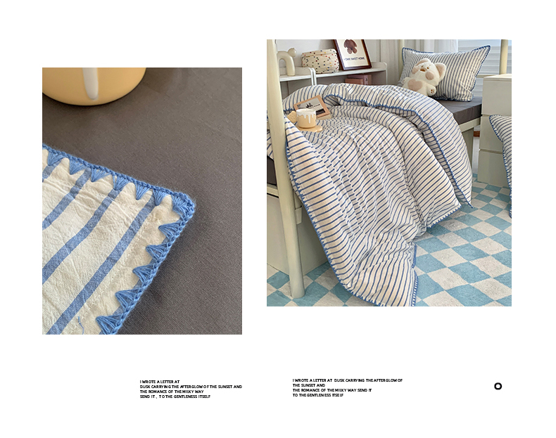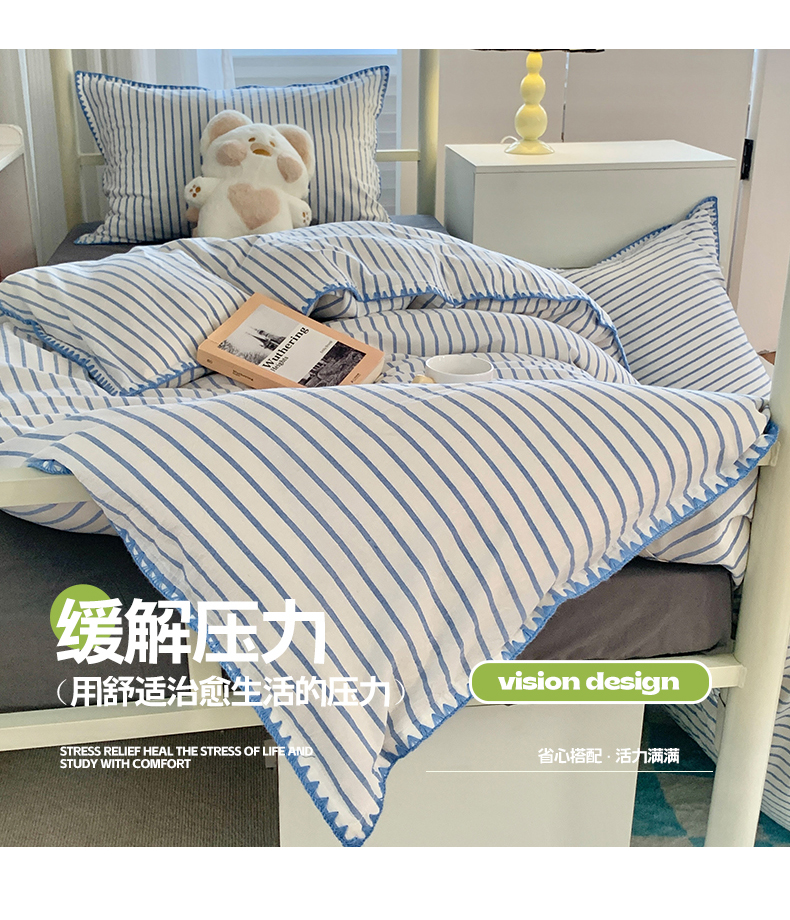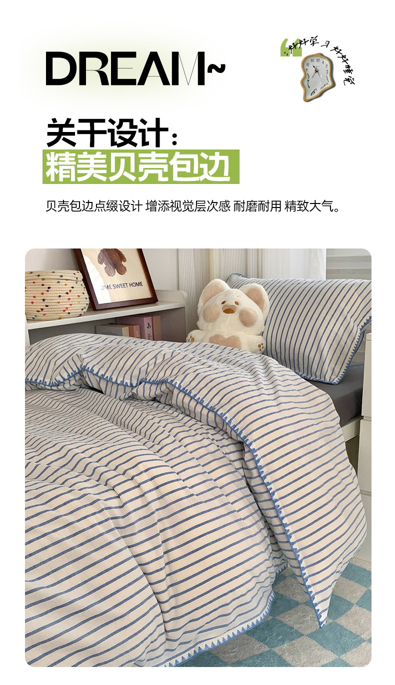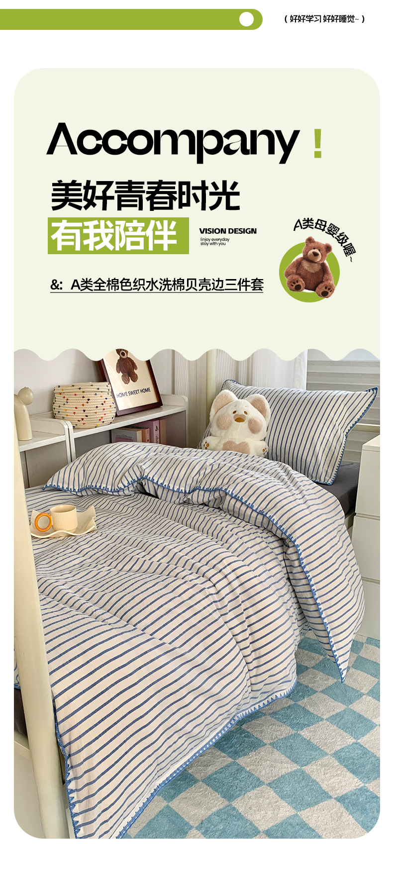 莱茵家居 2024新款A类全棉色织水洗棉贝壳边三件套 蓝苏条