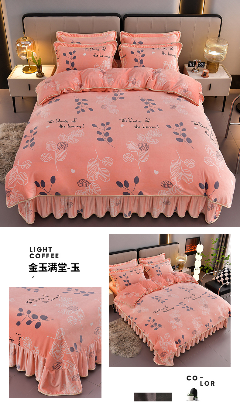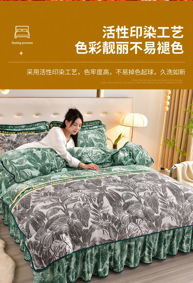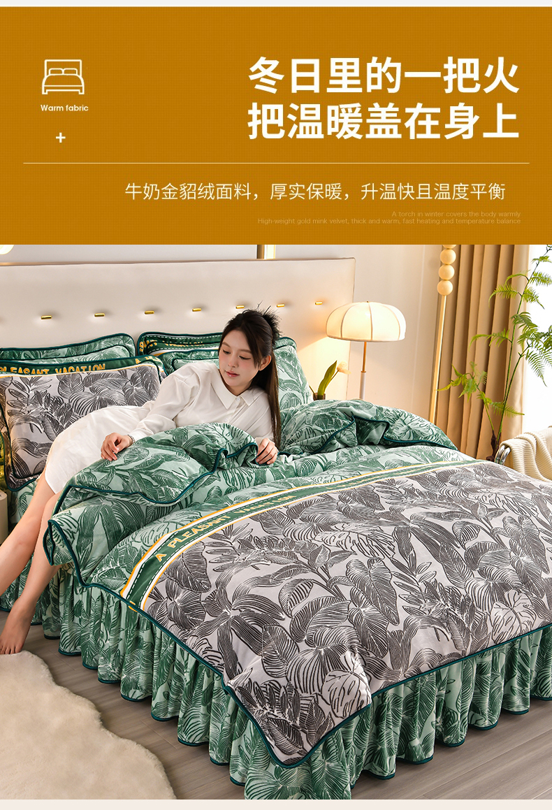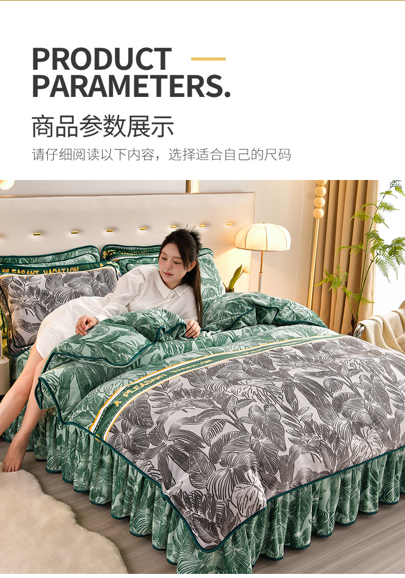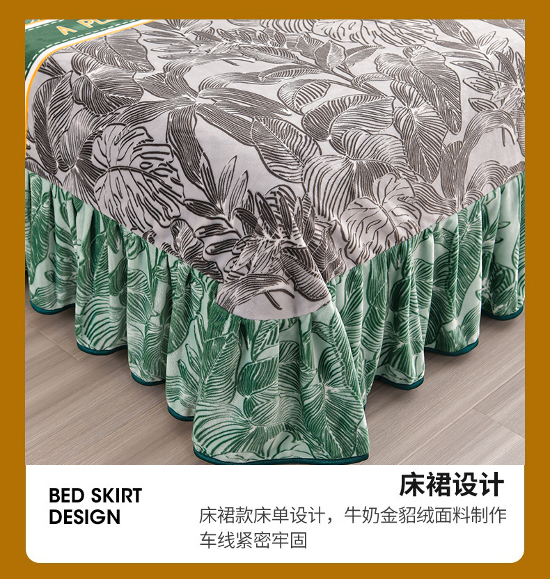 商品名称:馨梦缘 2025新款小包边款牛奶绒8.5斤高克重牛奶绒金雕绒床裙款四件套 叶语浪漫