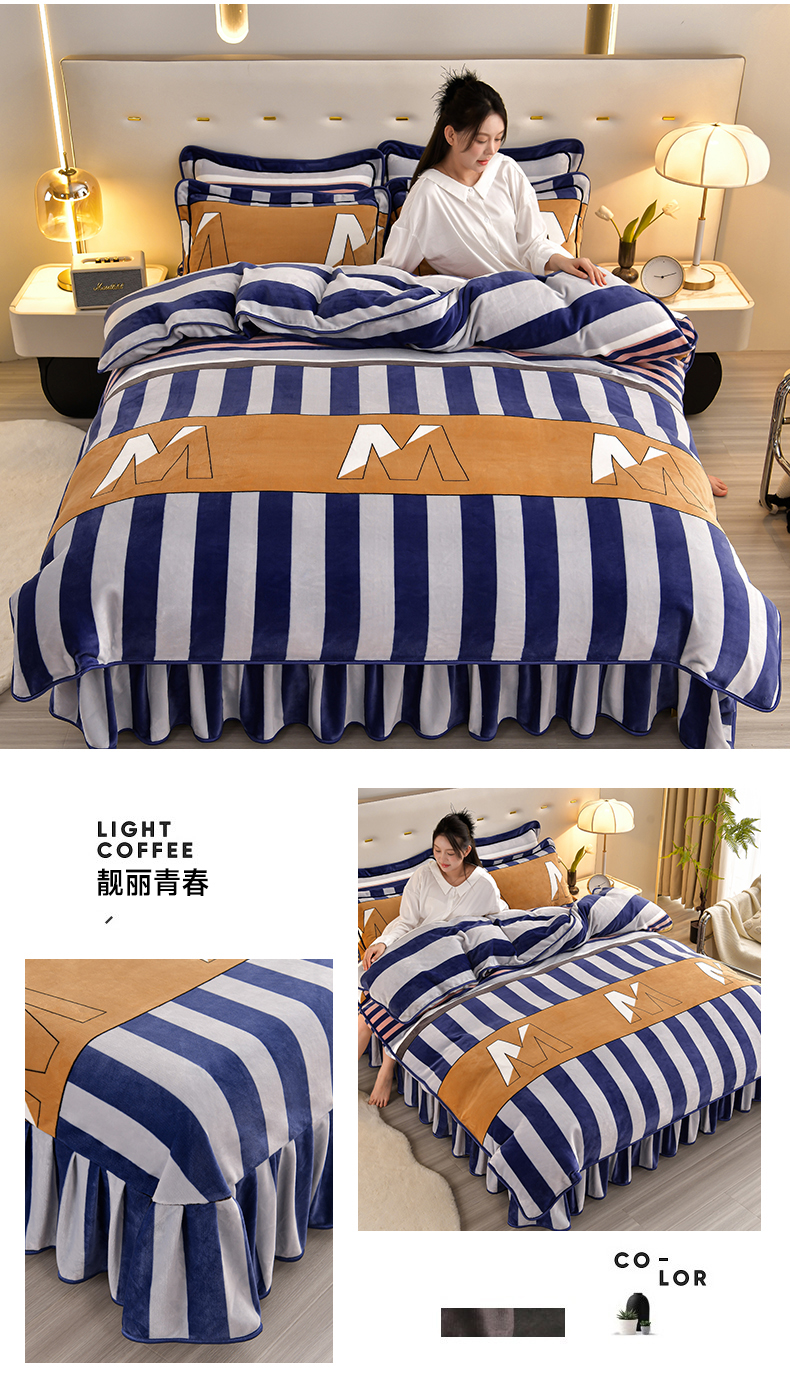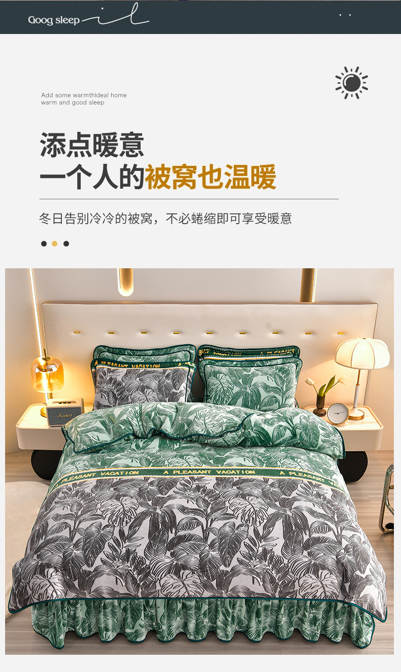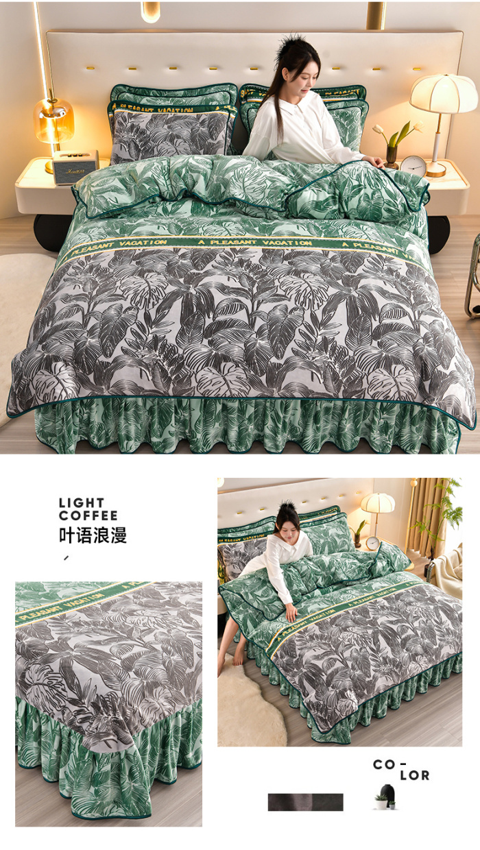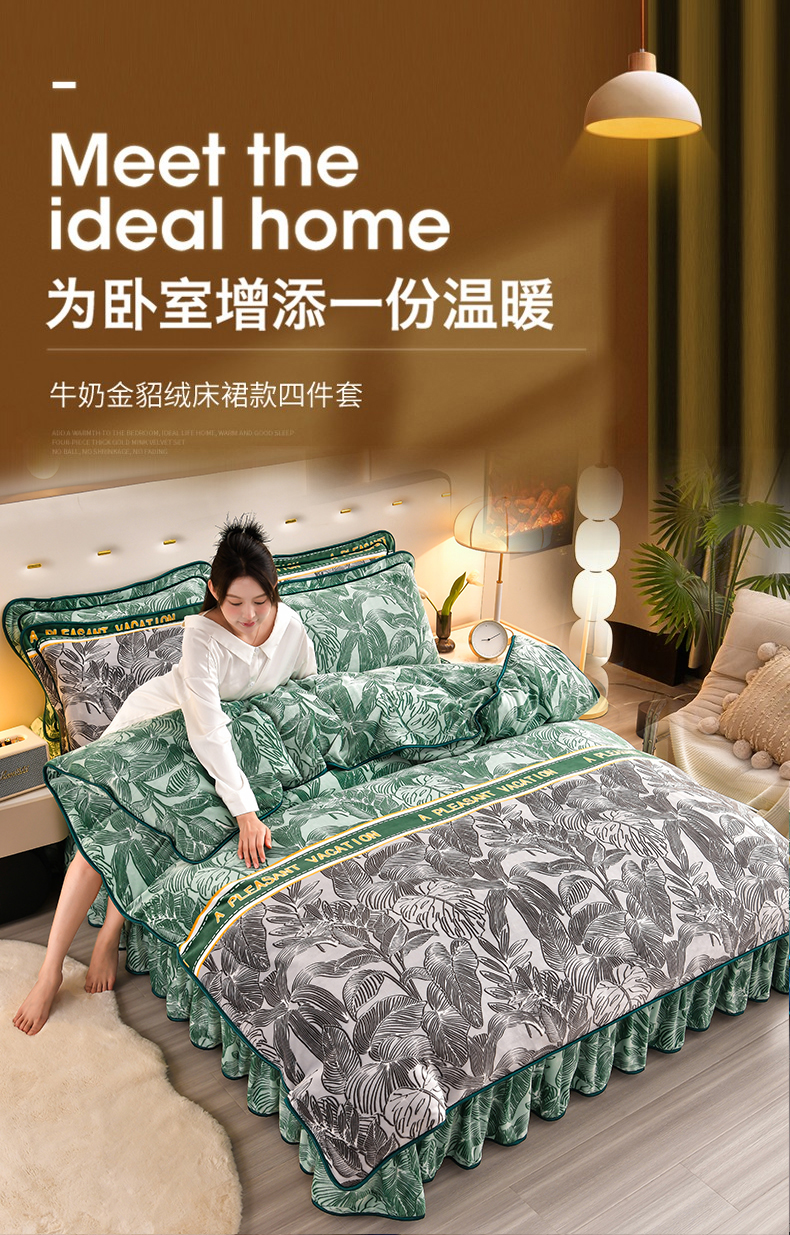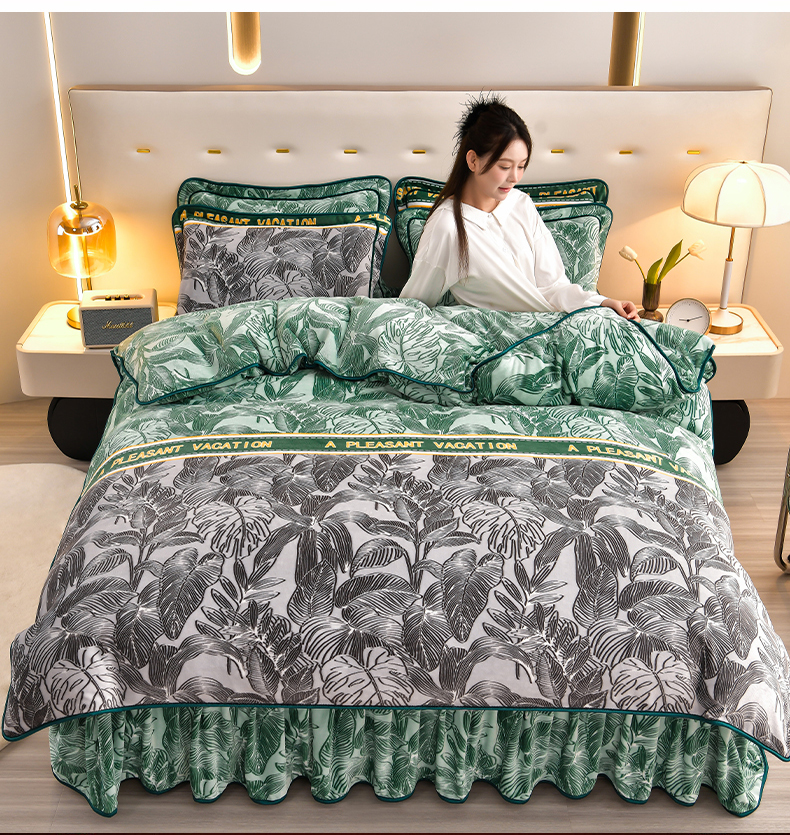 商品名称:馨梦缘 2025新款小包边款牛奶绒8.5斤高克重牛奶绒金雕绒床裙款四件套 叶语浪漫