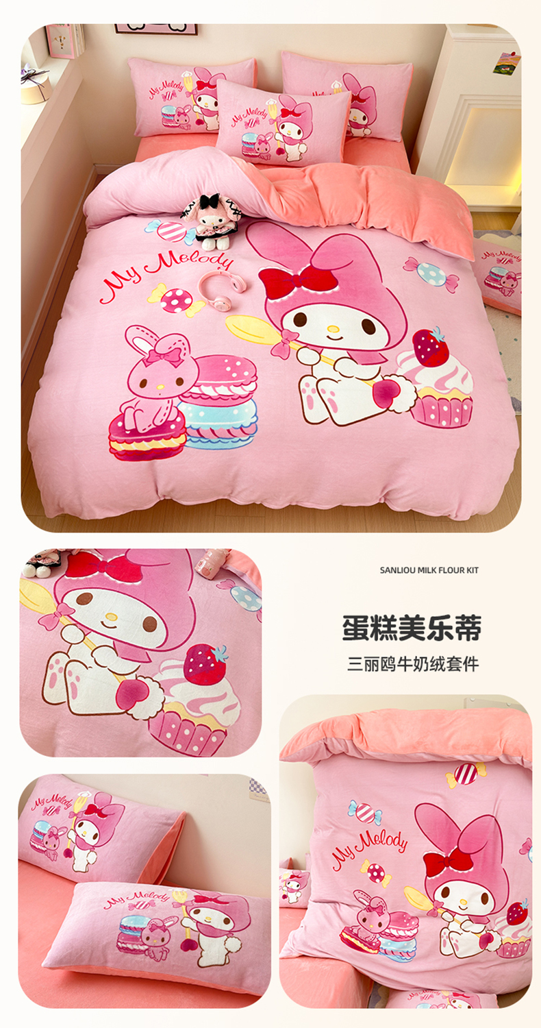 当前位置: 91家纺网 > 商品网购 > 床品套件 > 四件套 > 牛奶绒四件套 > 孩子王家纺 2024新款正版授权三丽鸥库洛米大版卡通学生宿舍双面加厚牛奶绒系列四件套--提供买家秀 蛋糕美乐蒂