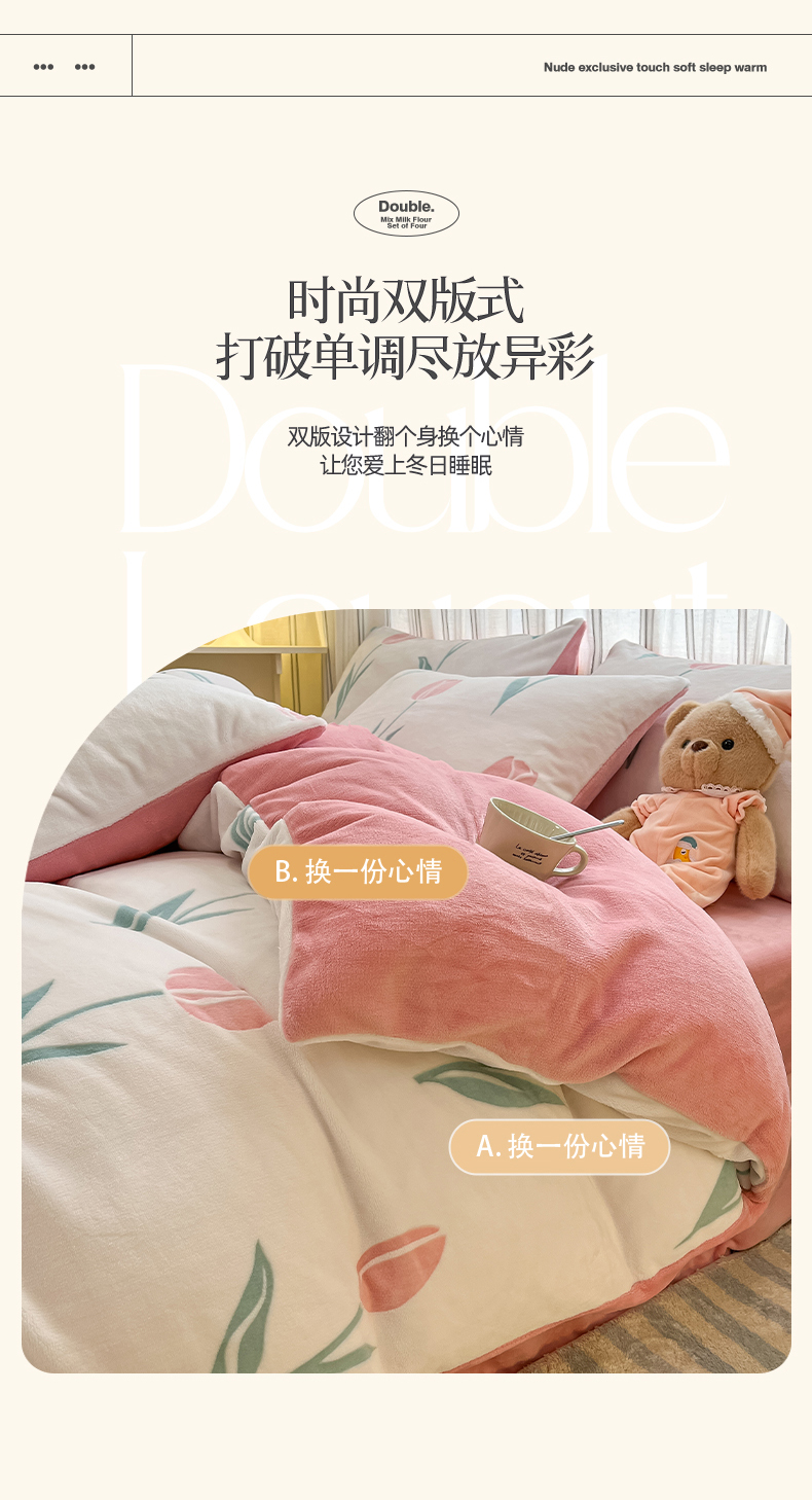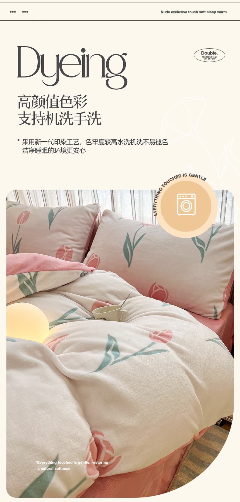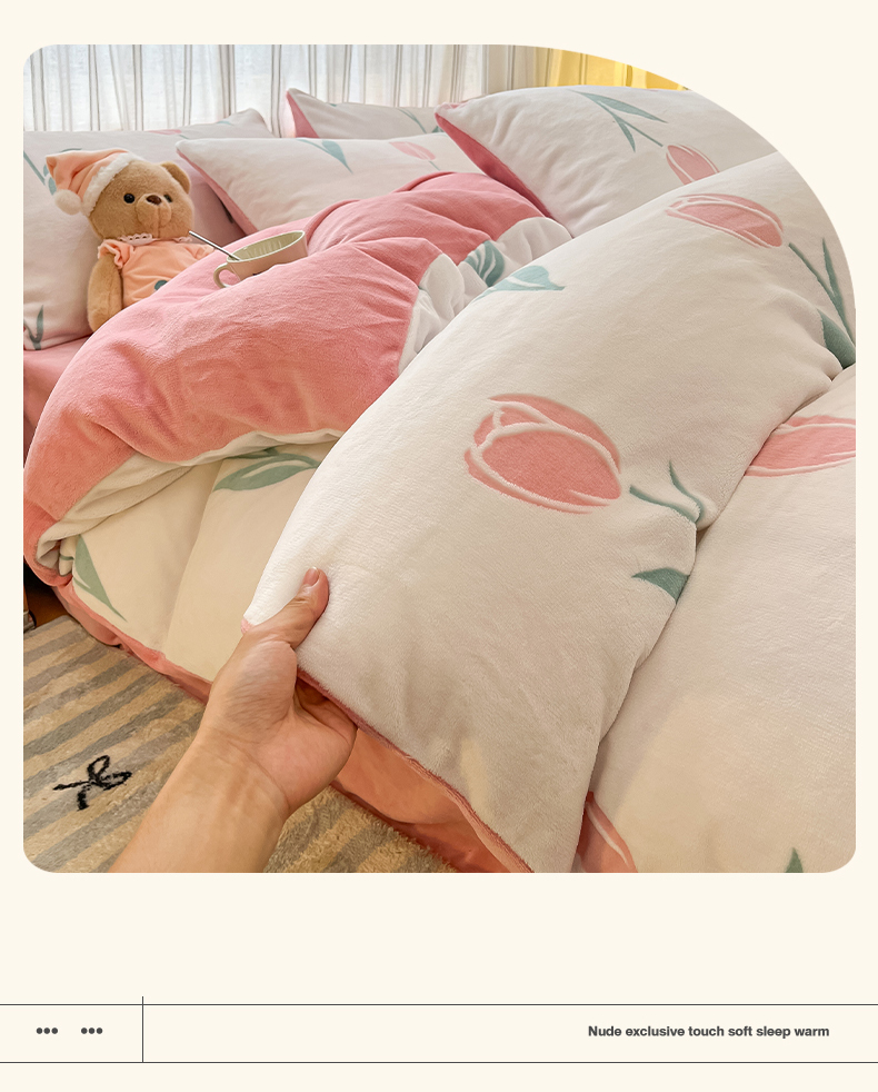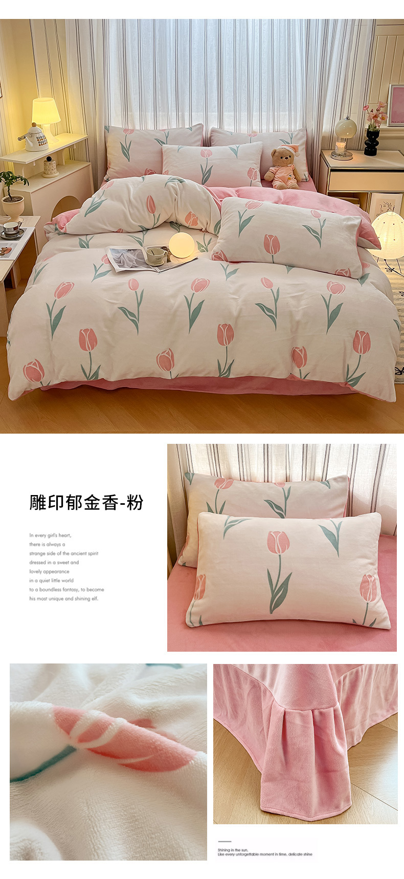 绘萱家居 2025新款高克重雕花雕印纯色牛奶绒四件套双拼法莱绒珊瑚绒 雕印郁金香-粉