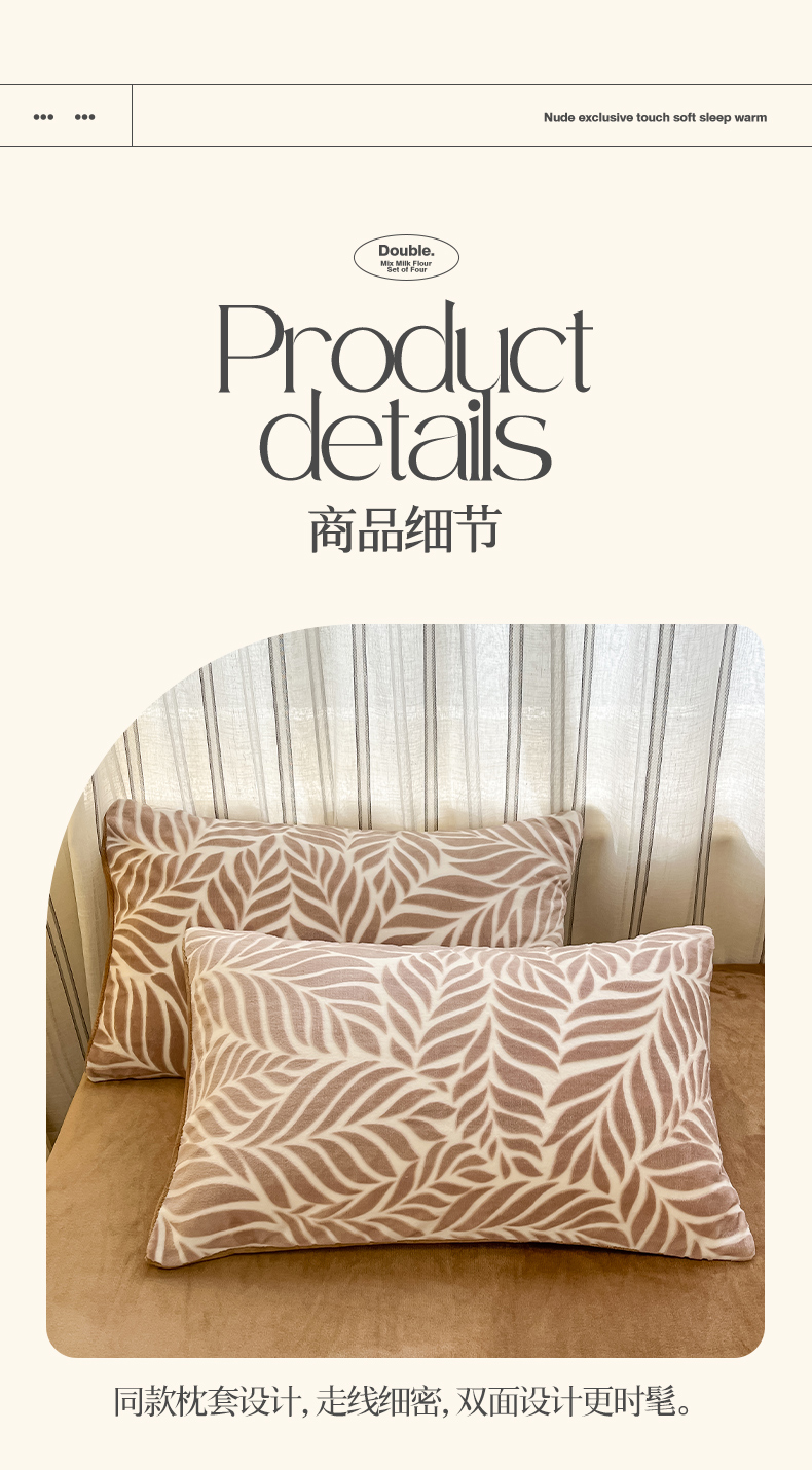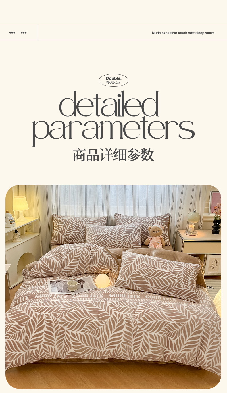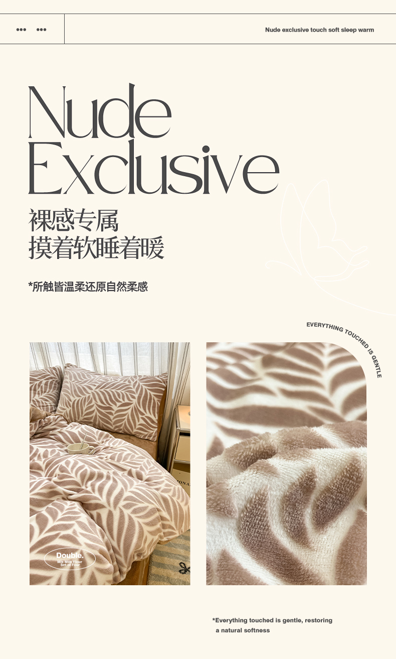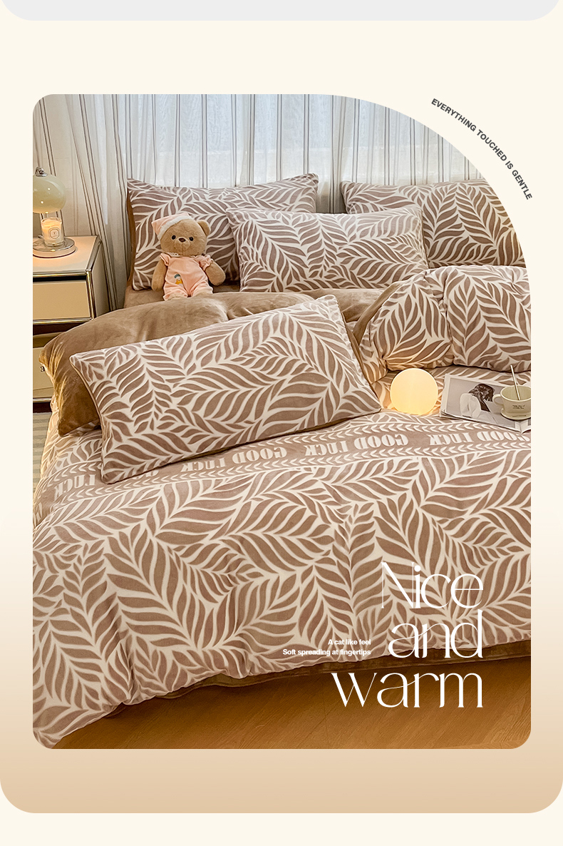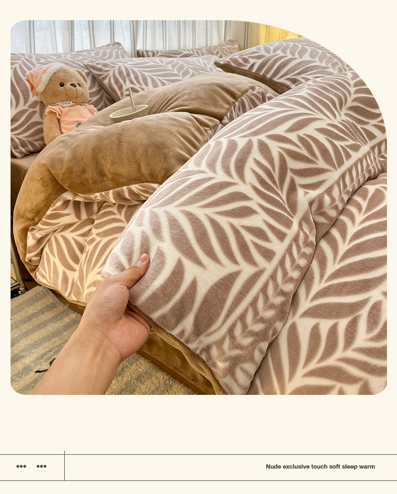 商品名称:绘萱家居 2025新款高克重雕花雕印纯色牛奶绒四件套双拼法莱绒珊瑚绒 叶景-咖