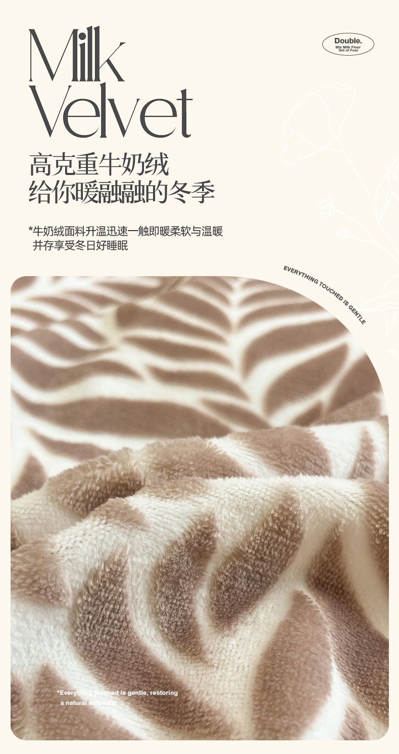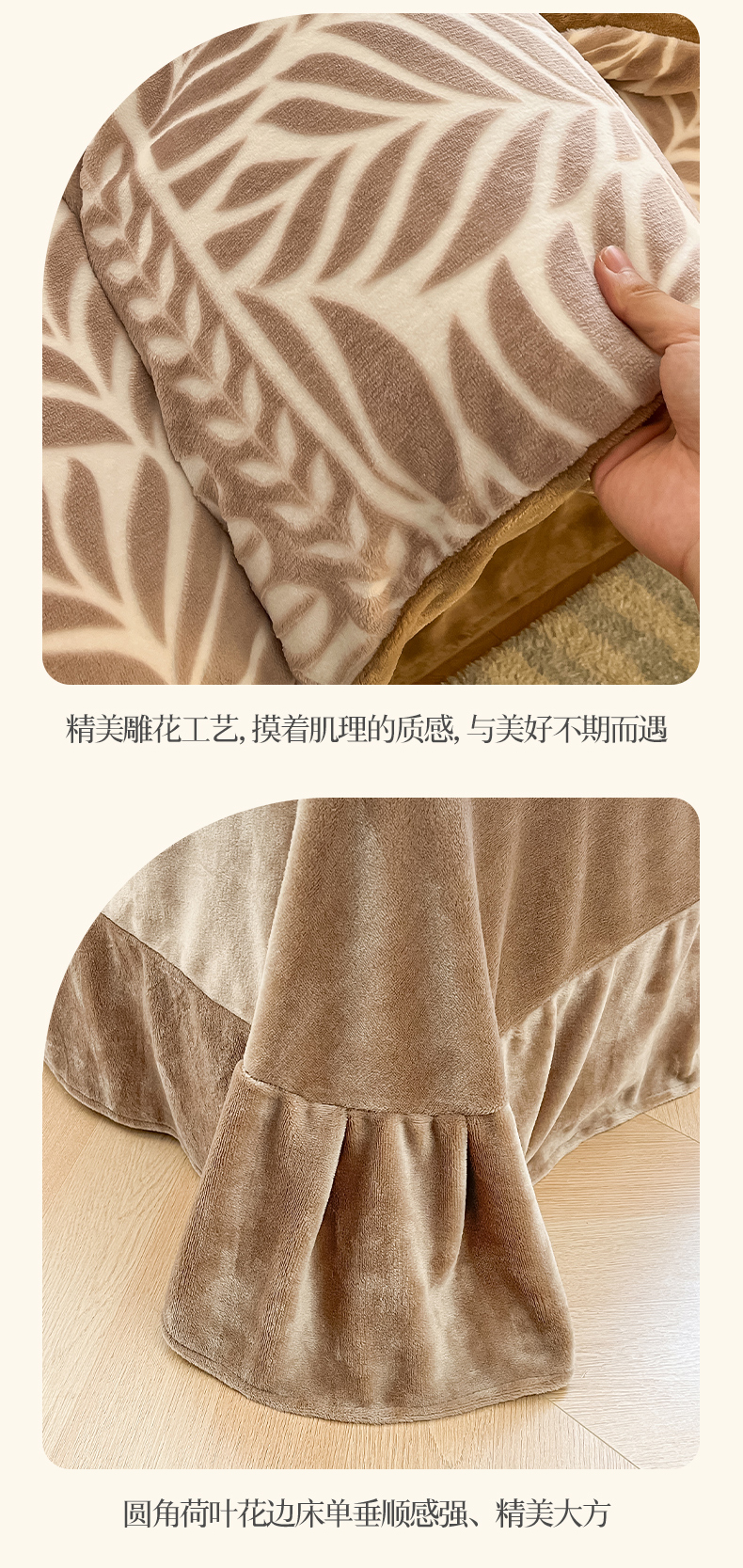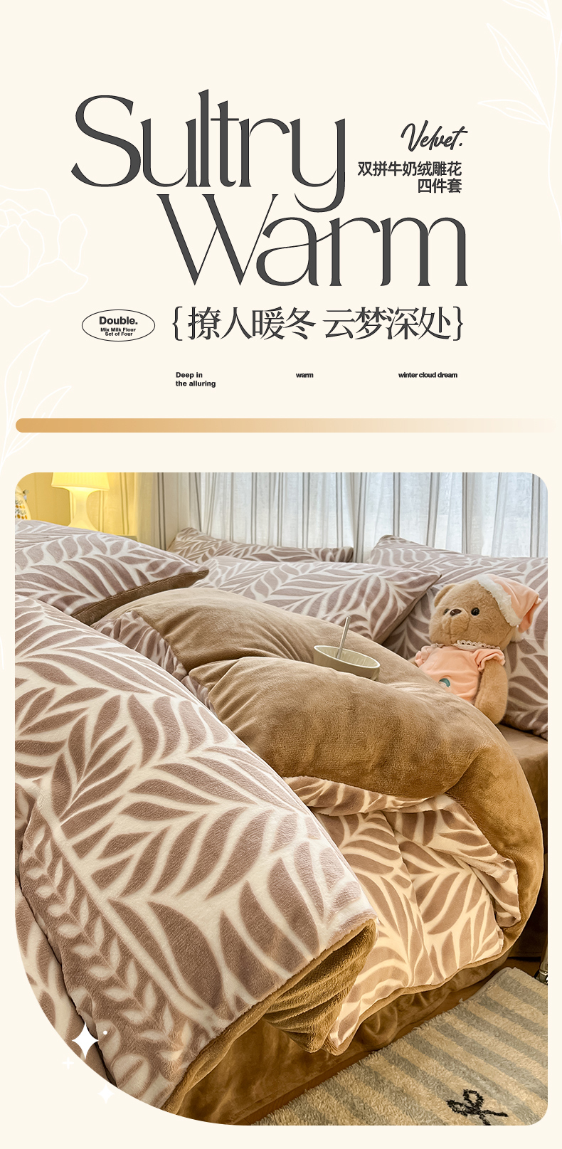 绘萱家居 2025新款高克重雕花雕印纯色牛奶绒四件套双拼法莱绒珊瑚绒 叶景-咖