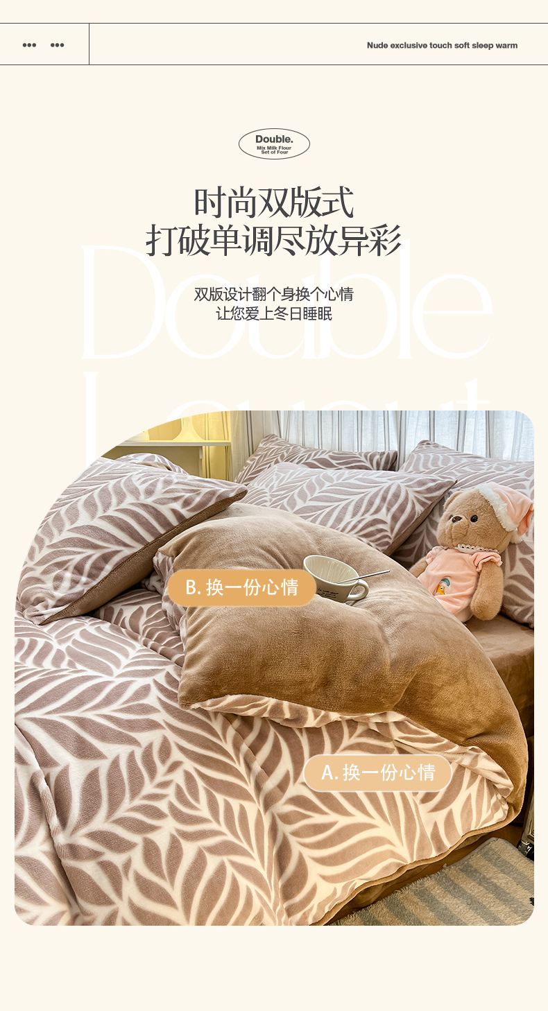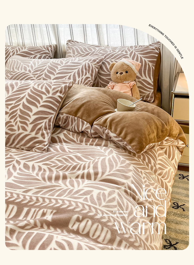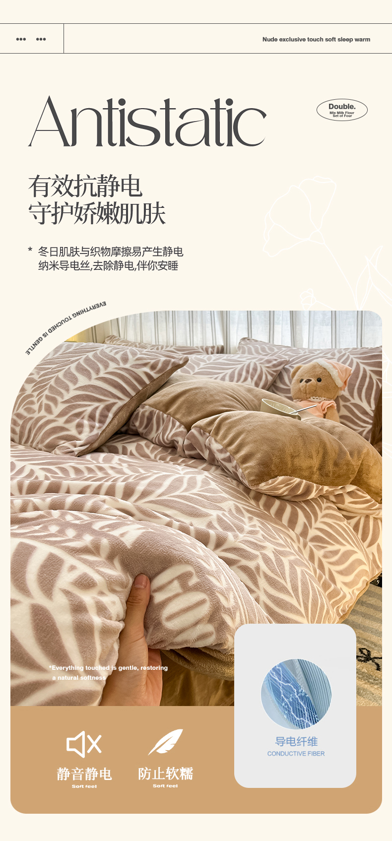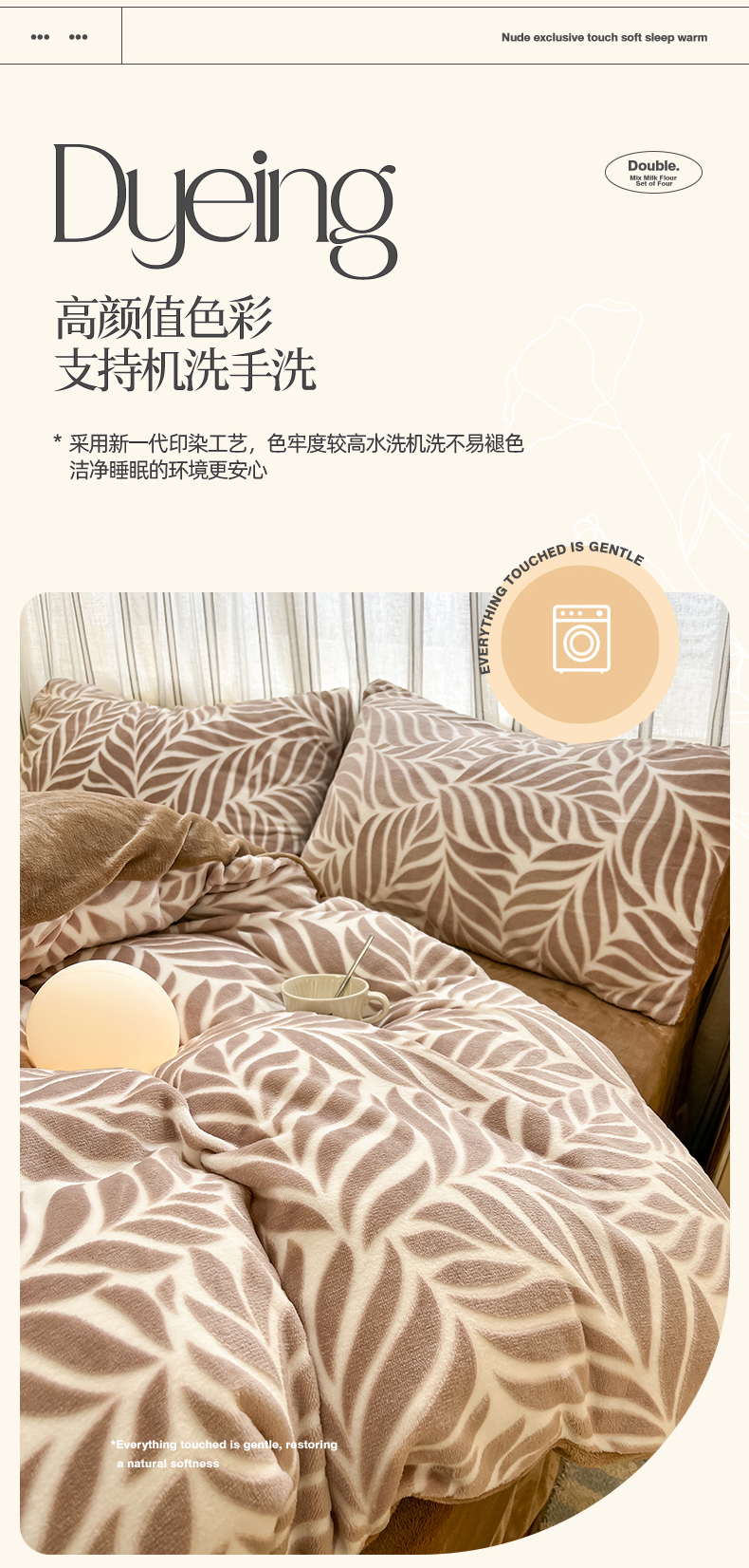 绘萱家居 2025新款高克重雕花雕印纯色牛奶绒四件套双拼法莱绒珊瑚绒 叶景-咖