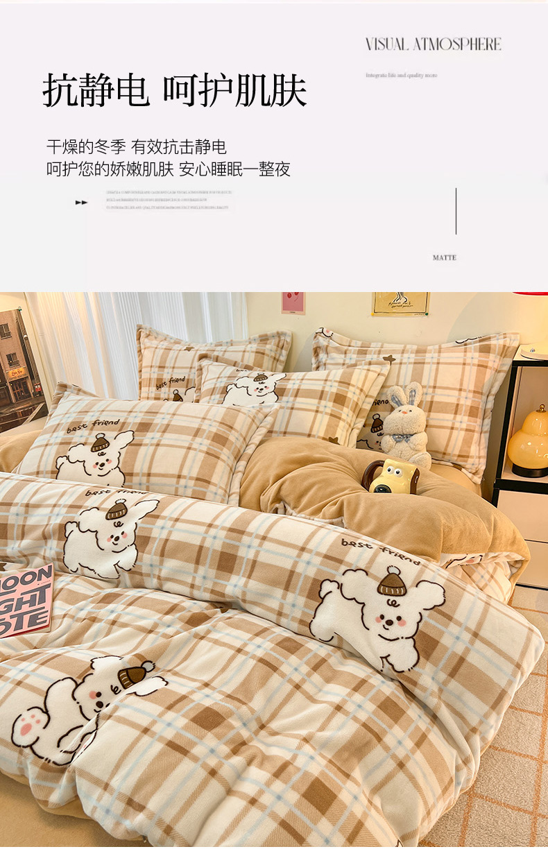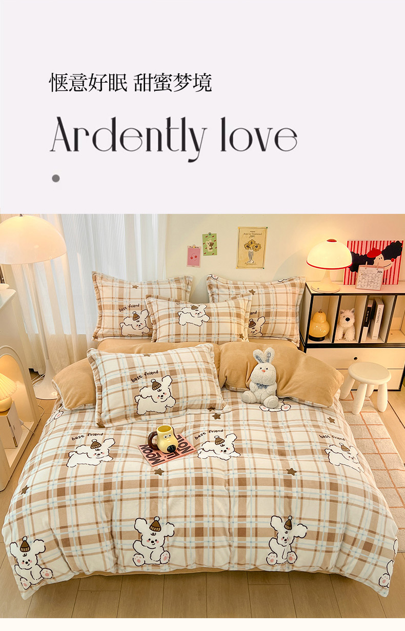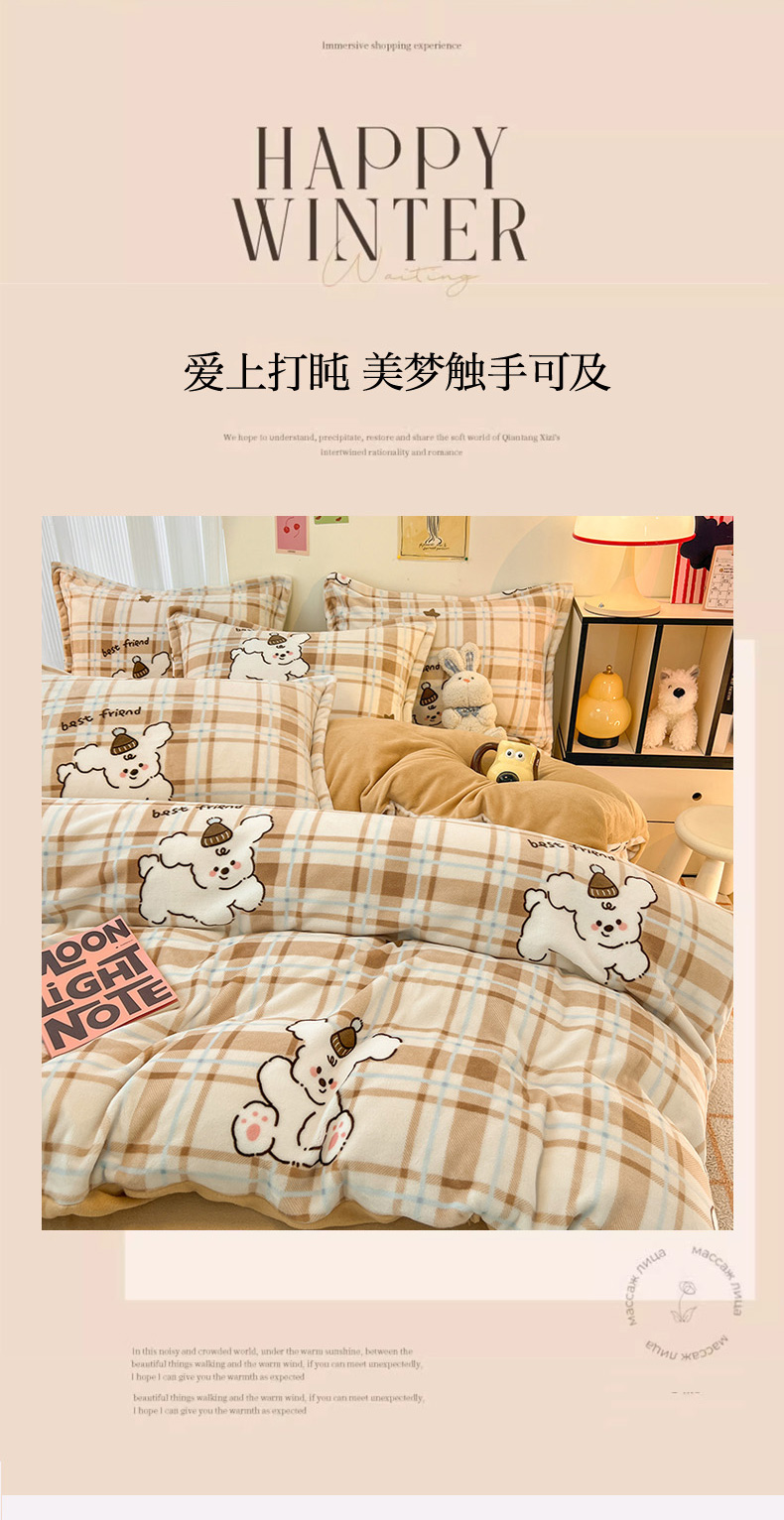 (总)倾慕家纺 2025新款卡通毛巾绣加厚保暖牛奶绒四件套,爱心女孩,咖啡小狗,猫咪熊兔,迷你小车,圣诞树熊,音乐企鹅