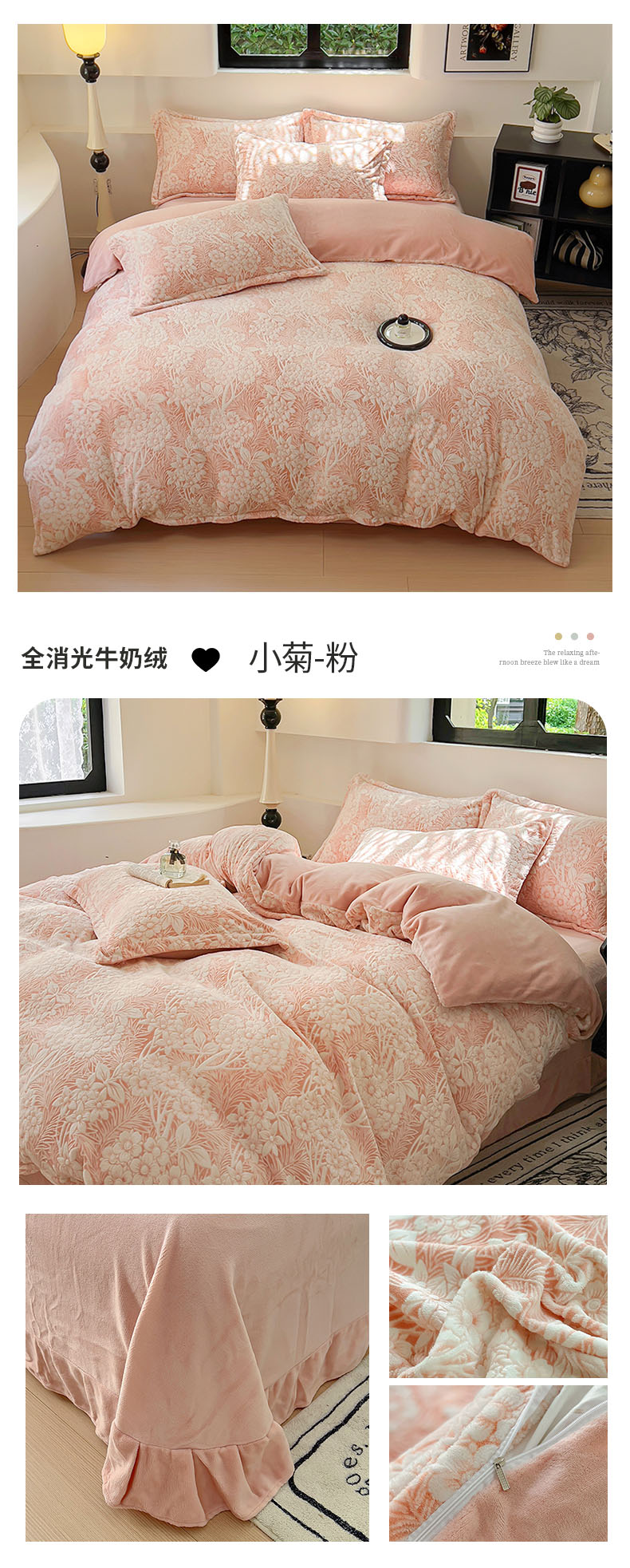 商品名称:新印象 2025新款高克重牛奶绒烂花四件套雕花绒四件套小菊-粉