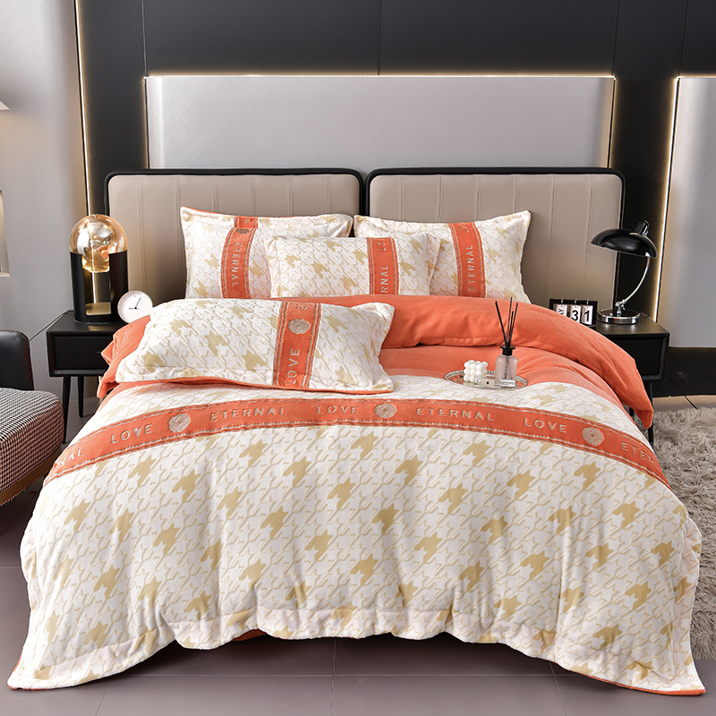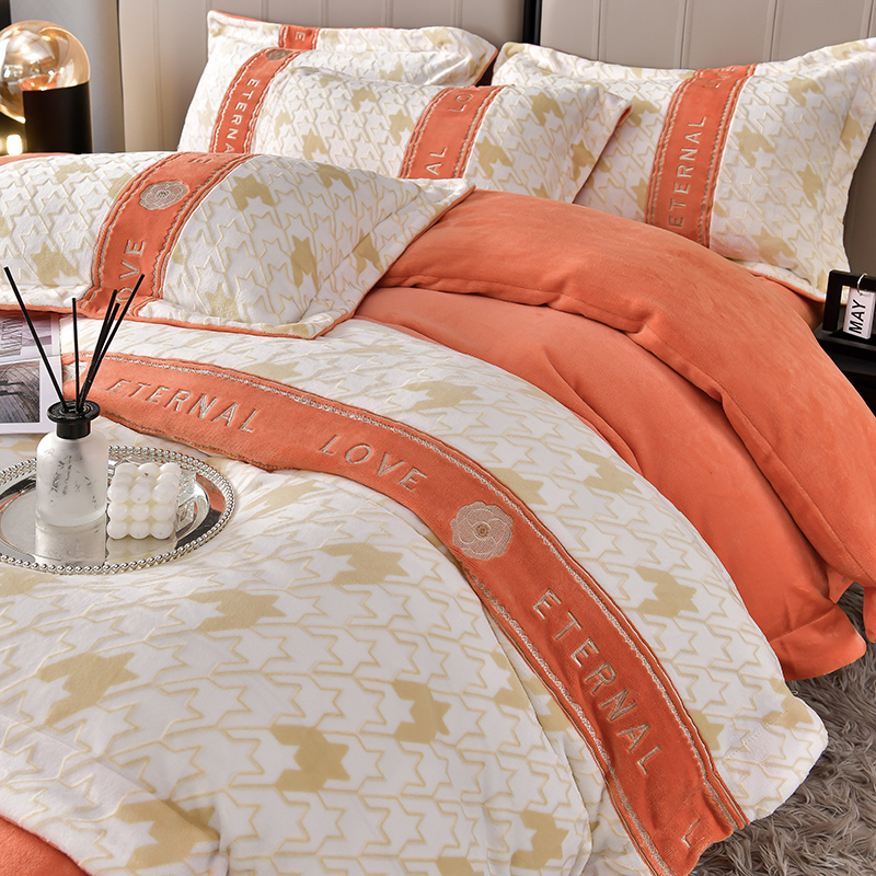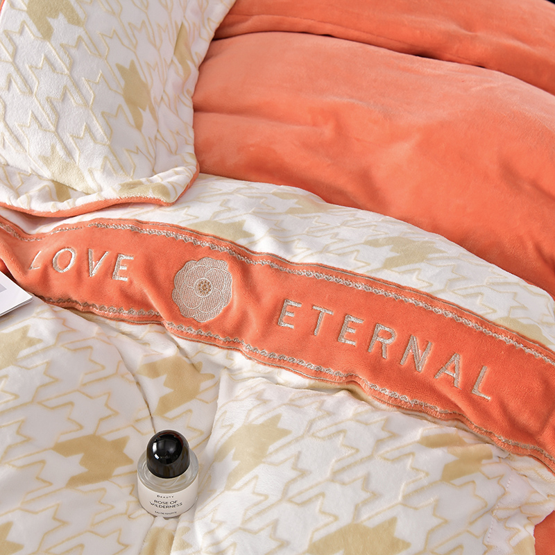 妮恒美 2024新款牛奶绒四件套雕花刺绣千鸟格法莱绒四件套 千鸟格-奶油橘