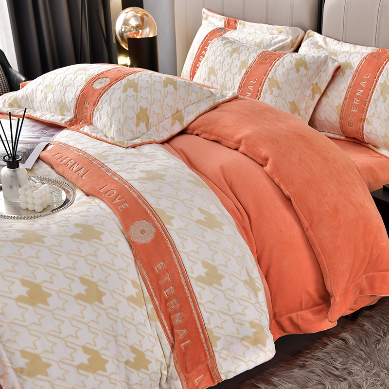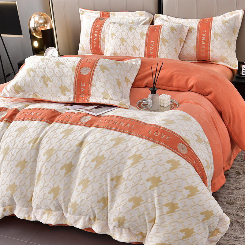 商品名称:妮恒美 2024新款牛奶绒四件套雕花刺绣千鸟格法莱绒四件套 千鸟格-奶油橘