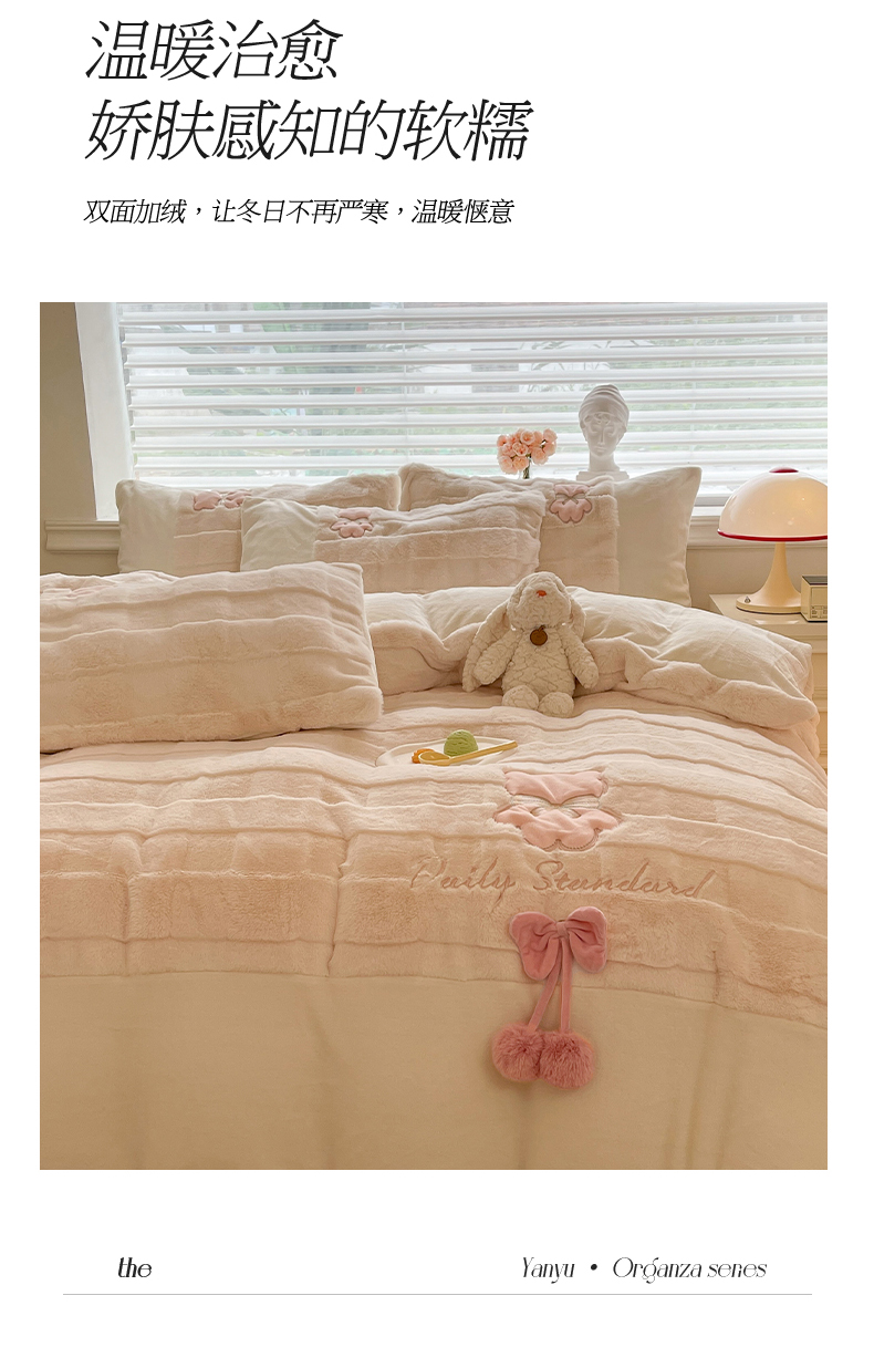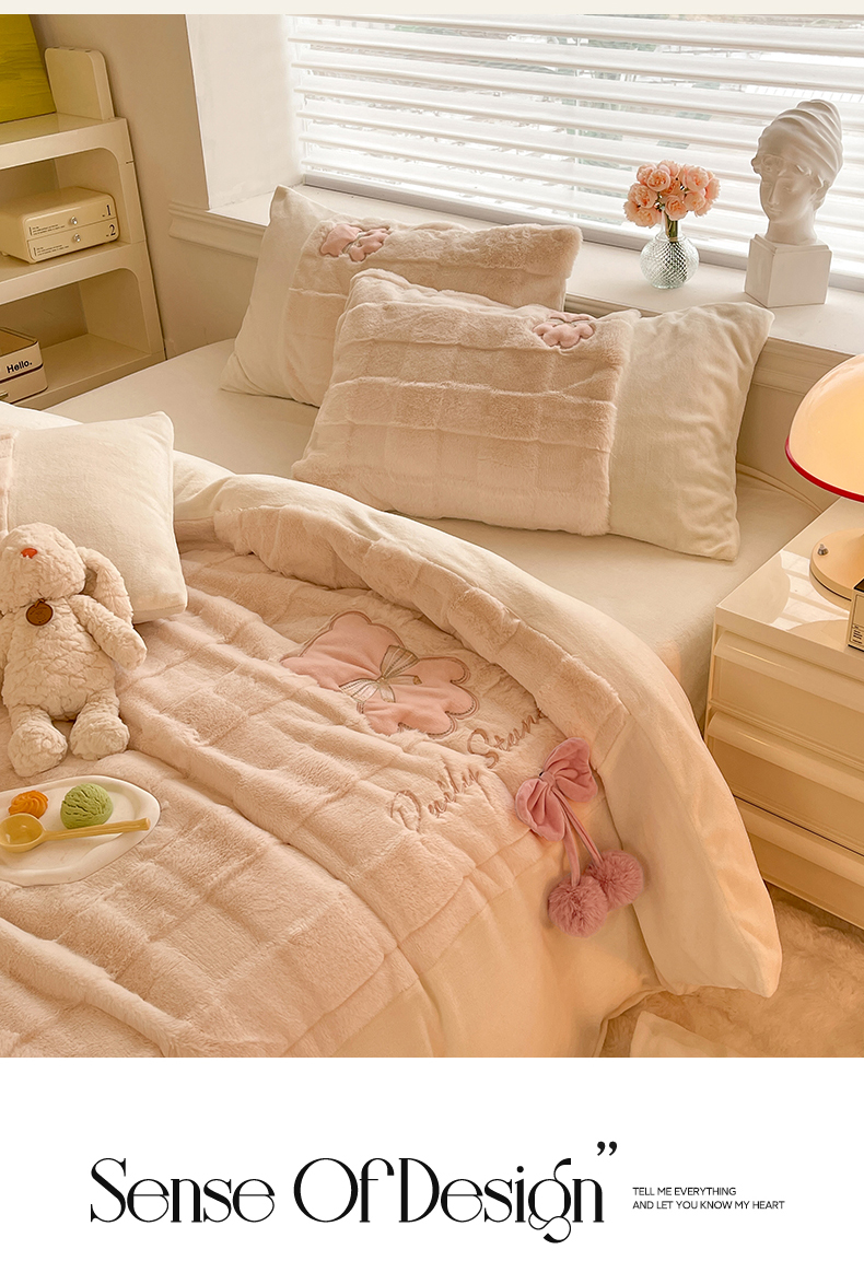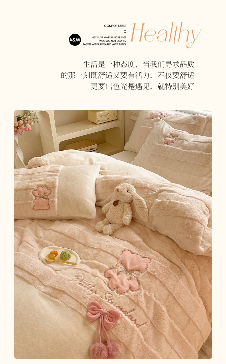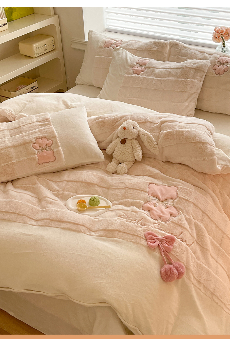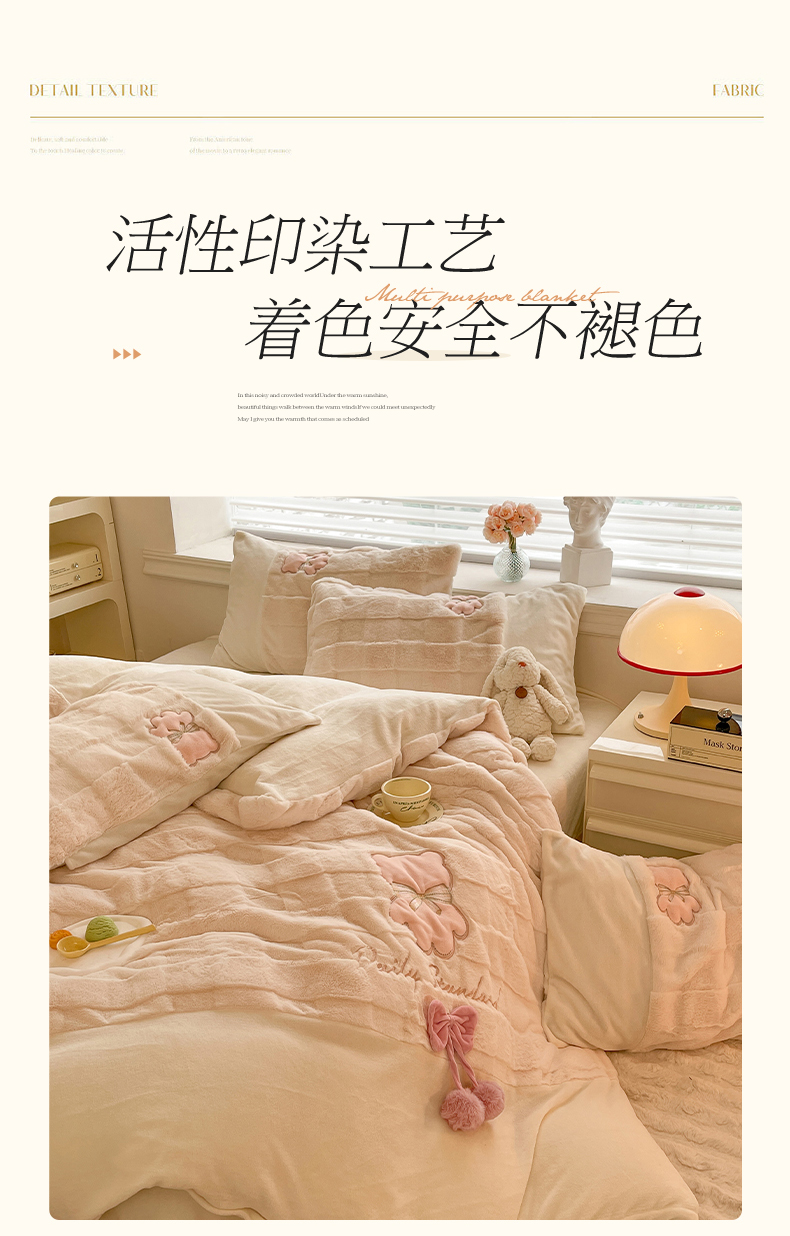 当前位置: 91家纺网 > 商品网购 > 床品套件 > 四件套 > 全棉普通四件套 > 绒棉世家 2025新款A类獭兔毛高端兔兔绒工艺款四件套-小熊系列 蝴蝶小熊-玉色