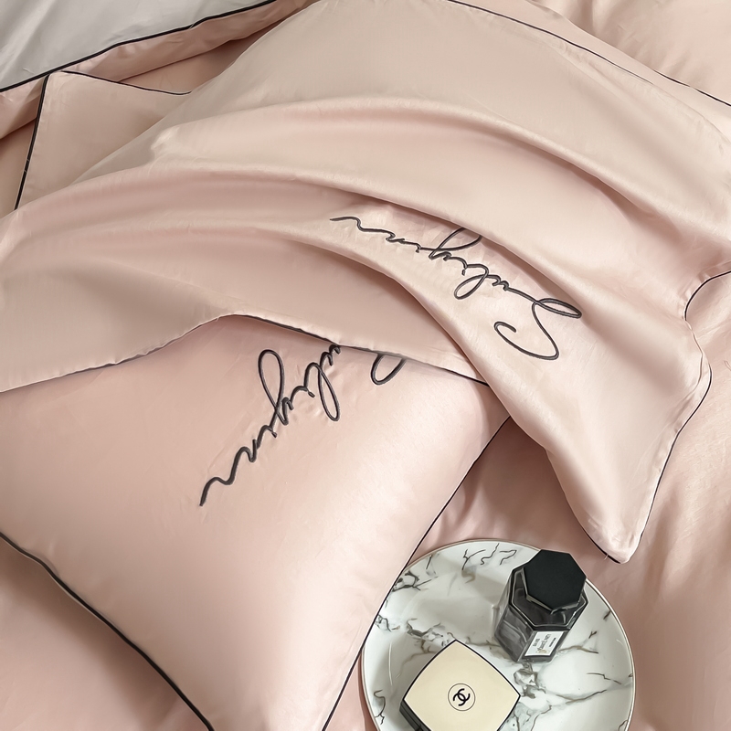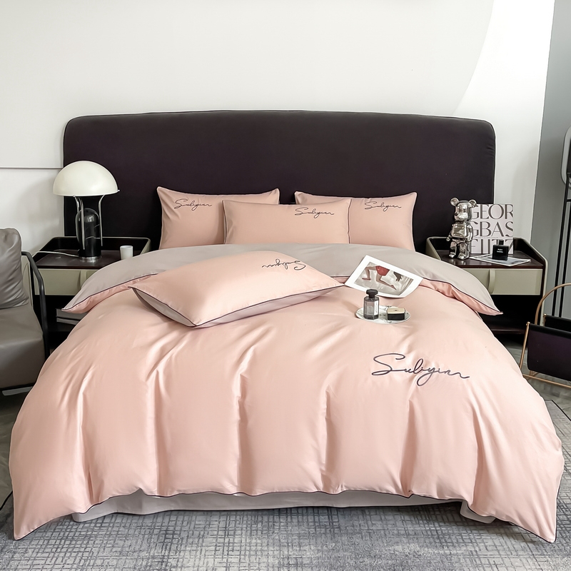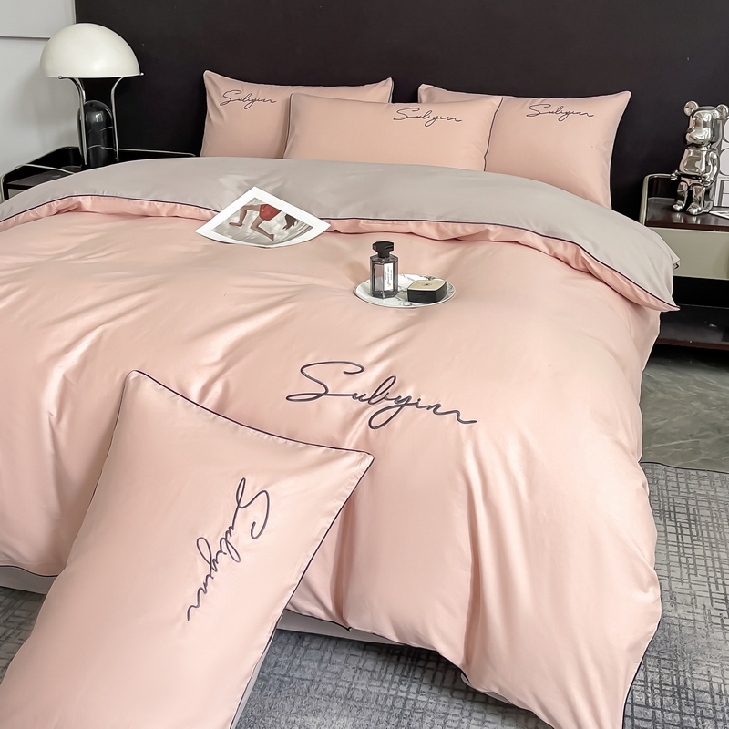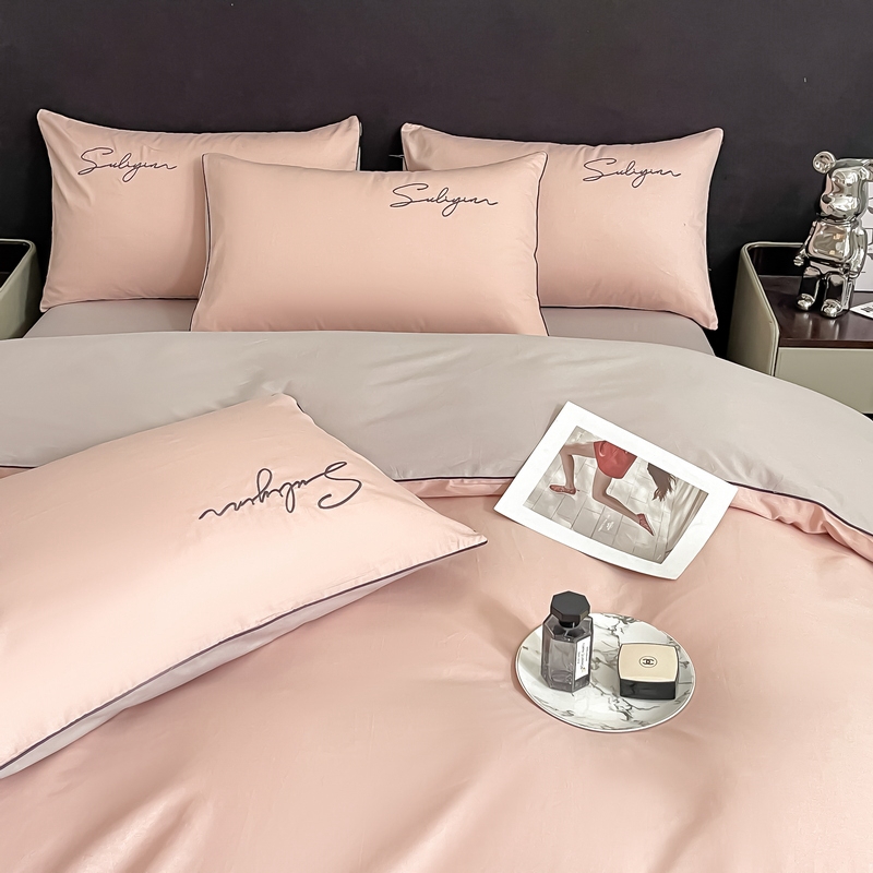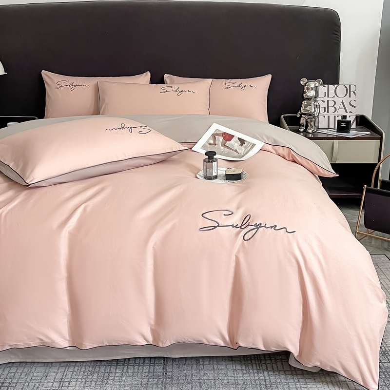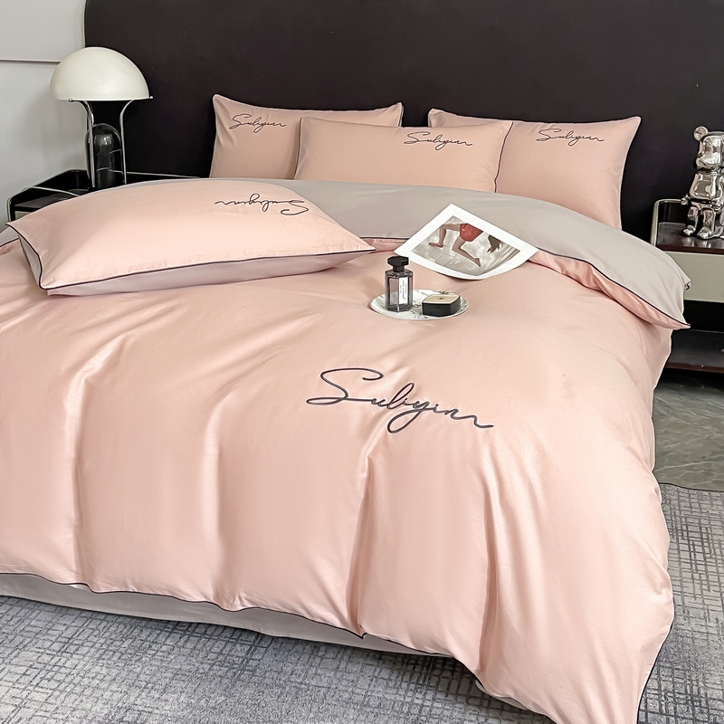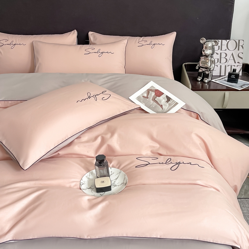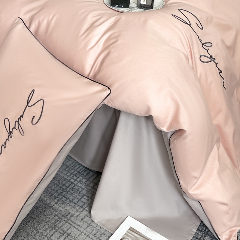 法莱妮毛毯 2025新款轻奢13372喷气纯色百分百纯棉全棉刺绣麻绳四件套 玫瑰粉+浅灰