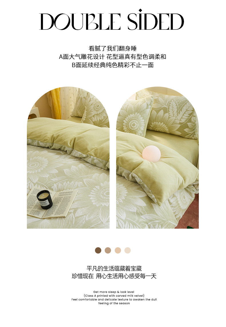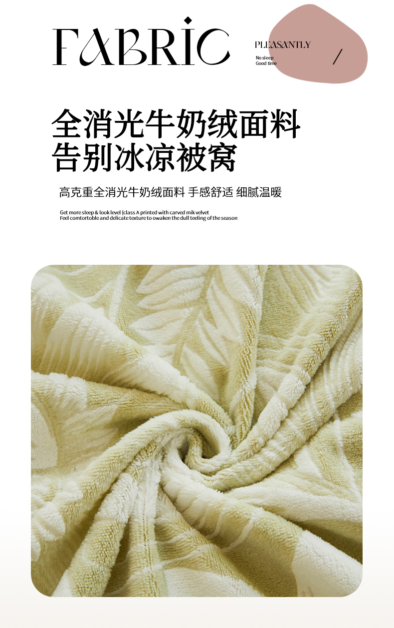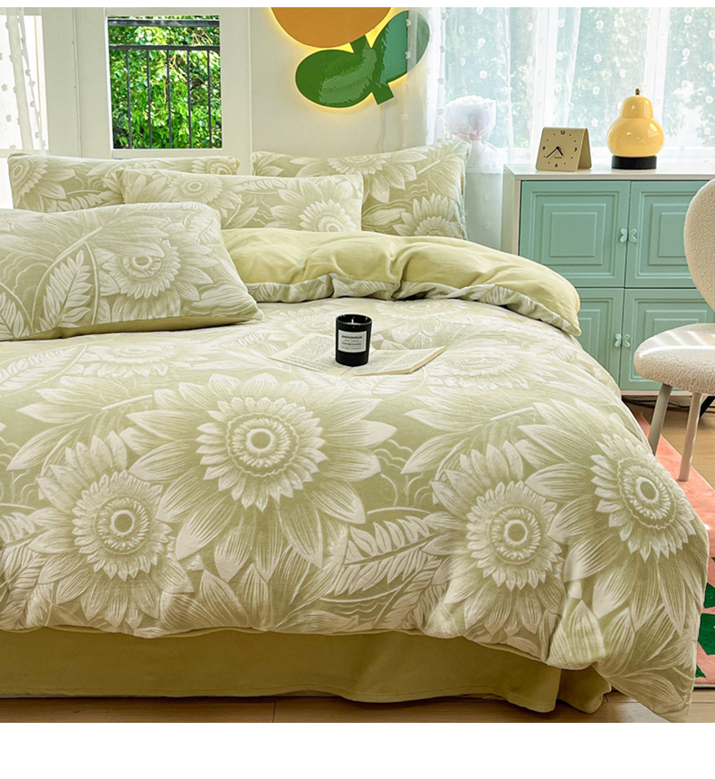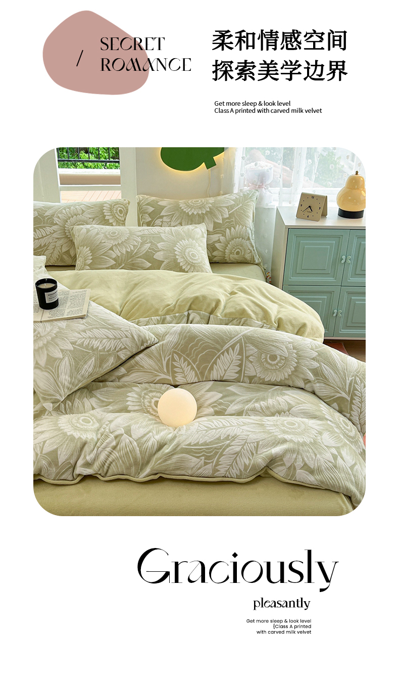 当前位置: 91家纺网 > 商品网购 > 床品套件 > 四件套 > 牛奶绒四件套 > 菡宝 2024新款雕花绒230g全消光牛奶绒四件套及单品 - 四件套 花开向阳茶绿