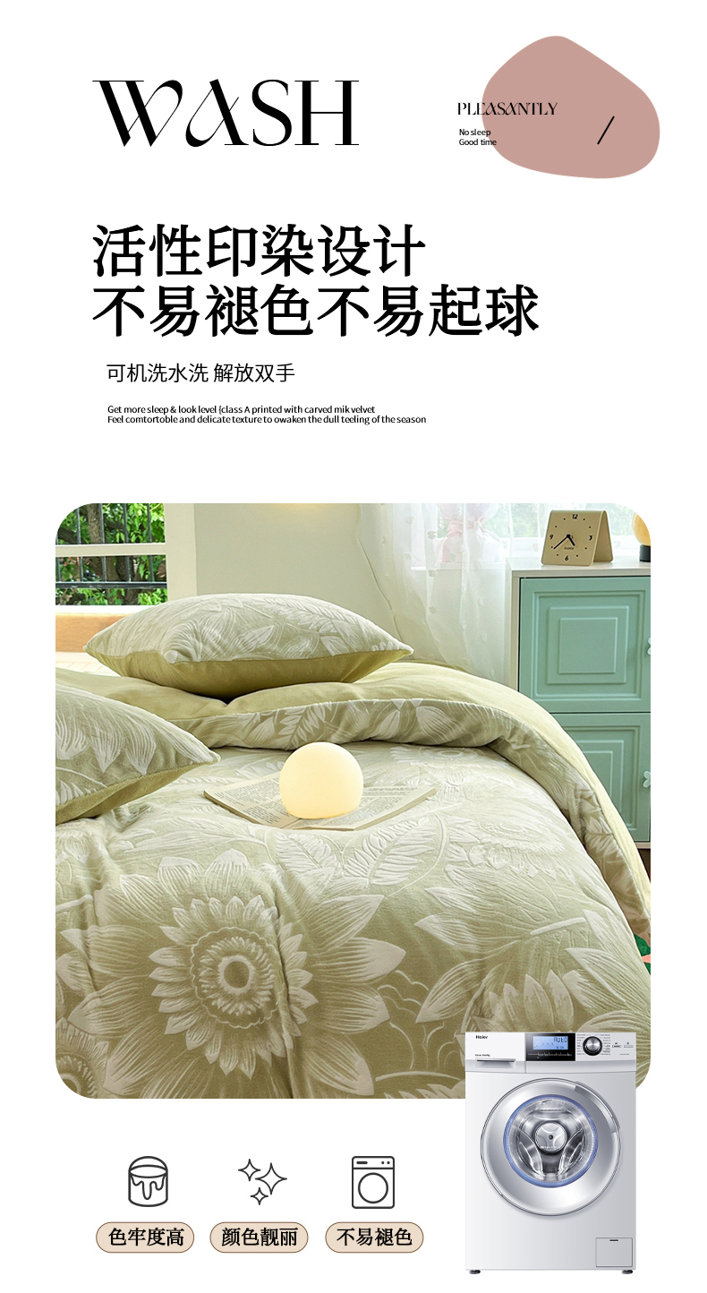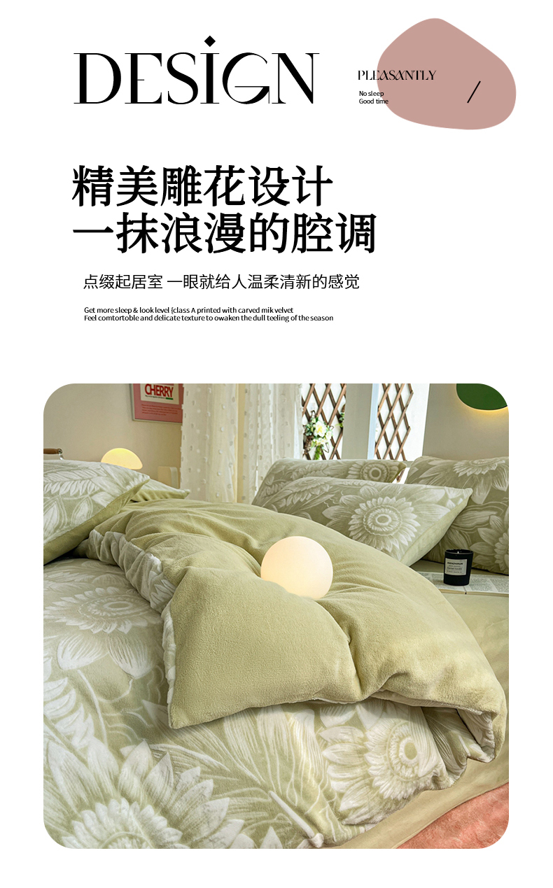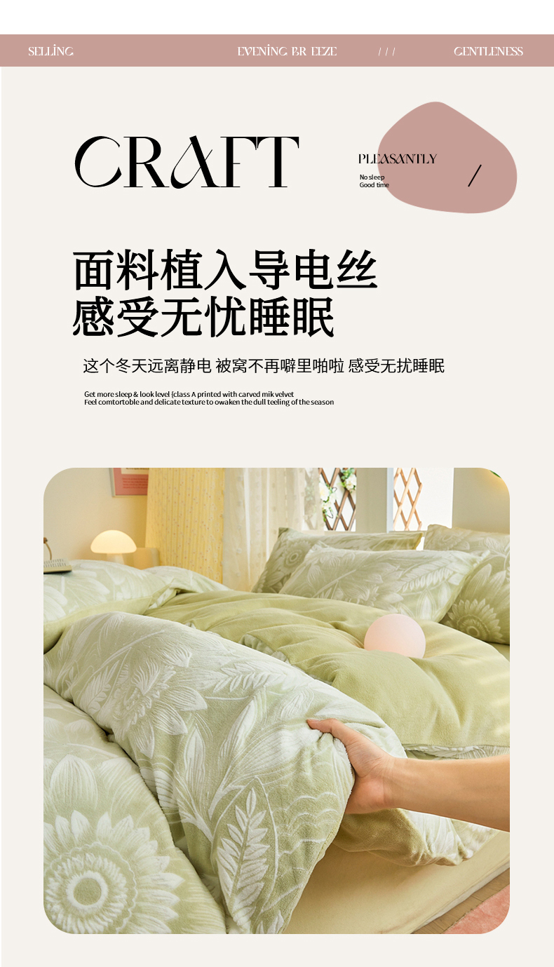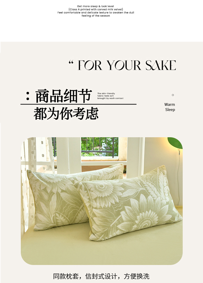 当前位置: 91家纺网 > 商品网购 > 床品套件 > 四件套 > 牛奶绒四件套 > 菡宝 2024新款雕花绒230g全消光牛奶绒四件套及单品 - 四件套 花开向阳茶绿