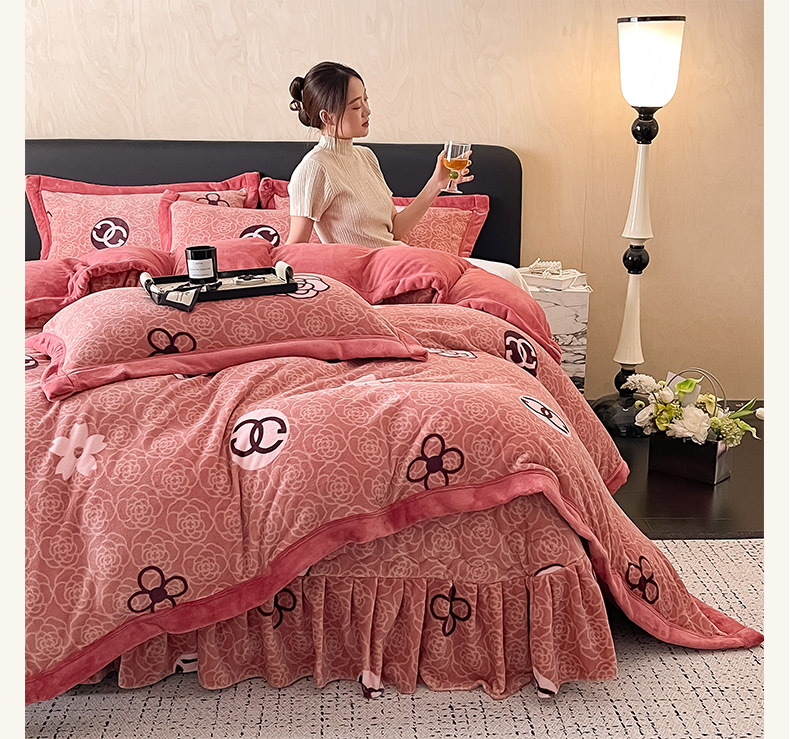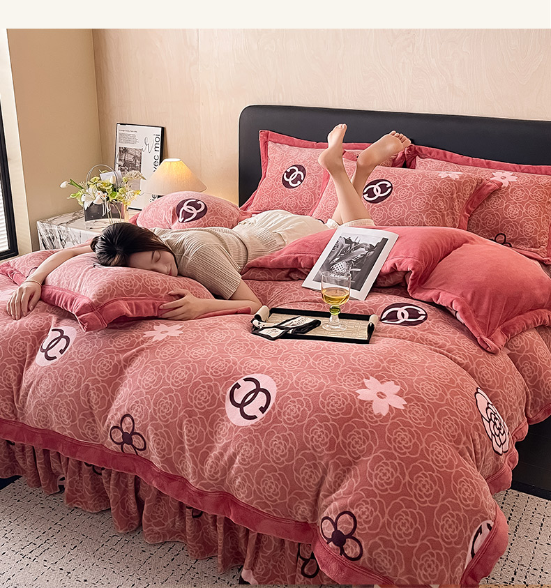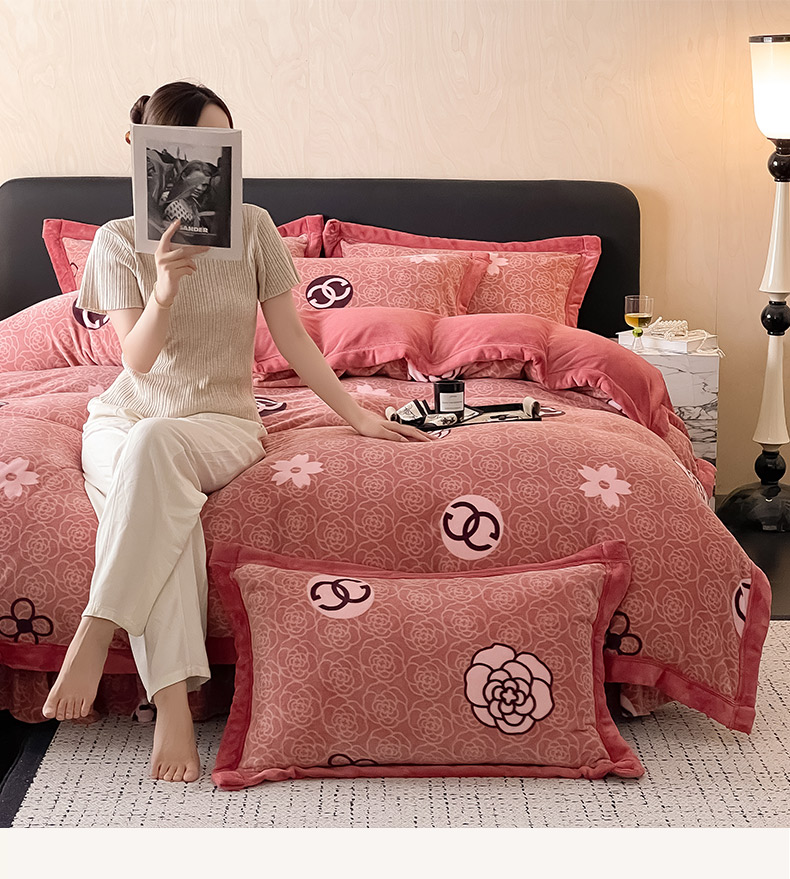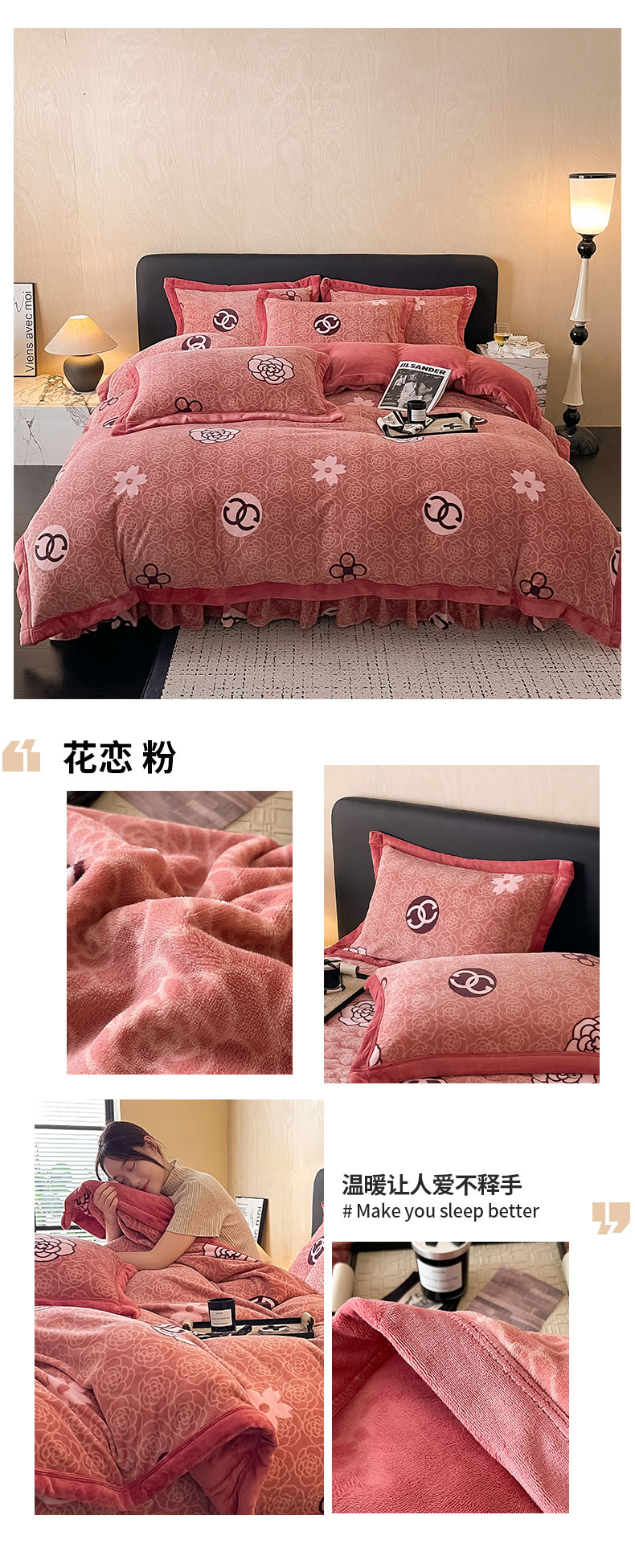 茉保家纺 2024新款包边款印花牛奶绒床盖四件套 花恋 粉