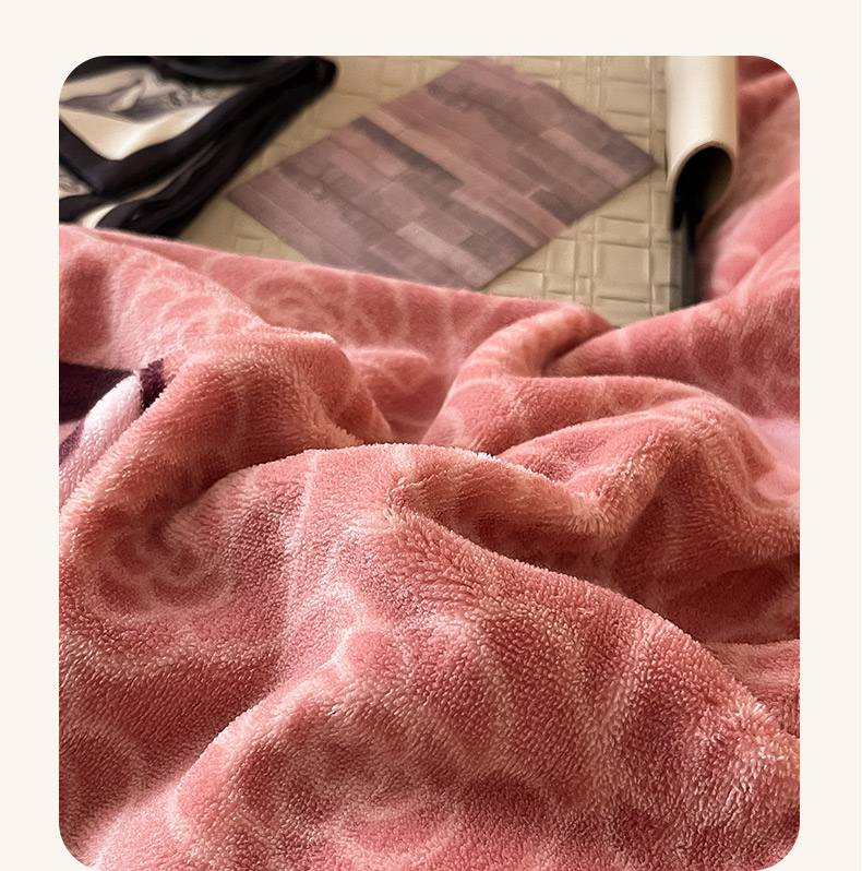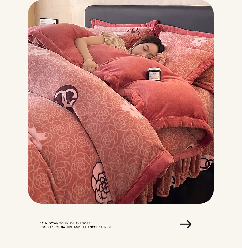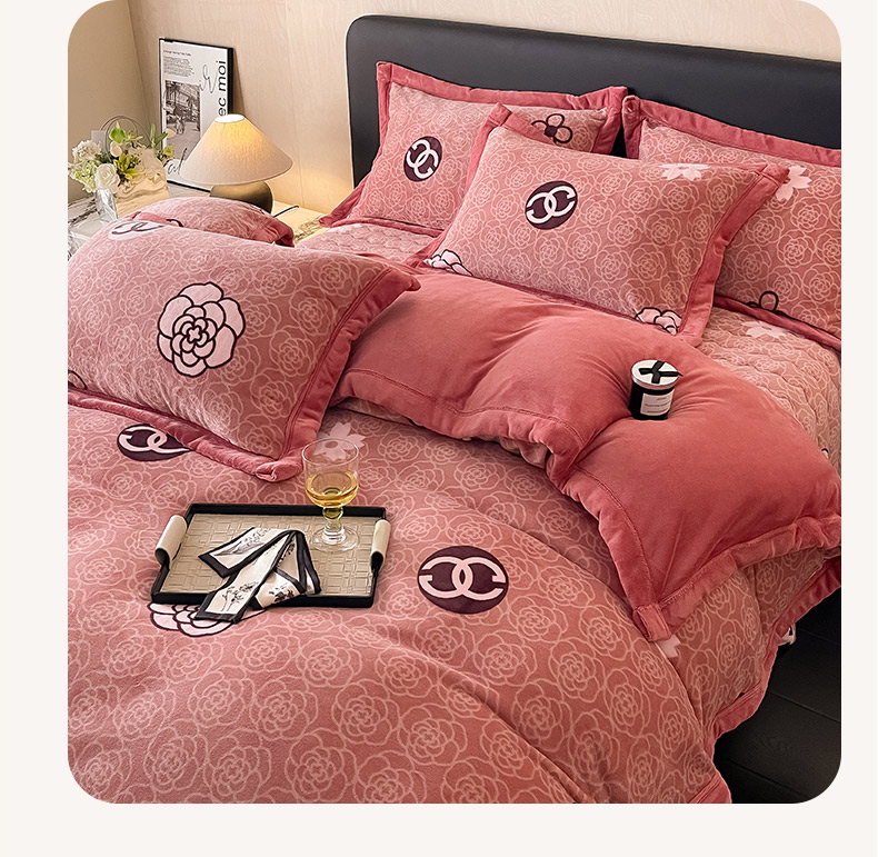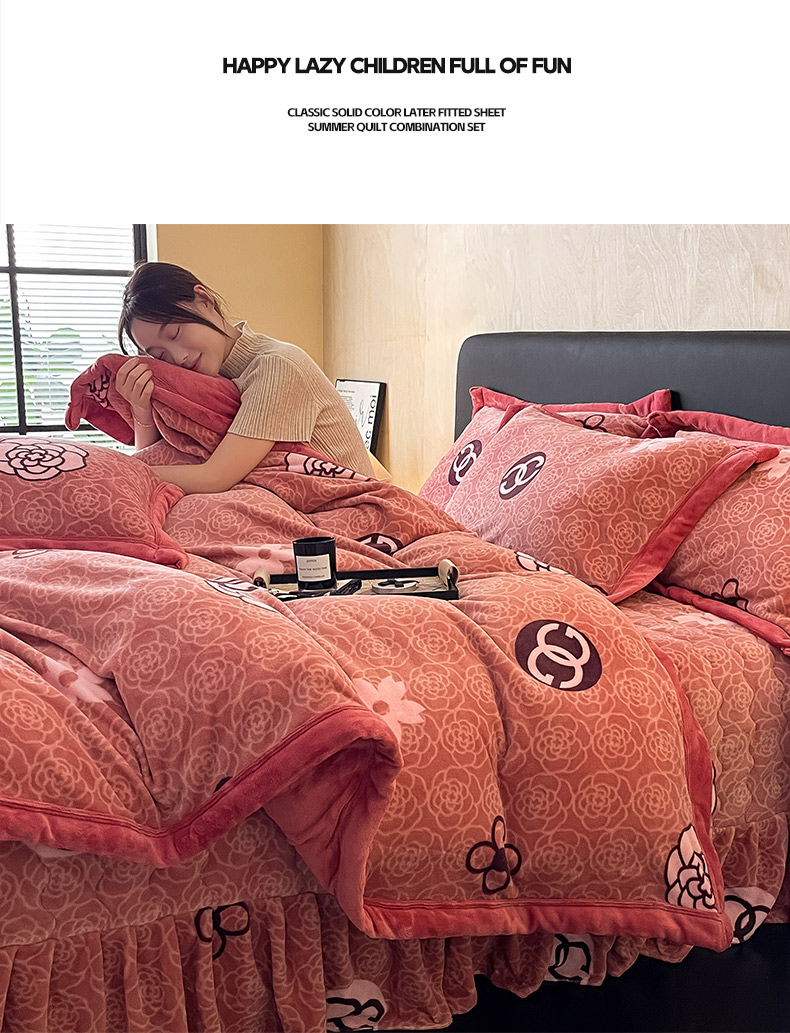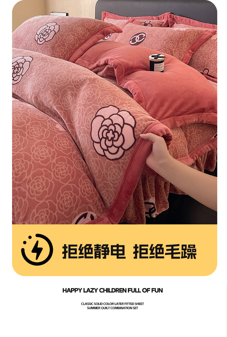 茉保家纺 2024新款包边款印花牛奶绒床盖四件套 花恋 粉