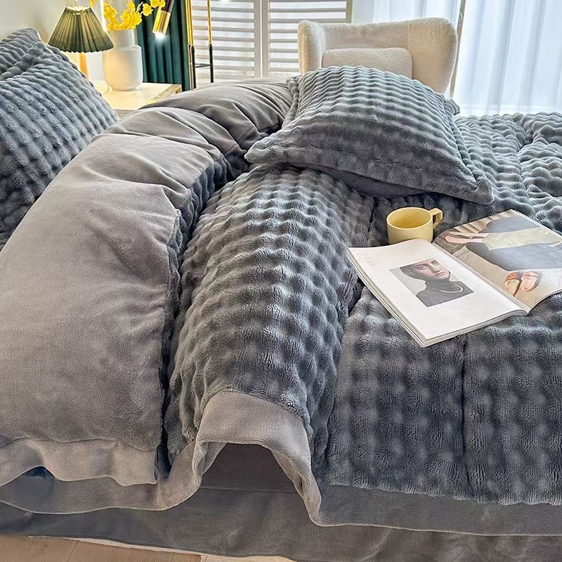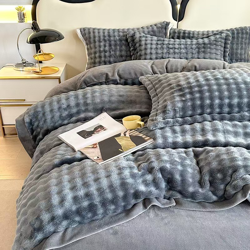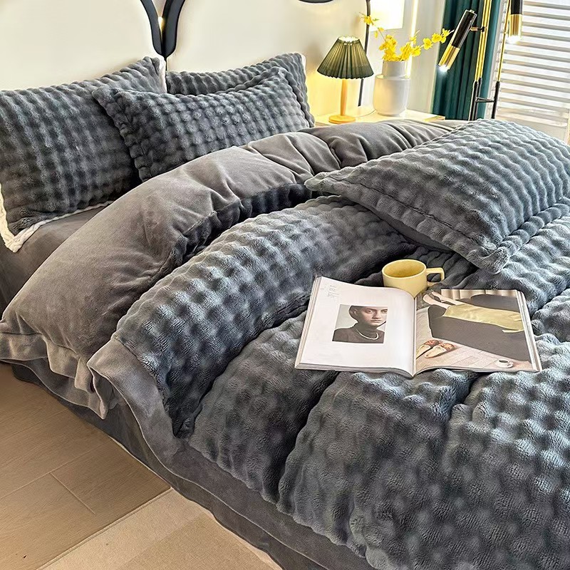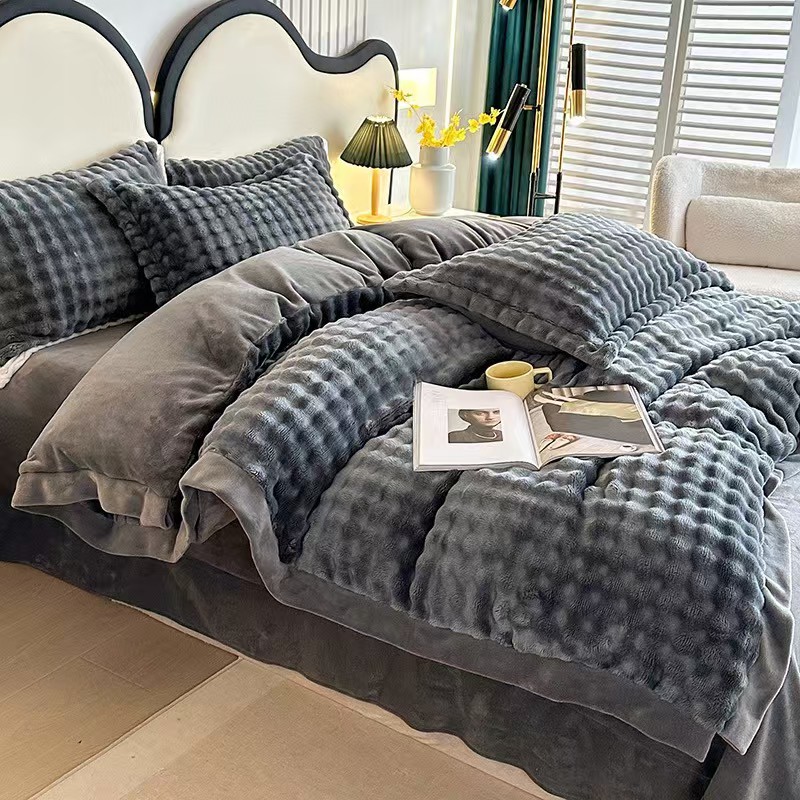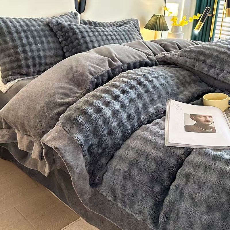 玖琳家纺 2024新款A类大泡泡懒兔毛绒+牛奶绒四件套 灰色