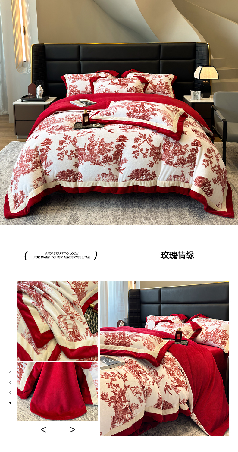 商品名称:凡客家居 2024新款高克重牛奶绒数码印花双拼角四件套 玫瑰情缘