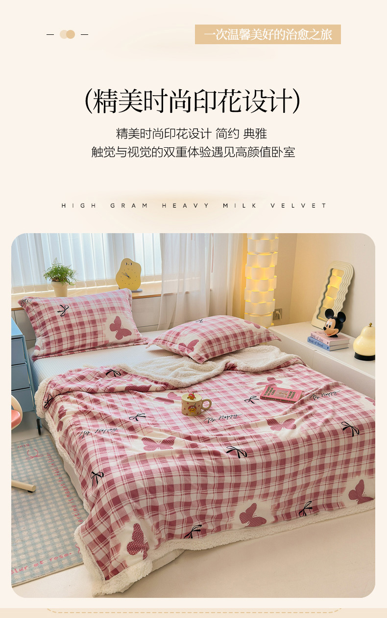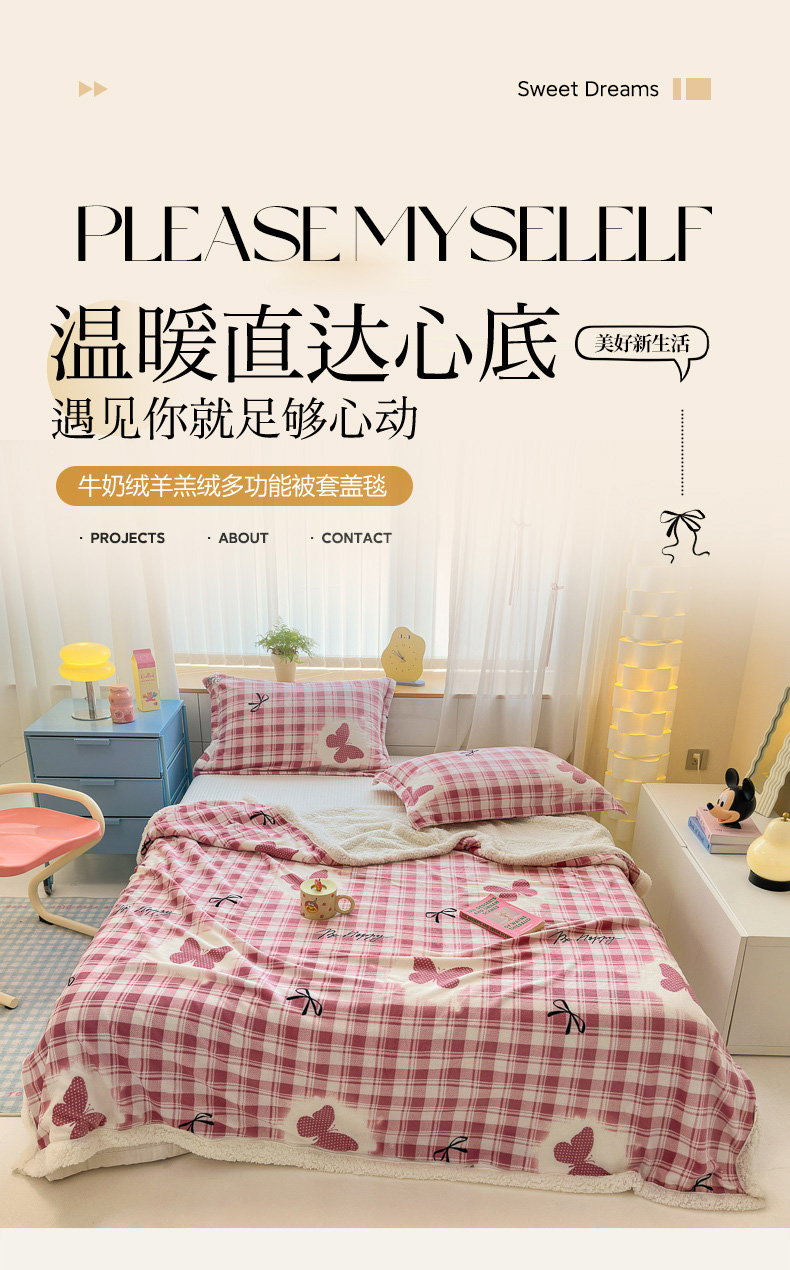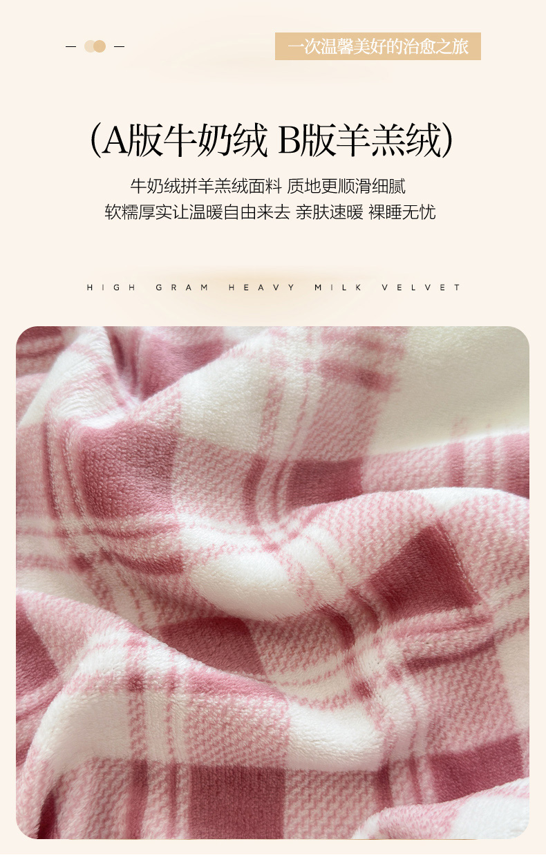 花伞家居 2024直播新款牛奶绒羊羔绒多功能复合拉链被套款毛毯 毛毯-粉格子蝴蝶