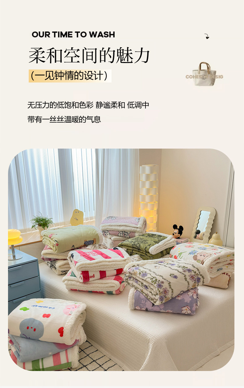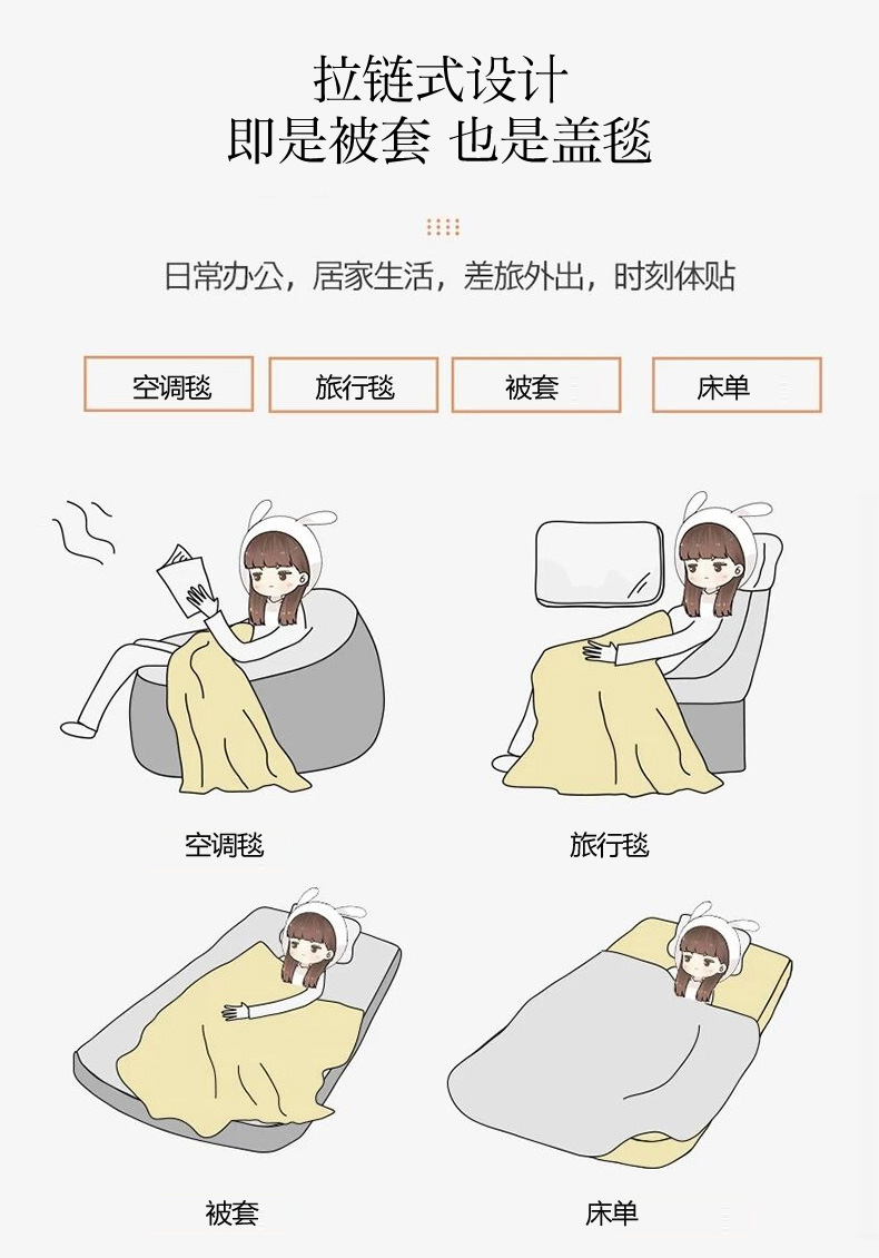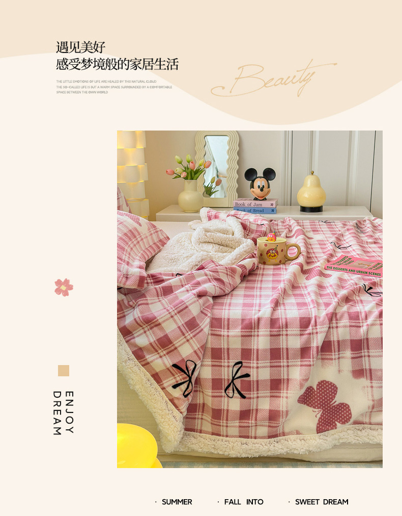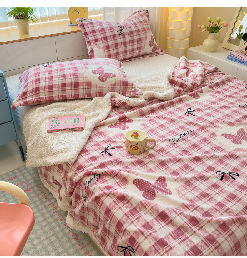 花伞家居 2024直播新款牛奶绒羊羔绒多功能复合拉链被套款毛毯 毛毯-粉格子蝴蝶