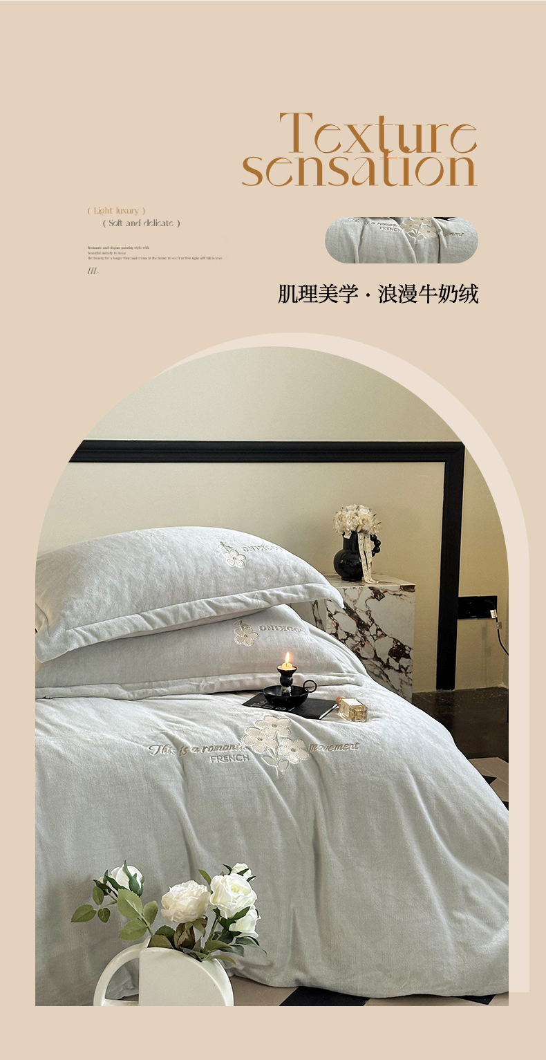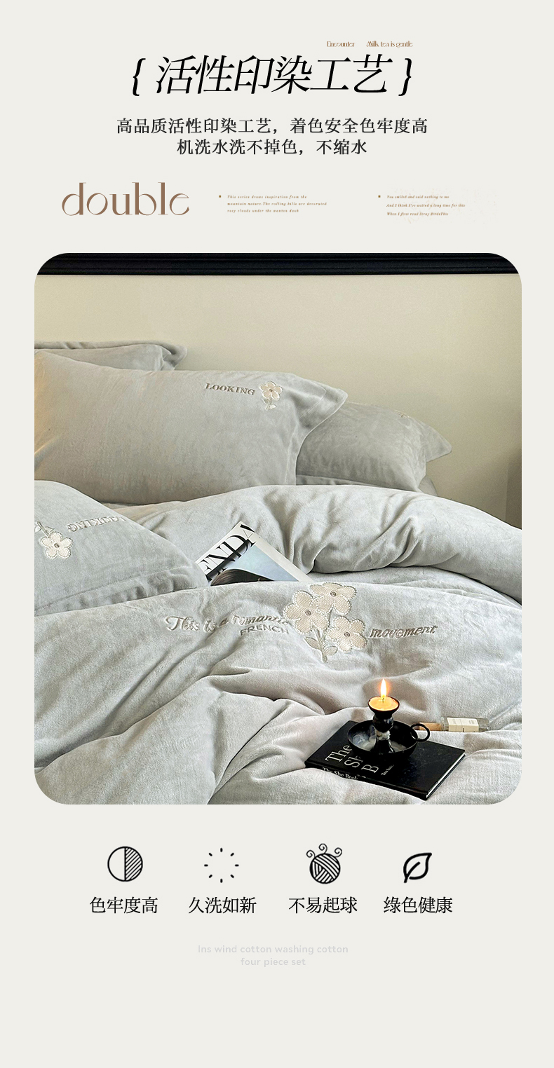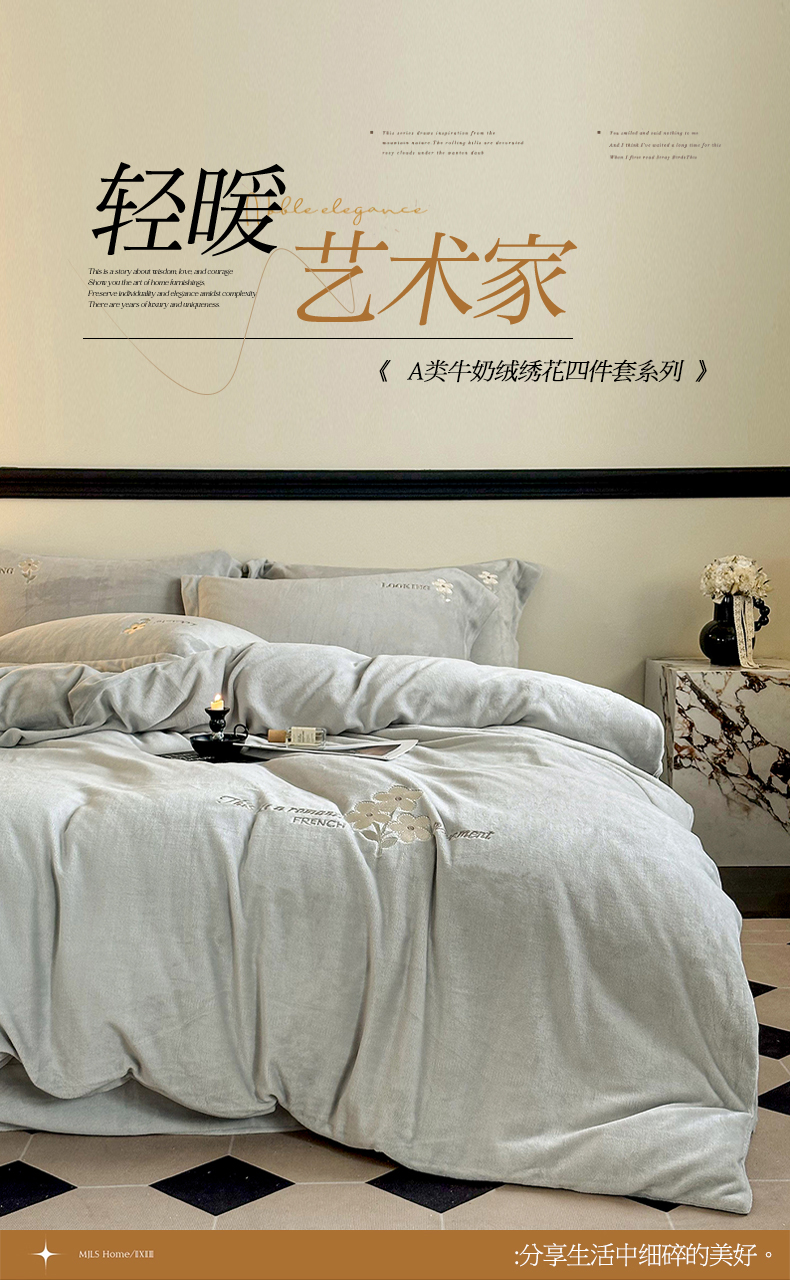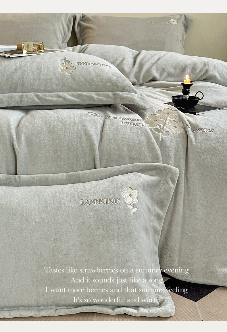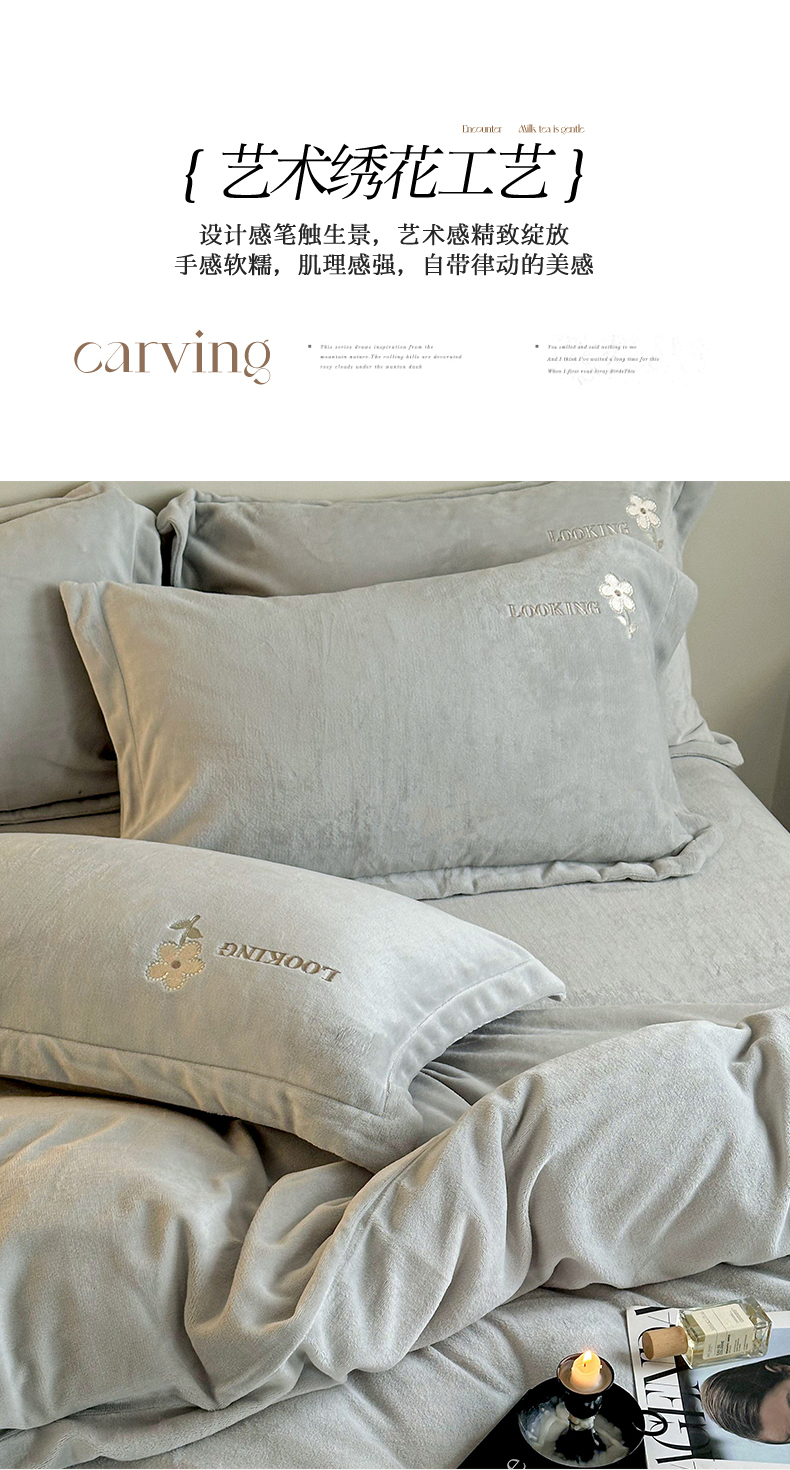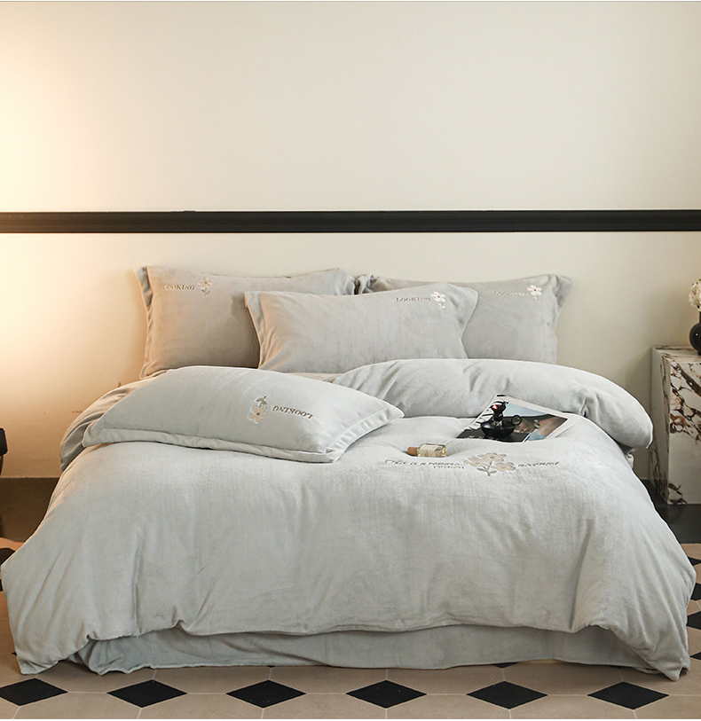 商品名称:泽西家纺 2024秋冬新款加厚保暖A类小清新刺绣牛奶绒四件套-米娅 葭灰