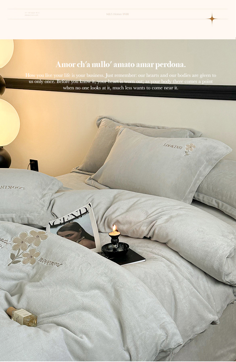 泽西家纺 2024秋冬新款加厚保暖A类小清新刺绣牛奶绒四件套-米娅 葭灰