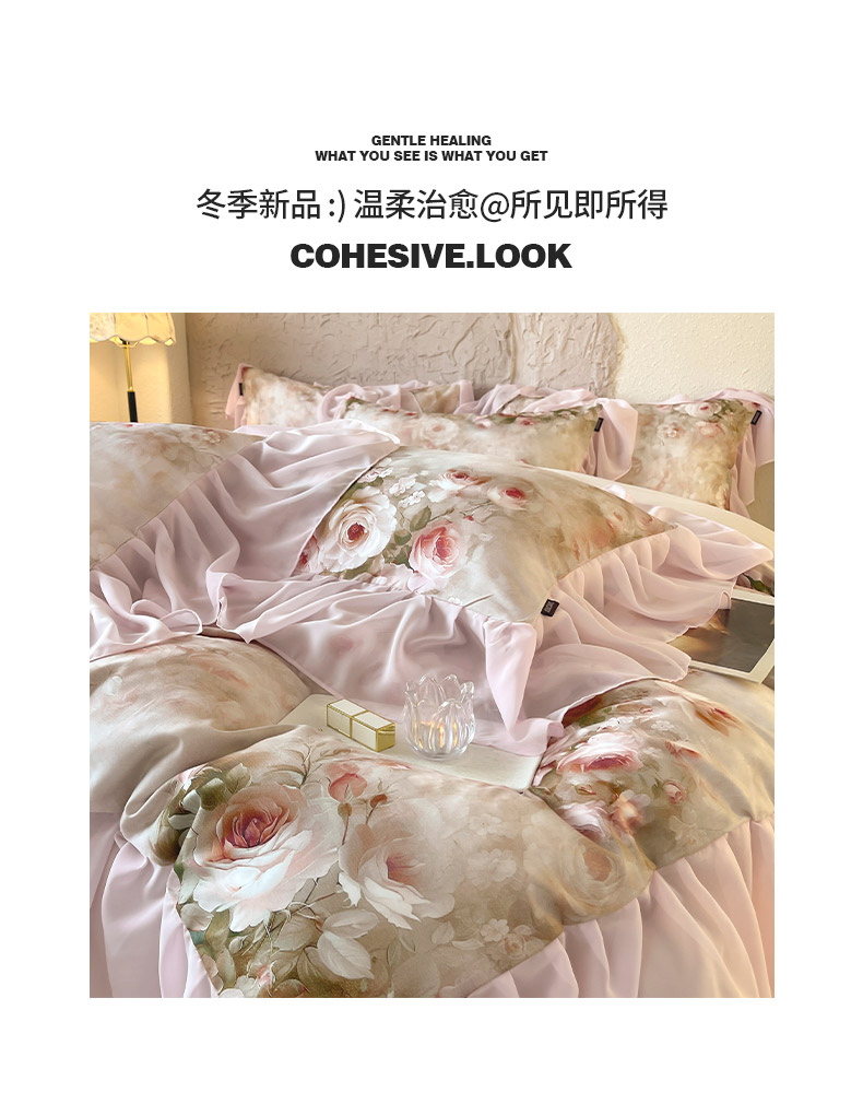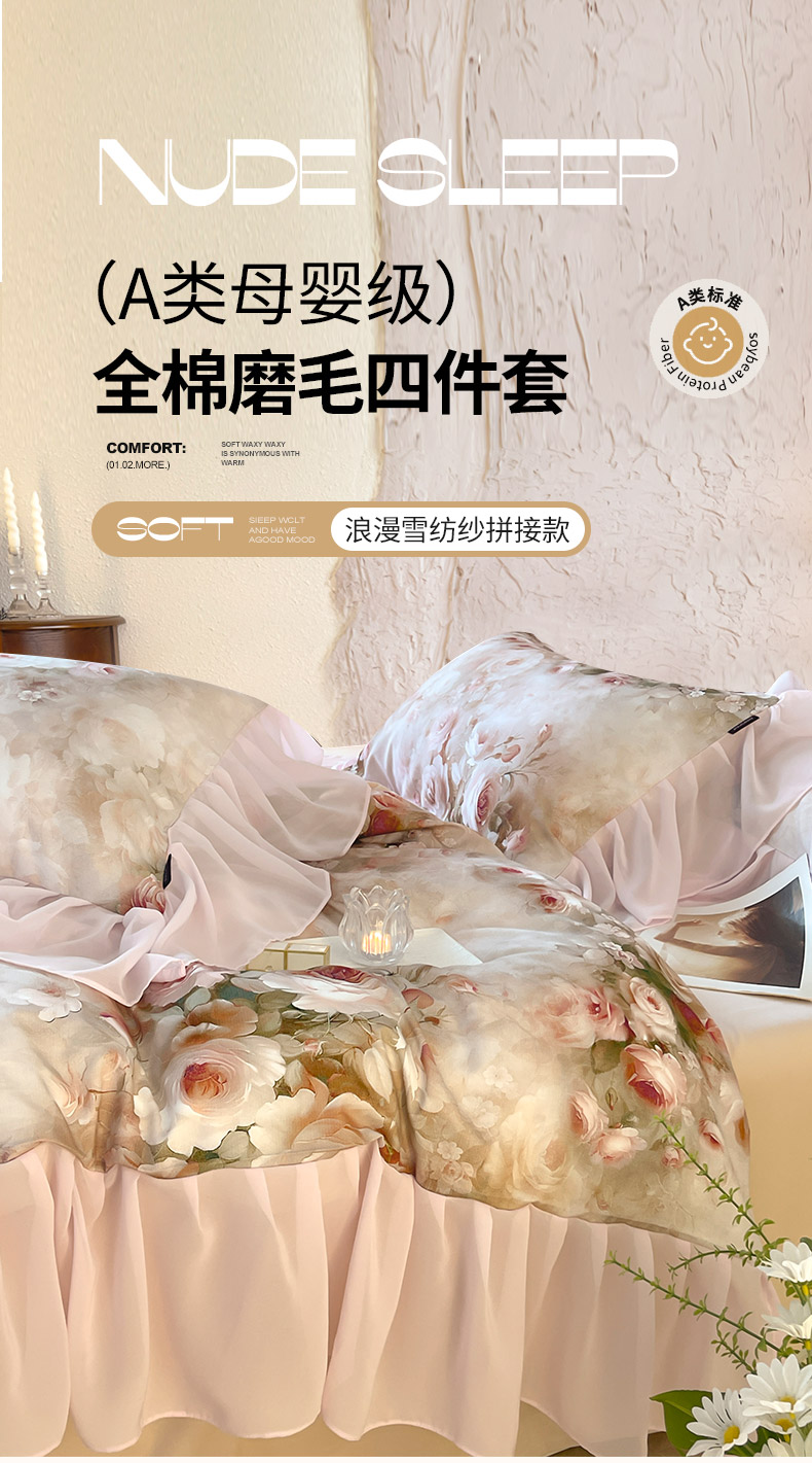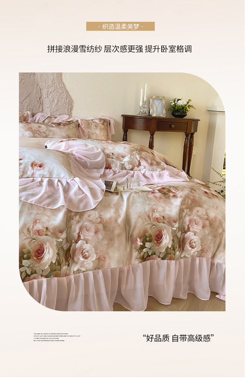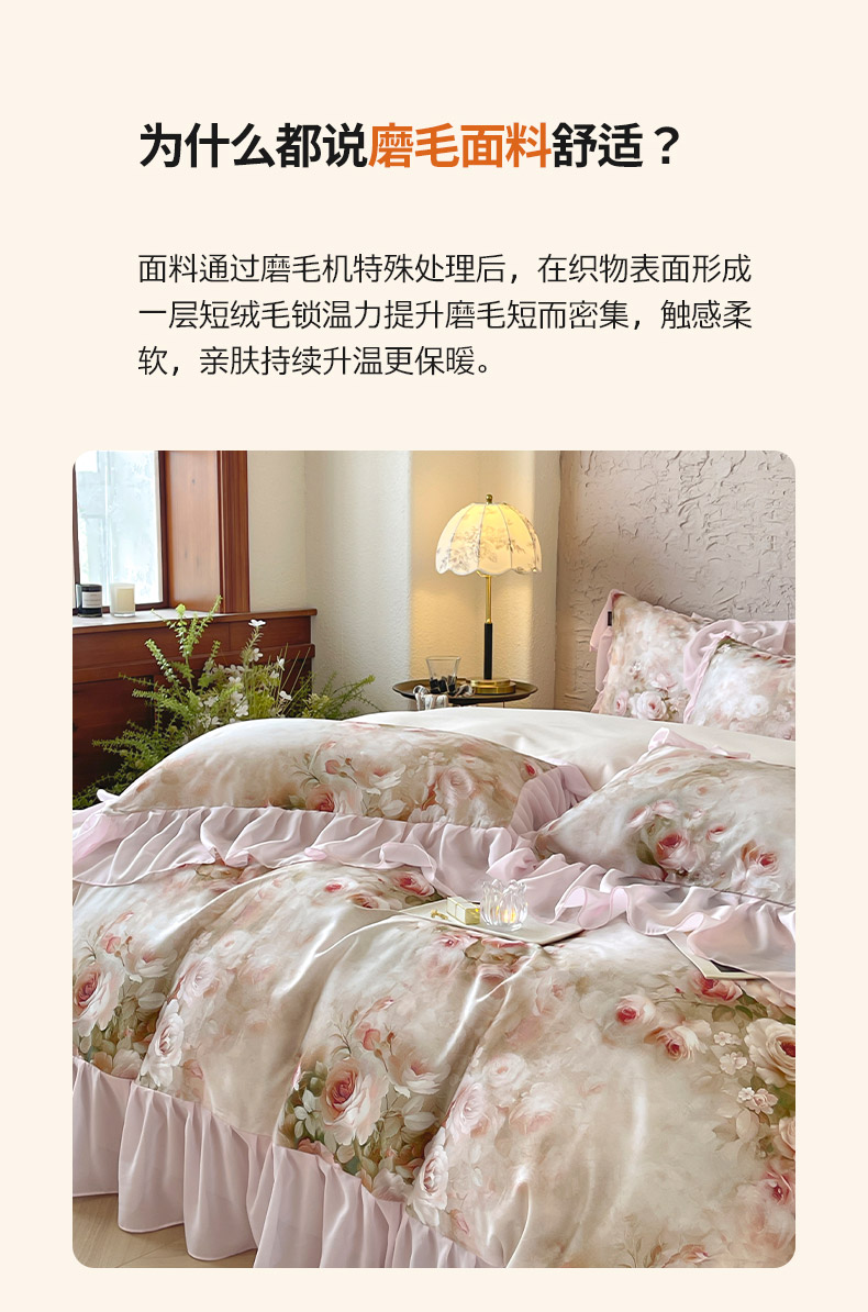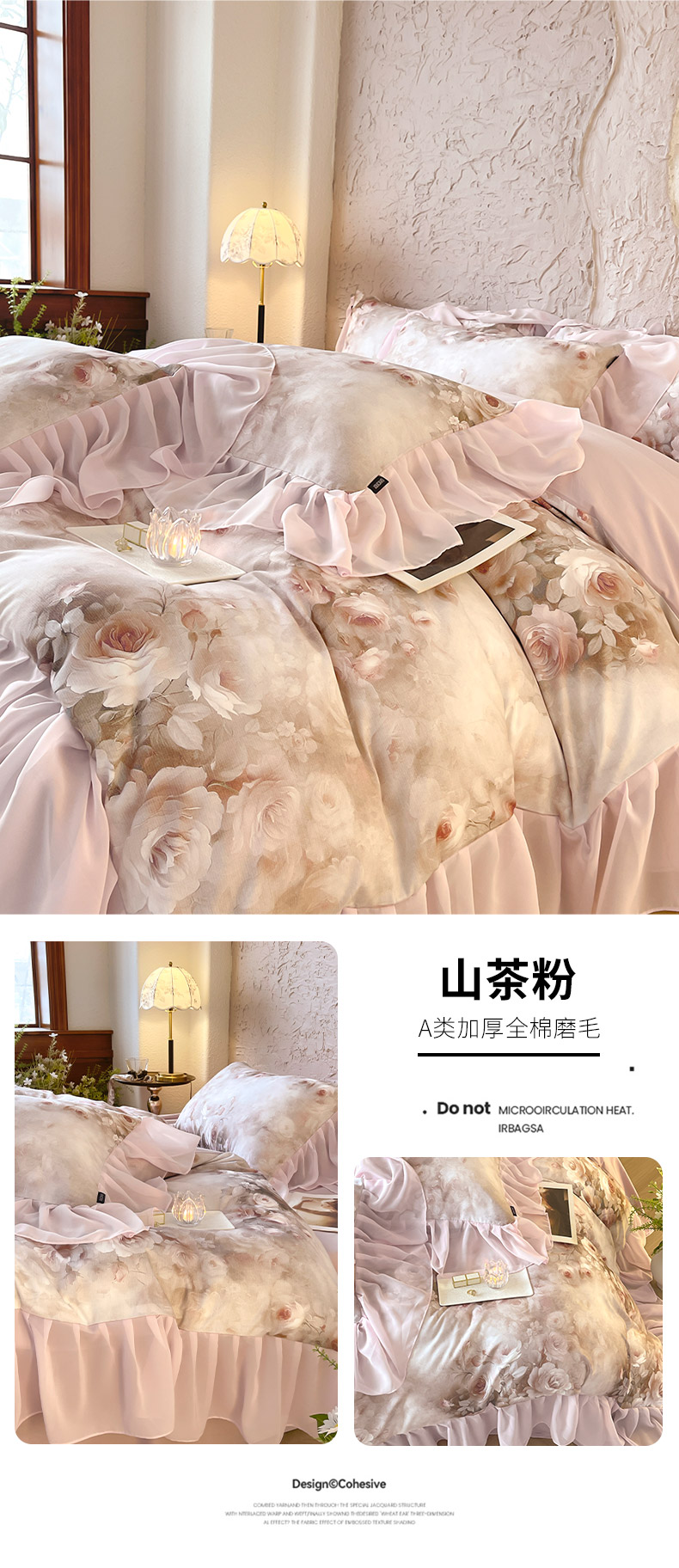 商品名称:A类全工艺全棉磨毛四件套纯棉雪纺纱拼接浪漫法式风加厚保暖床单被套秋冬床上用品 奈雪粉