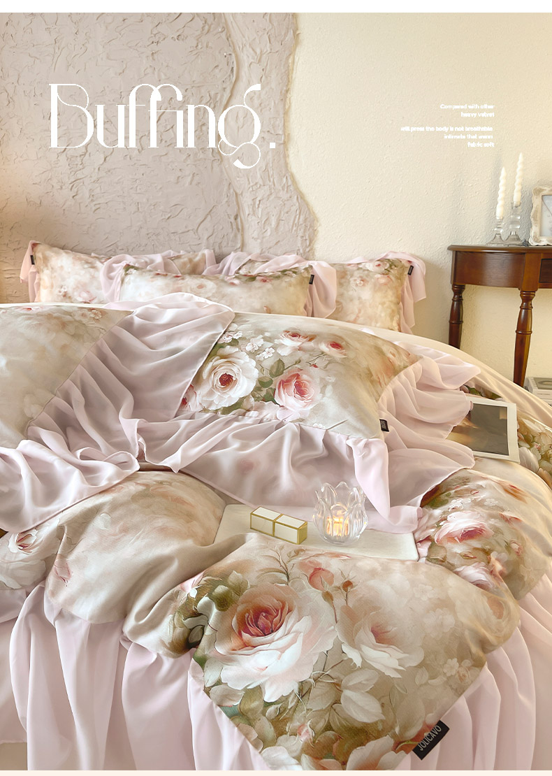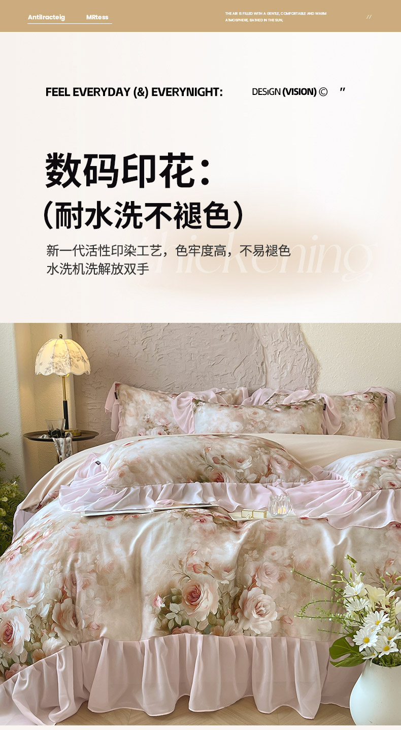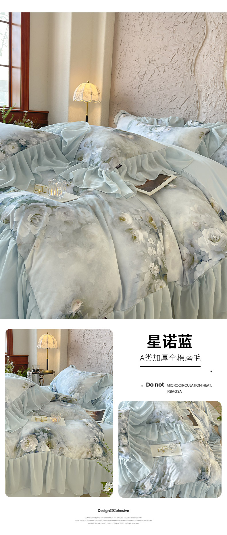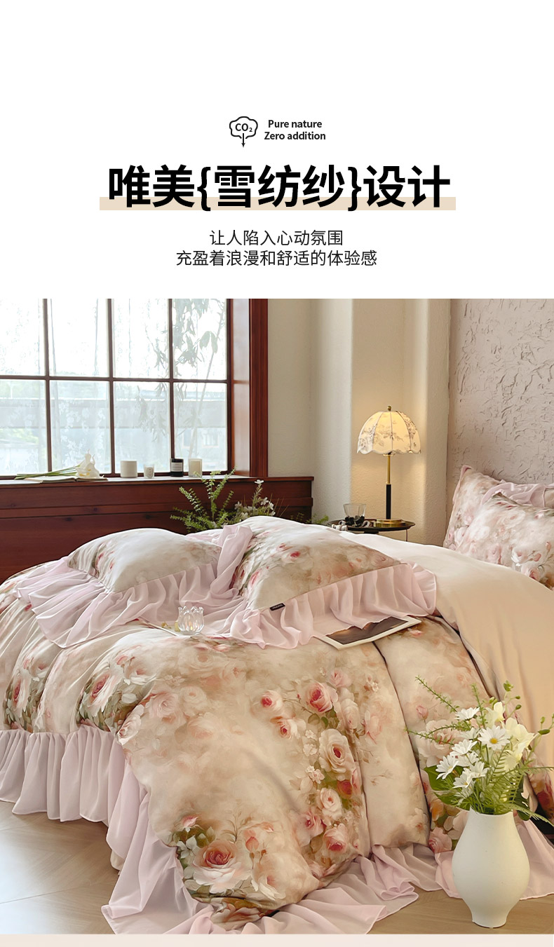 商品名称:A类全工艺全棉磨毛四件套纯棉雪纺纱拼接浪漫法式风加厚保暖床单被套秋冬床上用品 奈雪粉