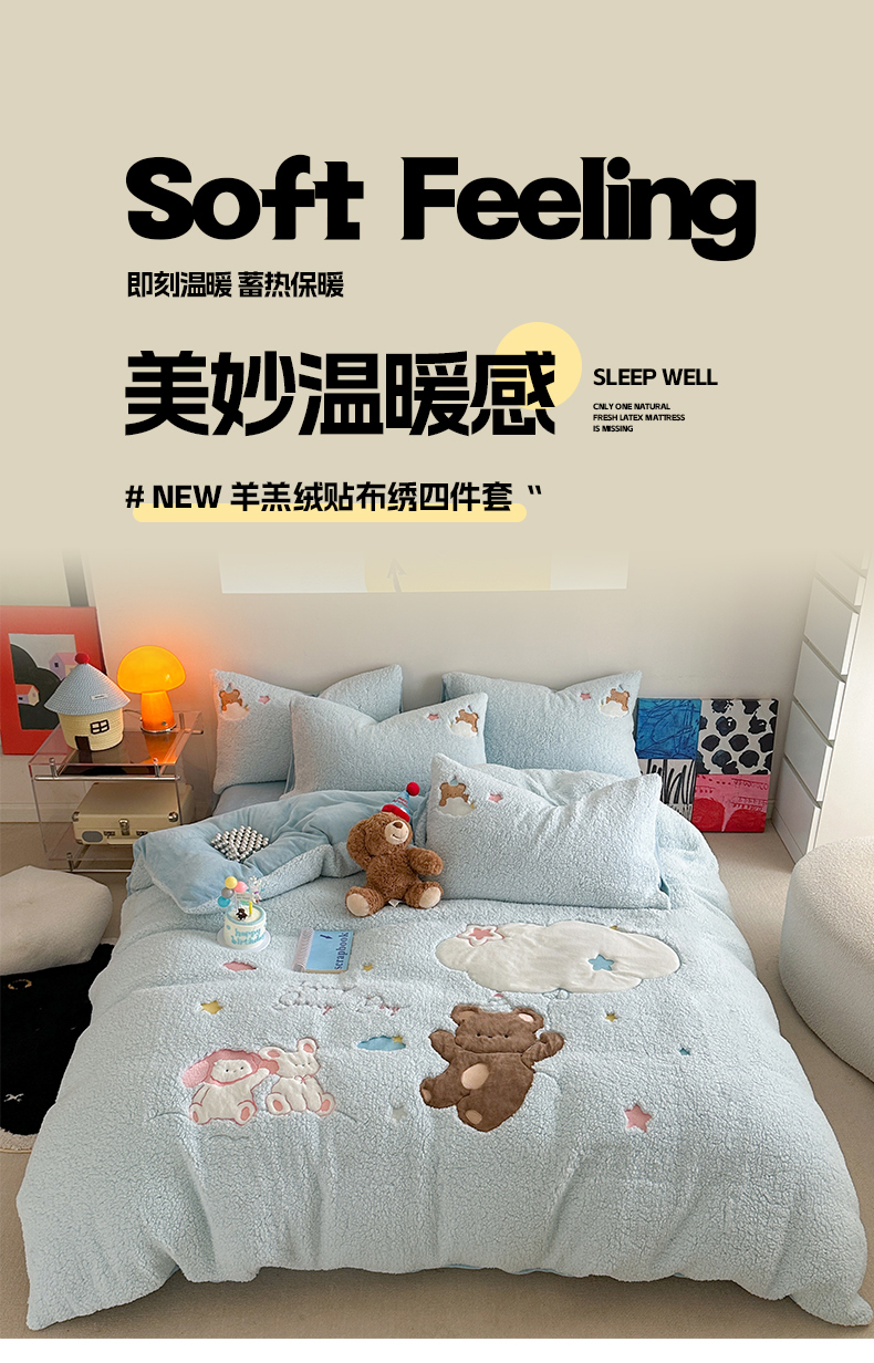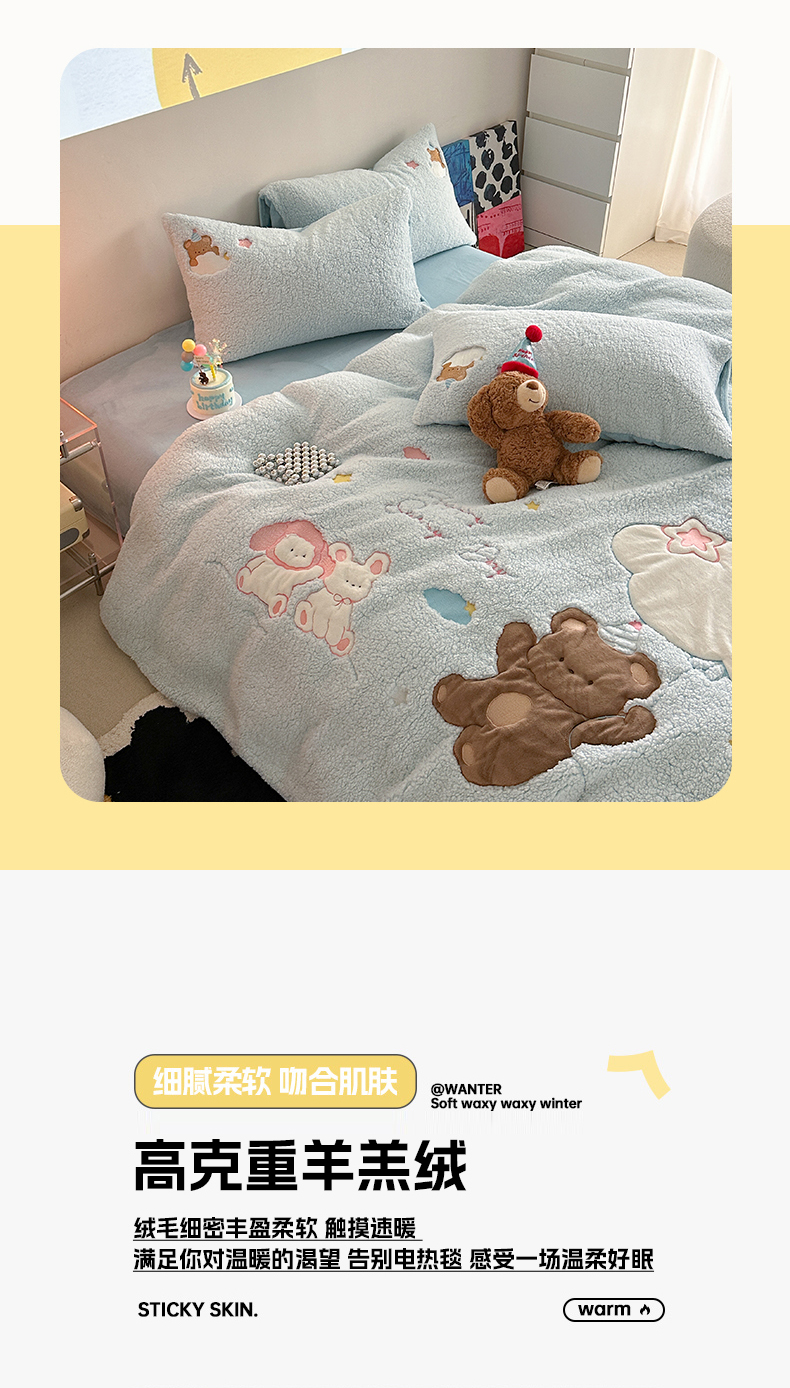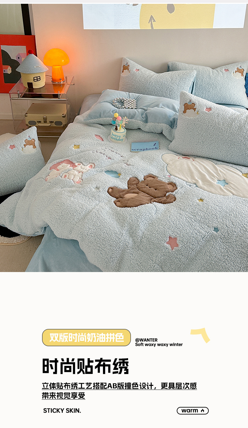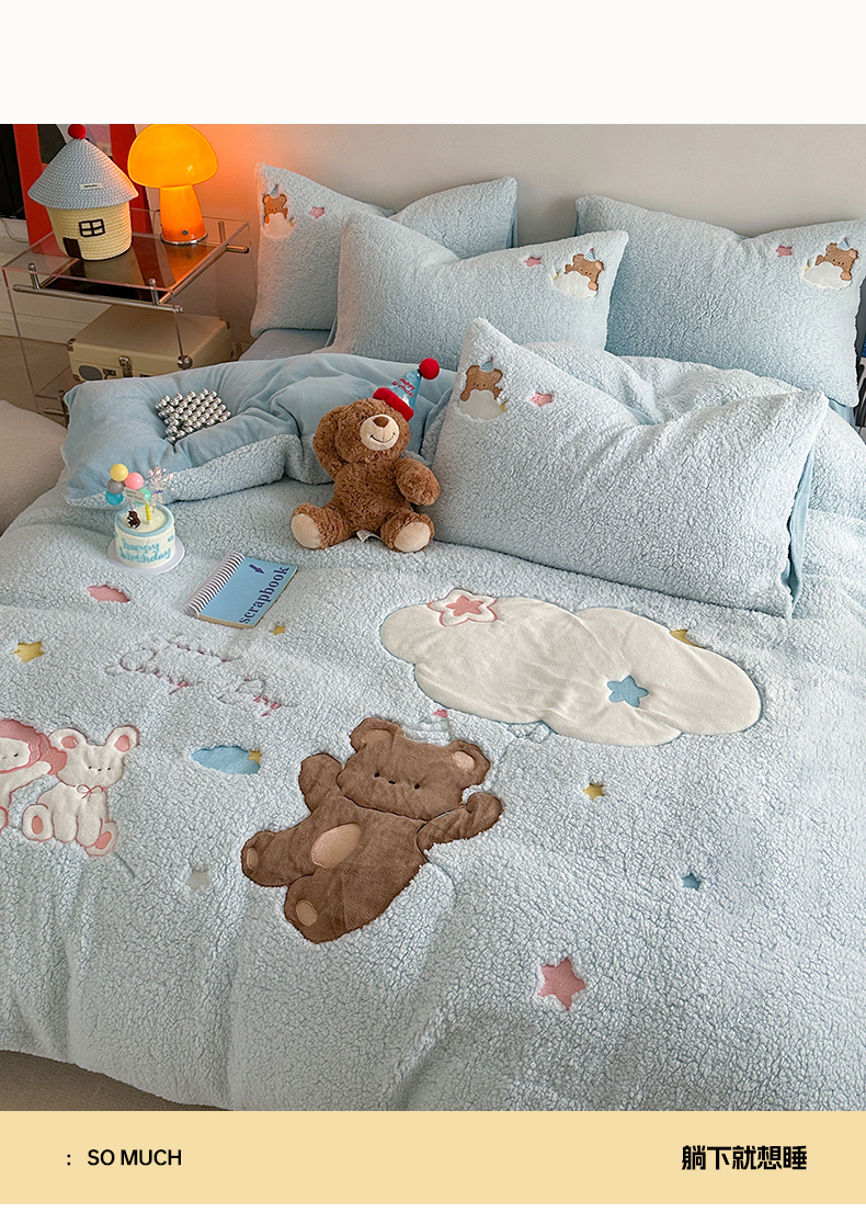 眠屿家纺 2024新款羊羔绒贴布绣四件套 云朵熊