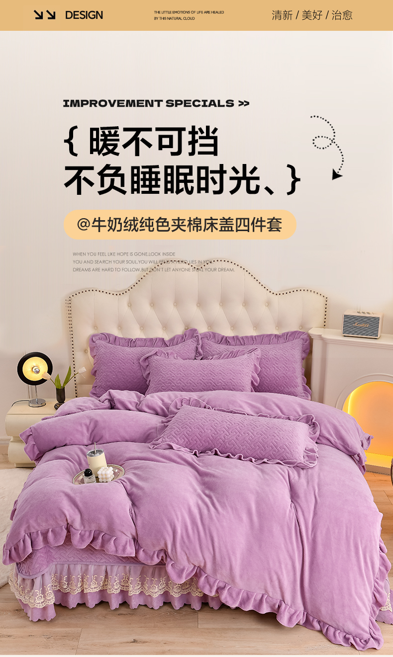 畅畅家纺 2024新款简约纯色牛奶绒夹棉床盖四件套 倾城-紫