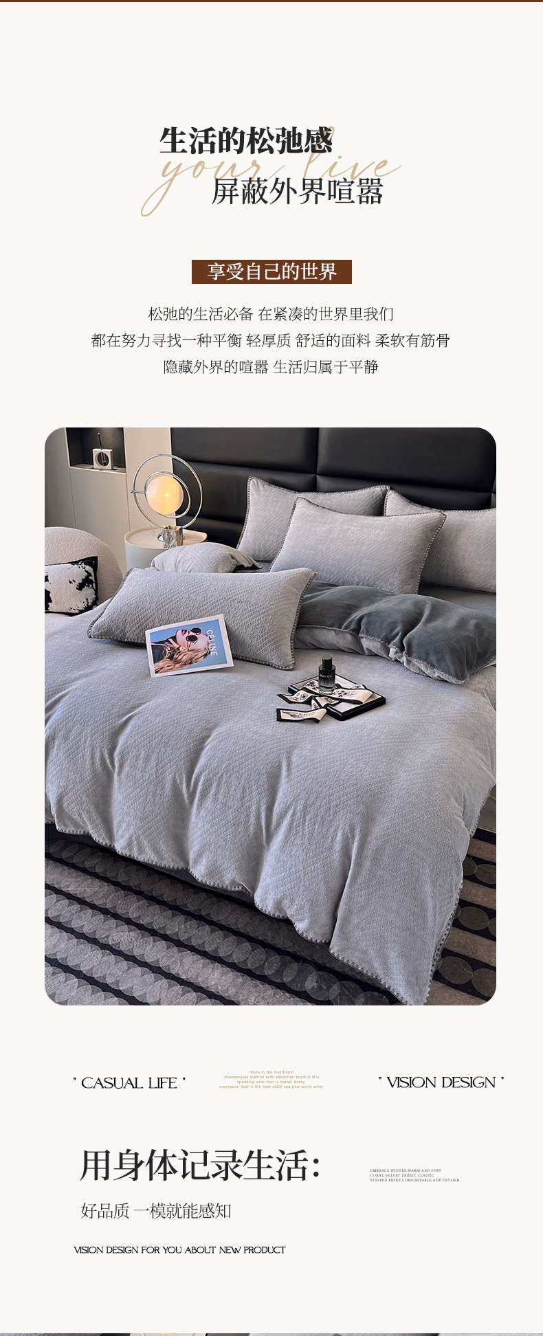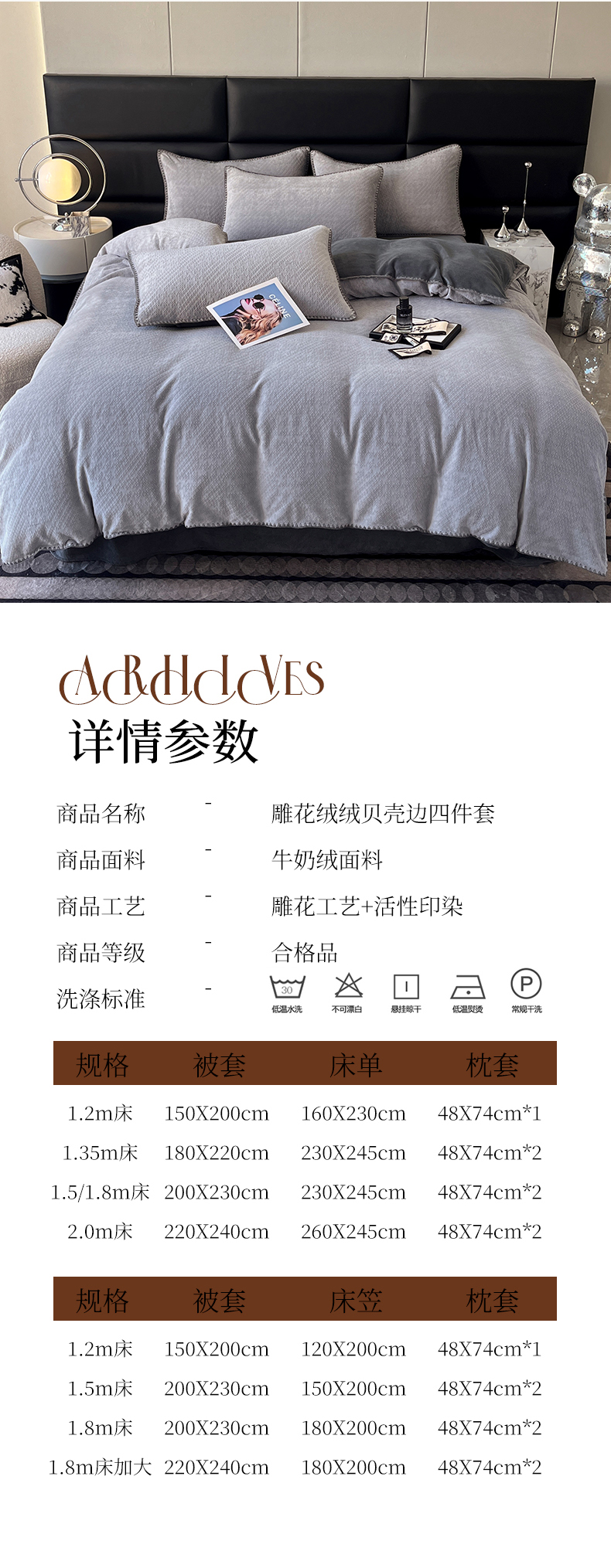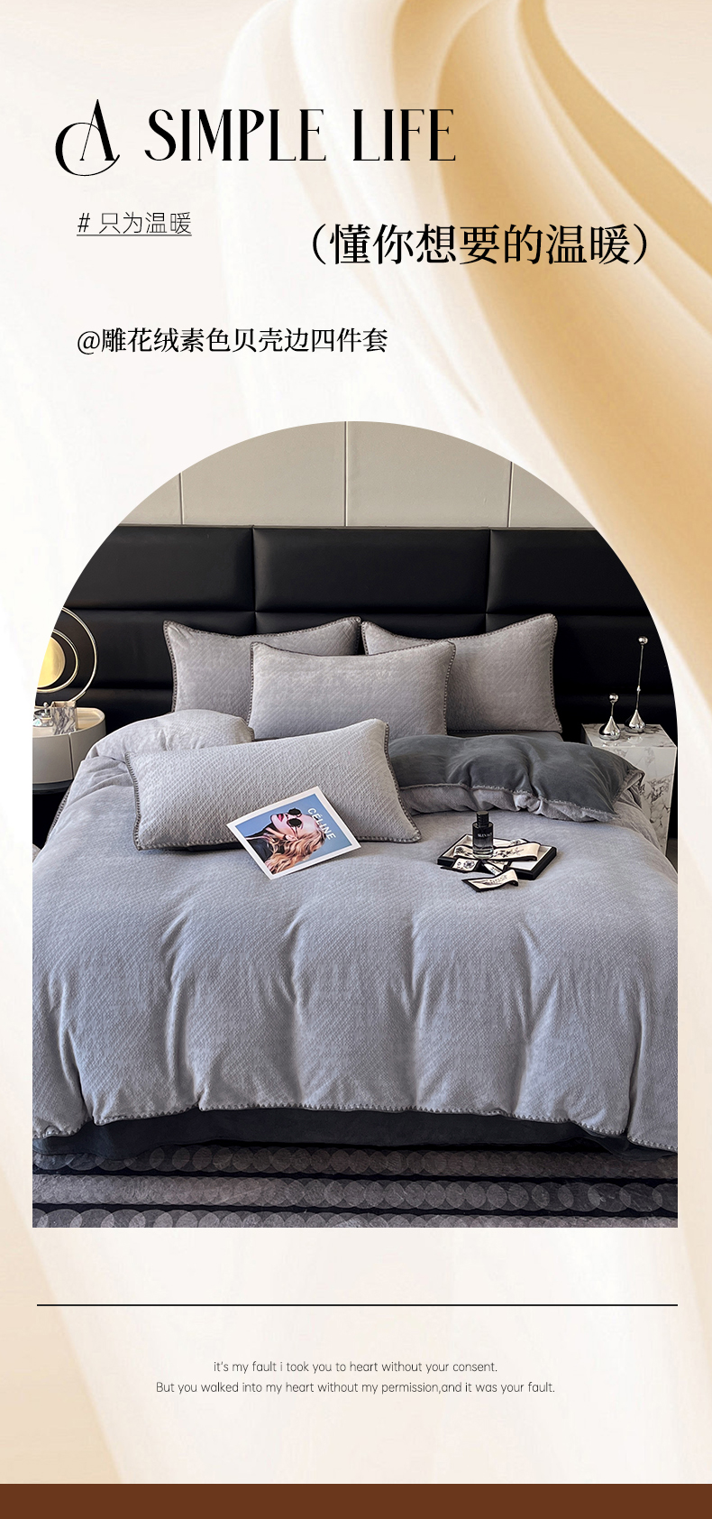 (总)菡宝2025新款工艺款贝壳边雕花绒简约良品风牛奶绒四件套-梵西系列 支持定做定制尺寸,梵西灰,梵西紫,米娅灰,米娅粉,洛璃灰,洛璃紫
