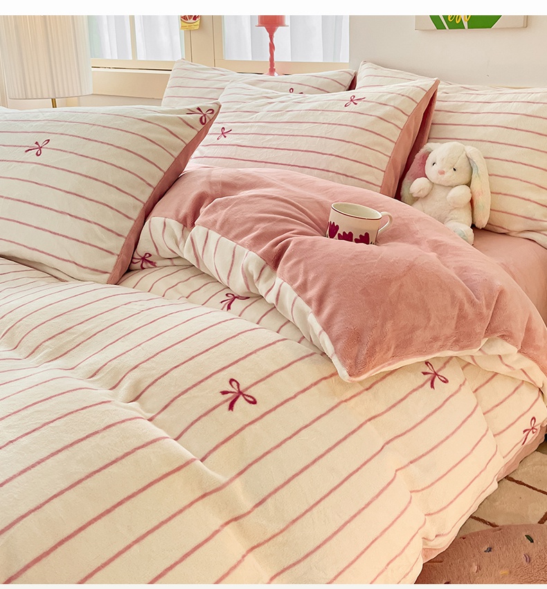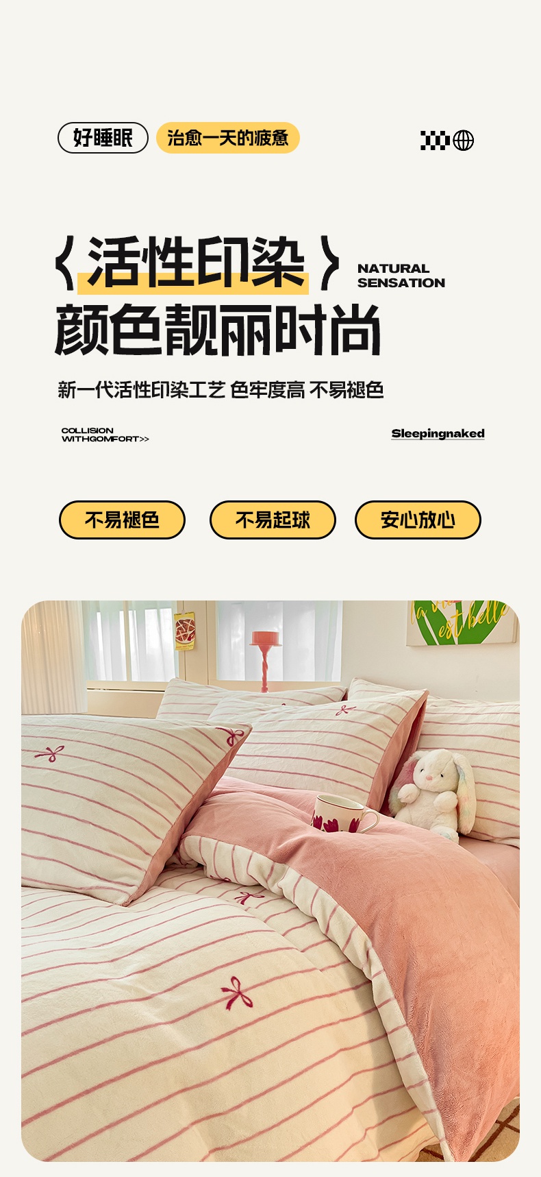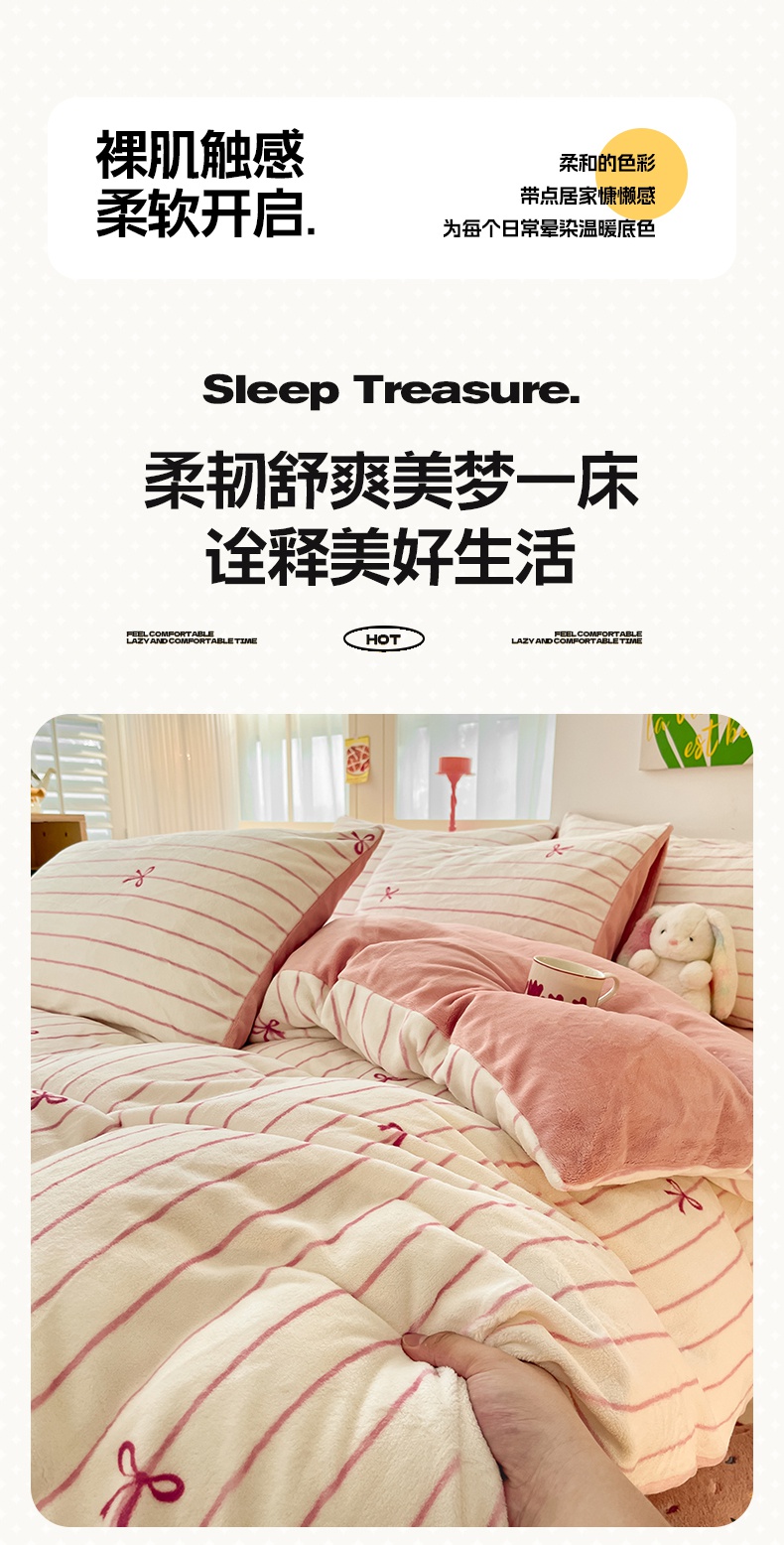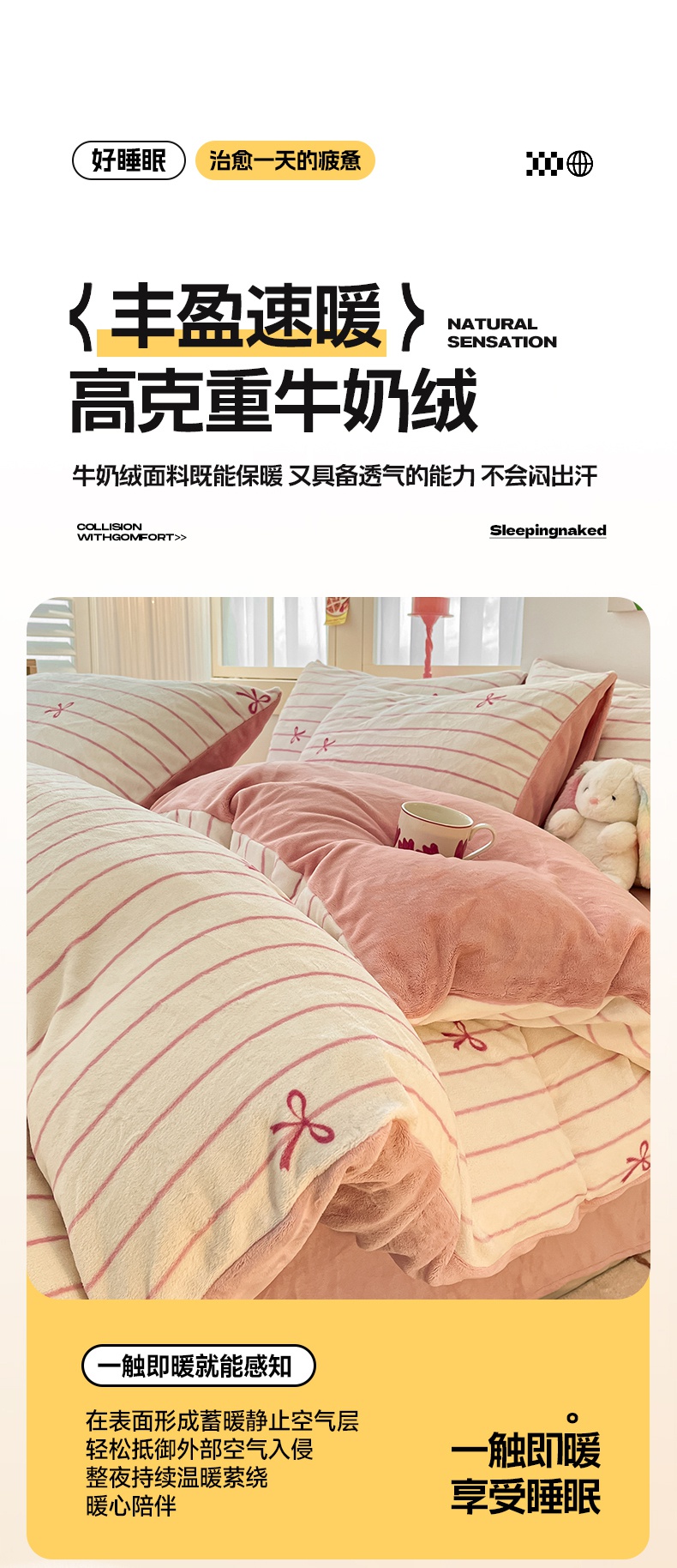 寐眠 2024新款高克重印花牛奶绒四件套条纹风格一 蜜桃蝴蝶结