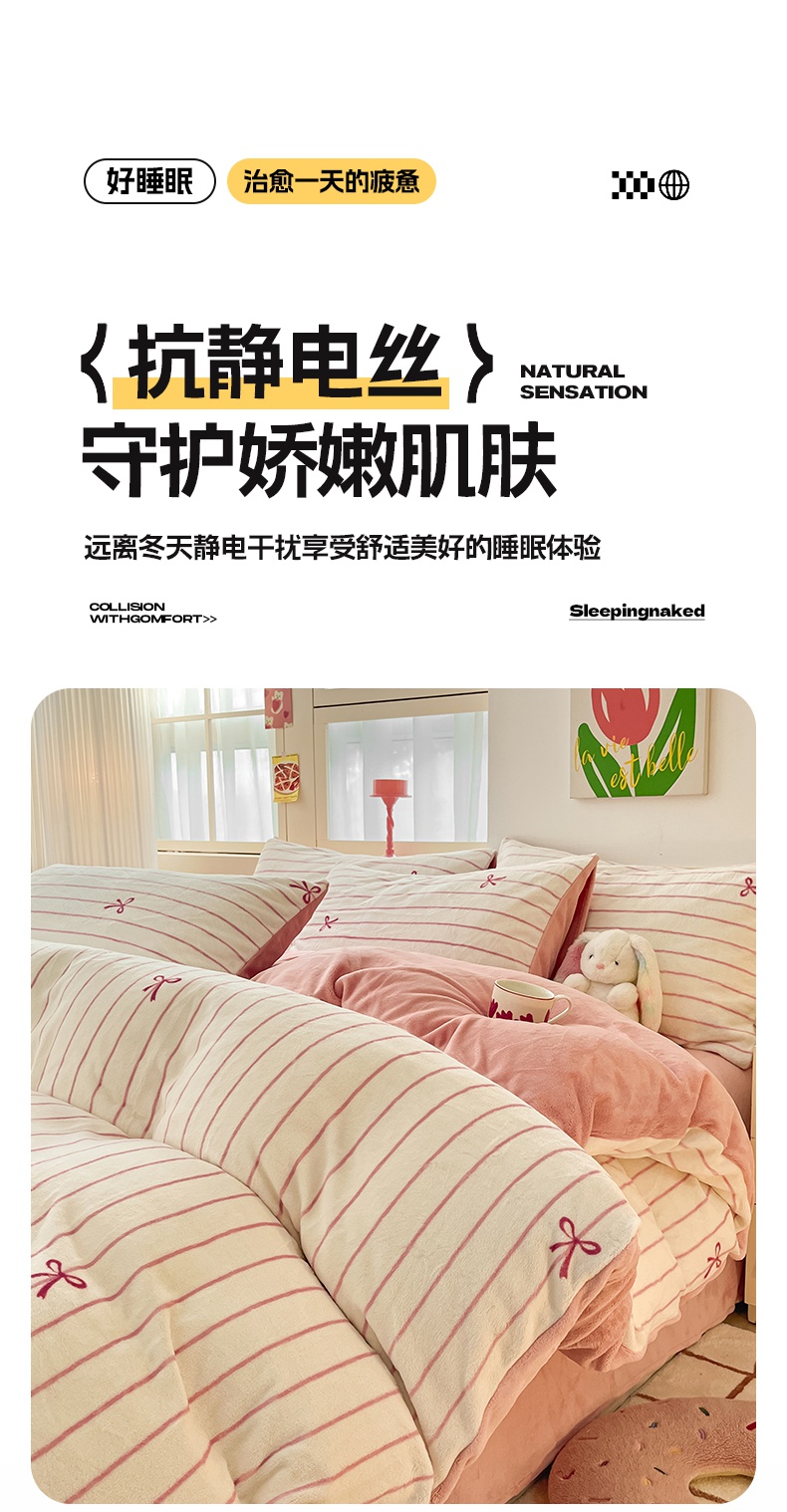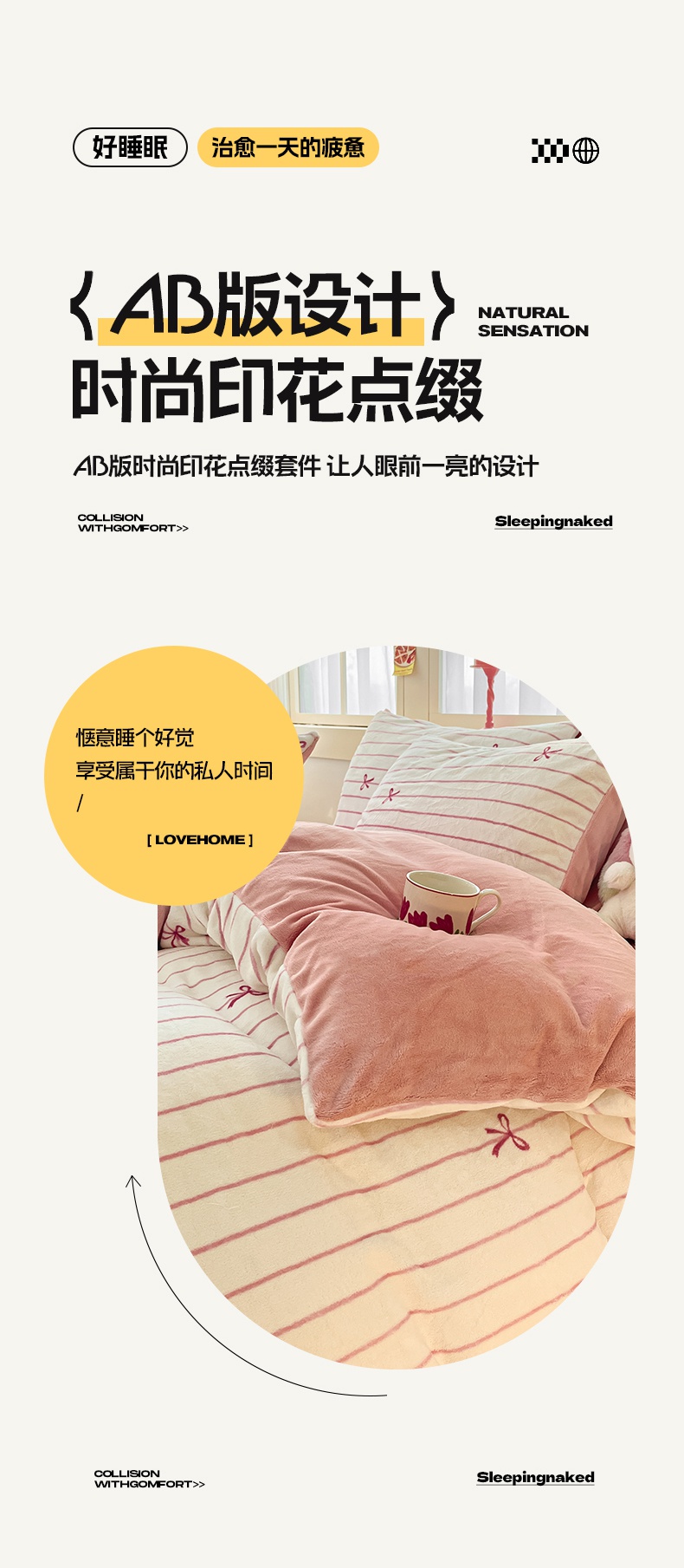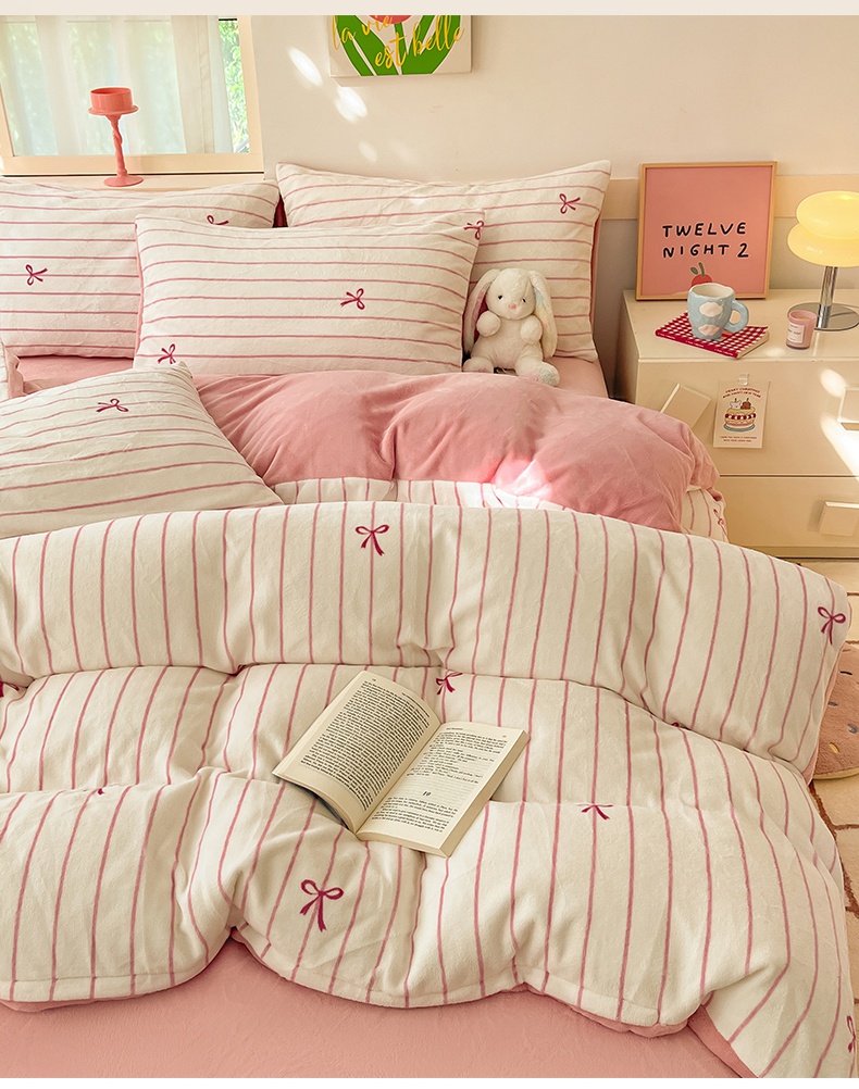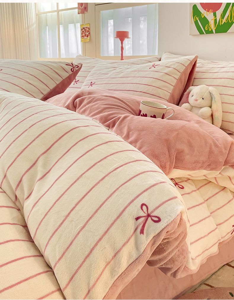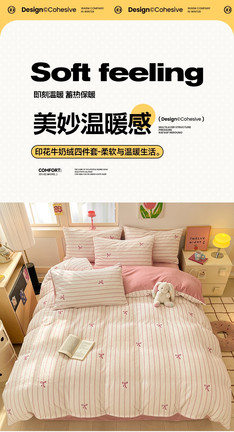 寐眠 2024新款高克重印花牛奶绒四件套条纹风格一 蜜桃蝴蝶结