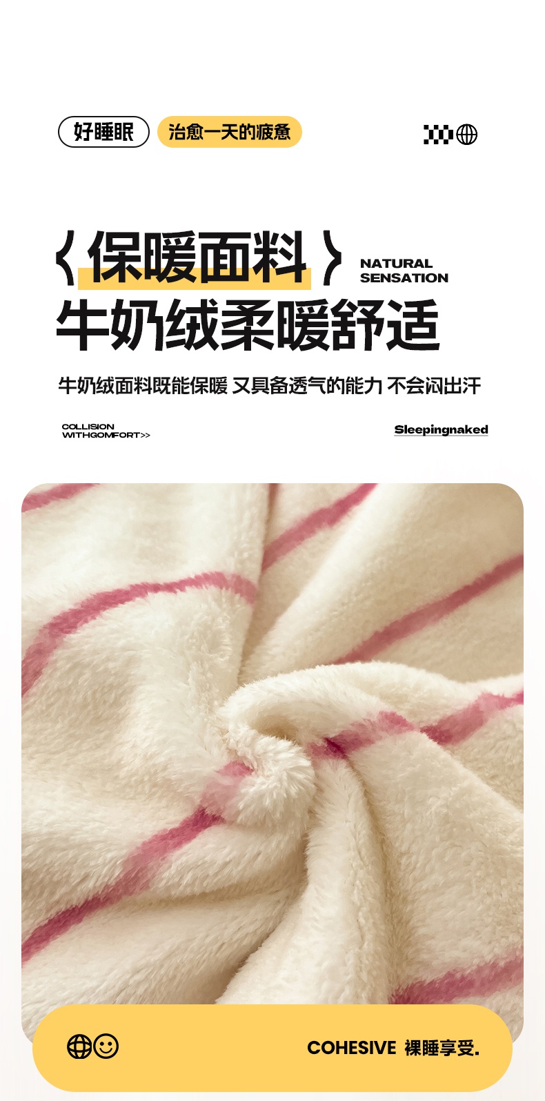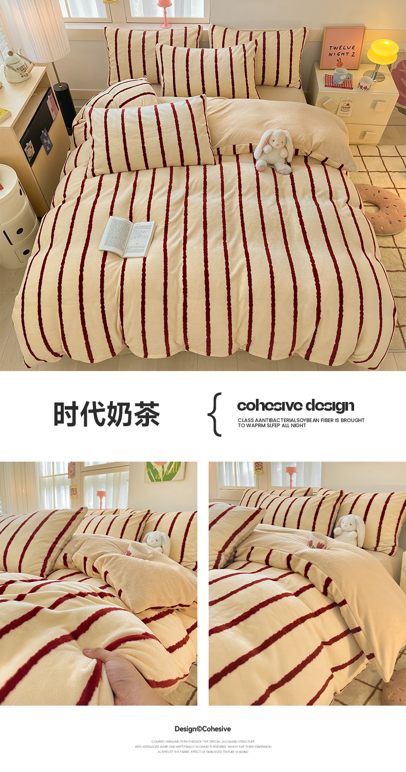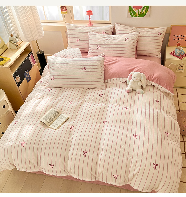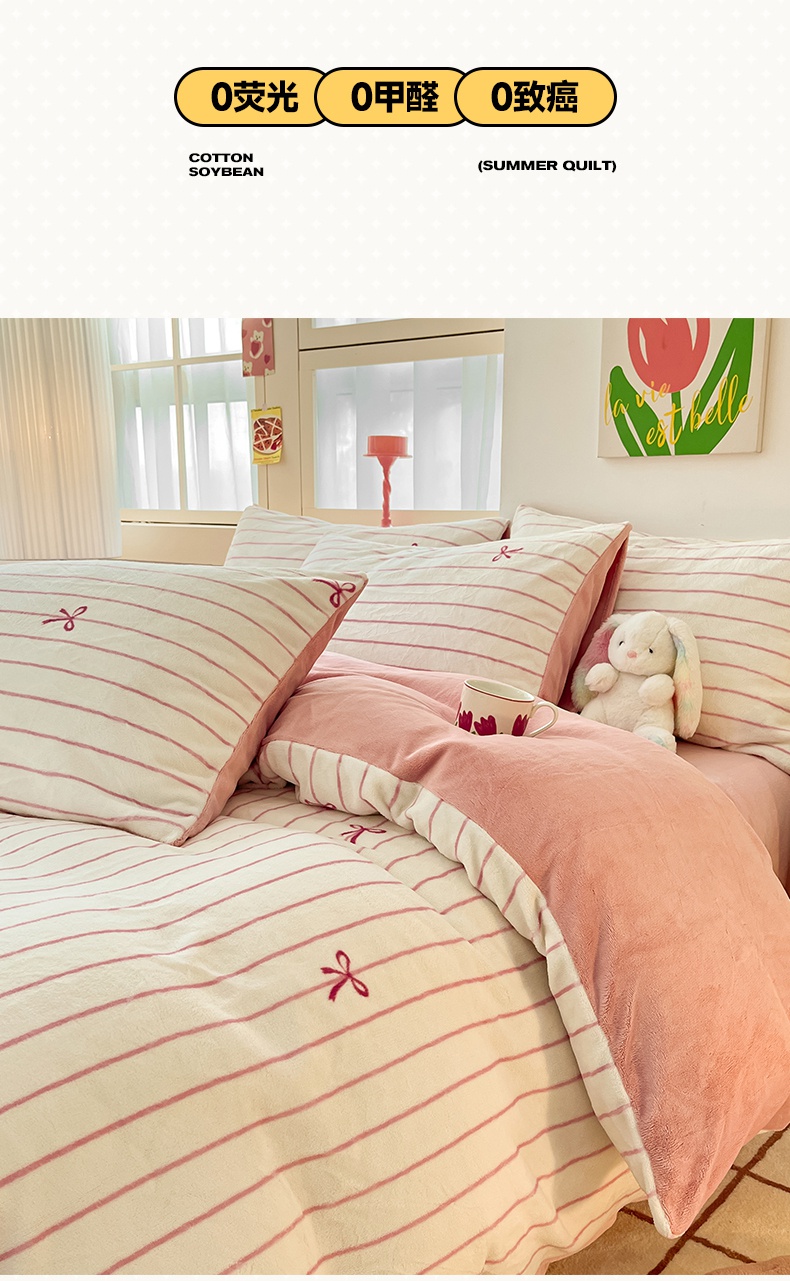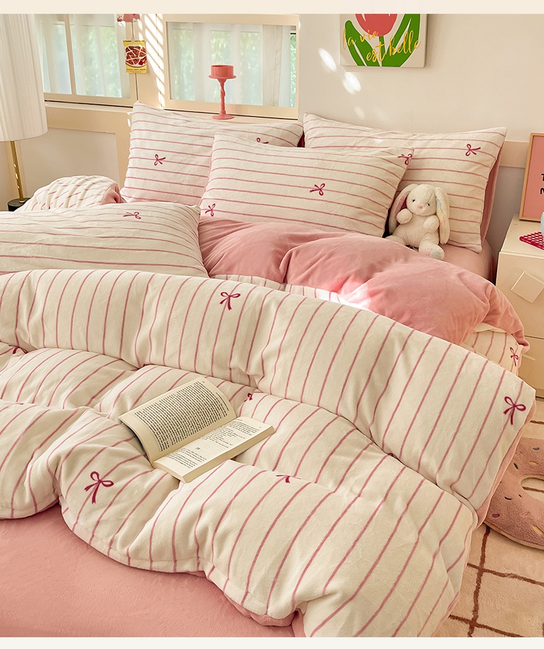 寐眠 2024新款高克重印花牛奶绒四件套条纹风格一 蜜桃蝴蝶结