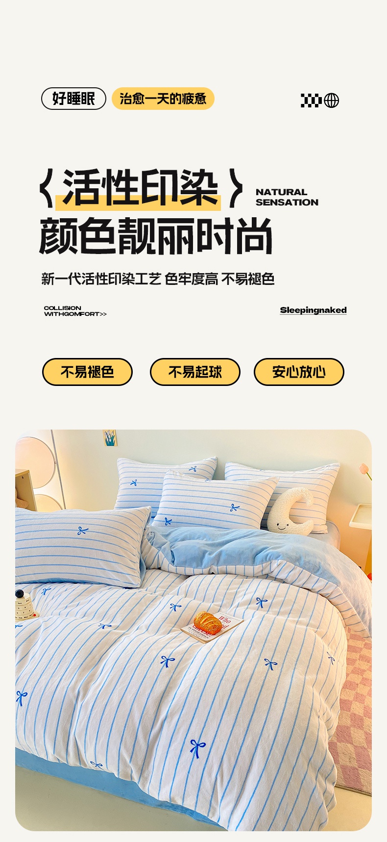 商品名称:2024新款高克重印花牛奶绒四件套条纹风格二 浅灰蝴蝶结