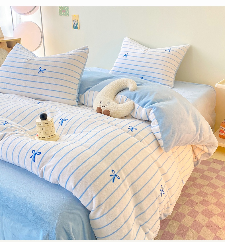 2024新款高克重印花牛奶绒四件套条纹风格二 浅灰蝴蝶结