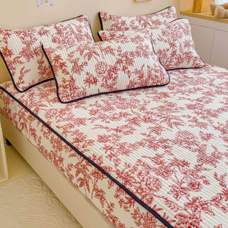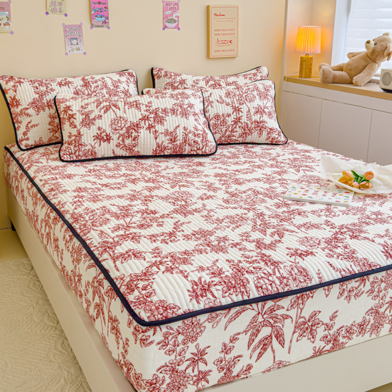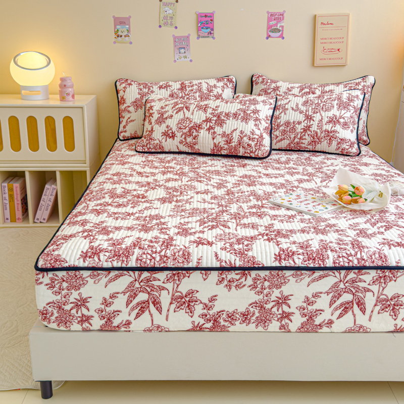 金丝鸟 2024新款牛奶绒夹棉床笠 红色花朵 夹棉床笠