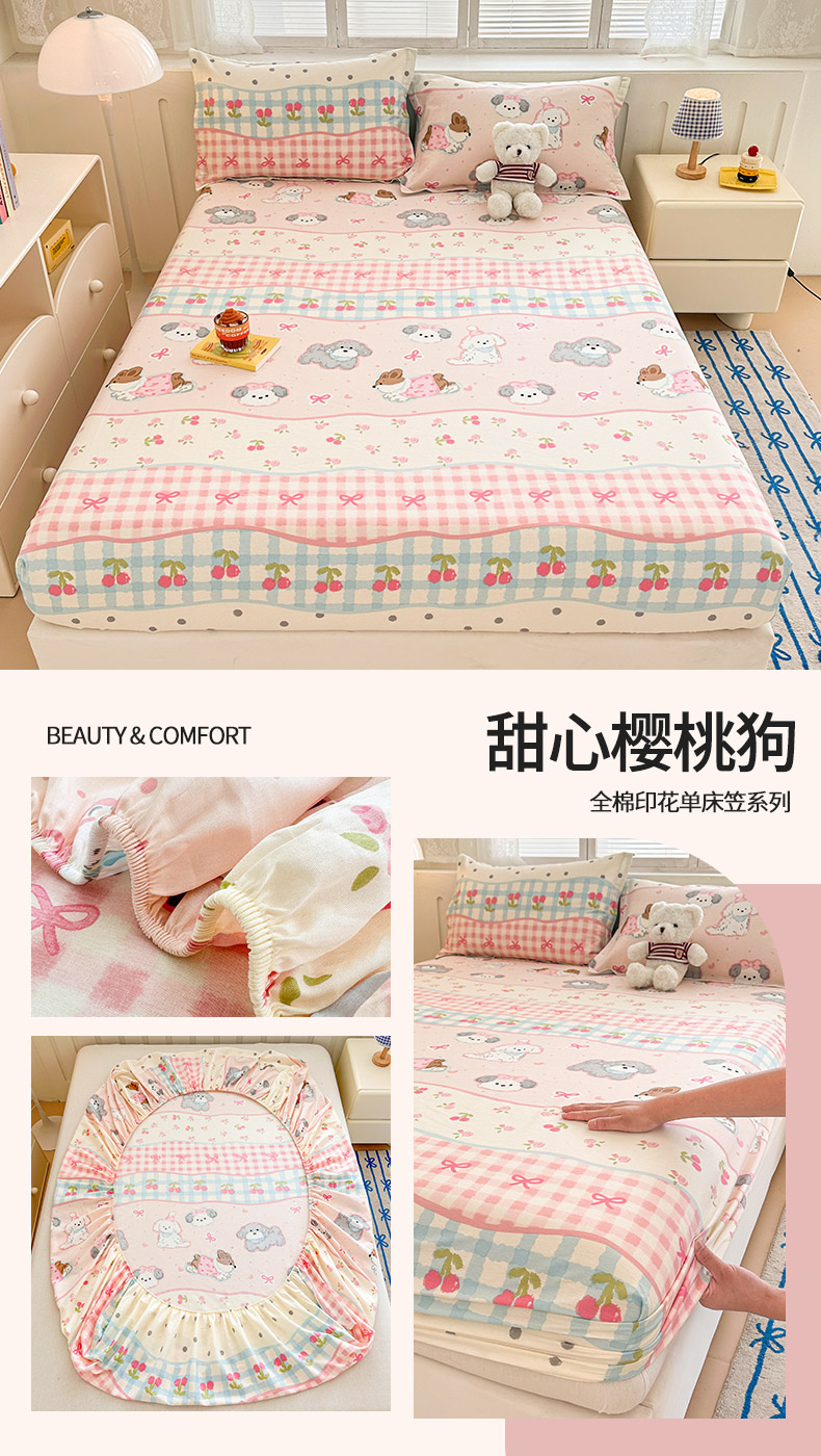 商品名称:绵庭家纺 2025新款全棉印花单床笠系列 甜心樱桃狗