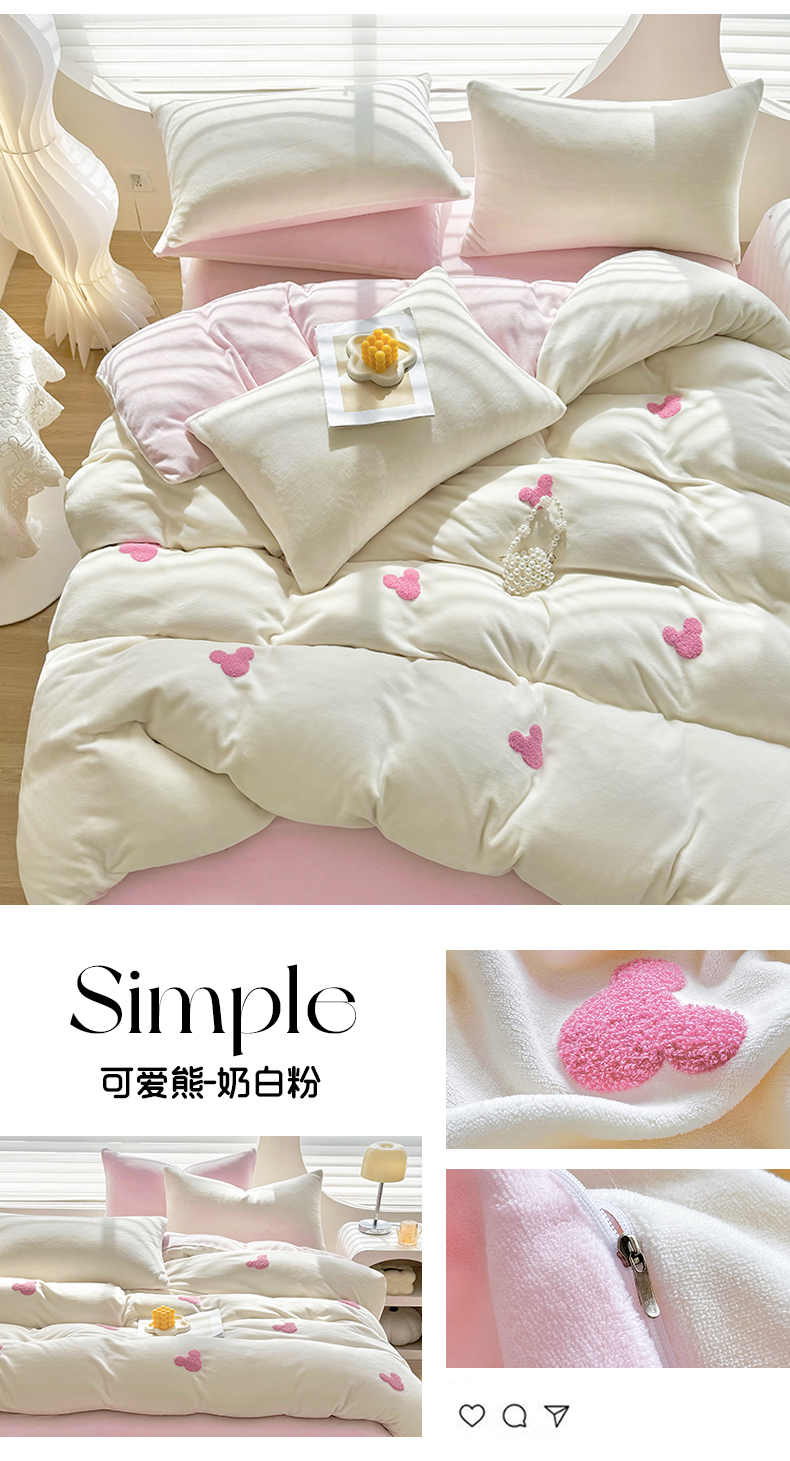 当前位置: 91家纺网 > 商品网购 > 床品套件 > 四件套 > 牛奶绒四件套 > 满羽家纺 2024爆款冬季加厚毛巾绣牛奶绒四件套可爱熊-奶白粉