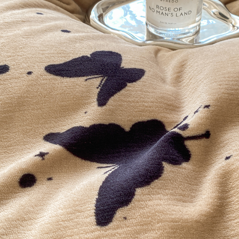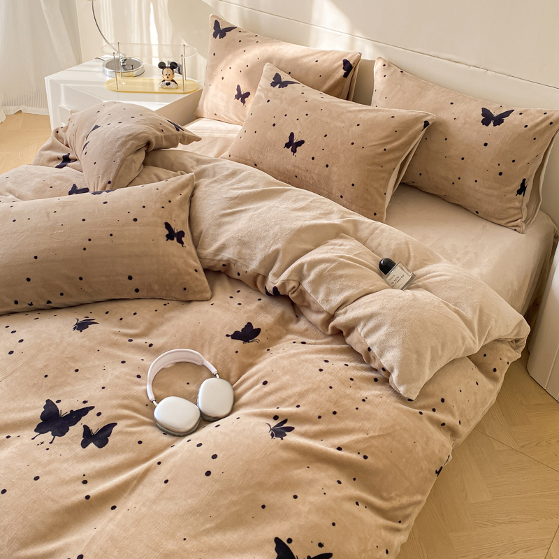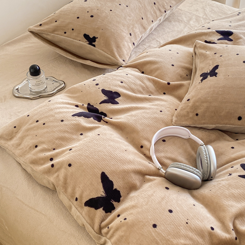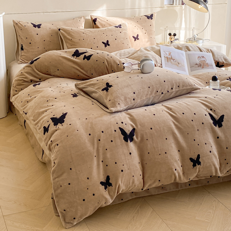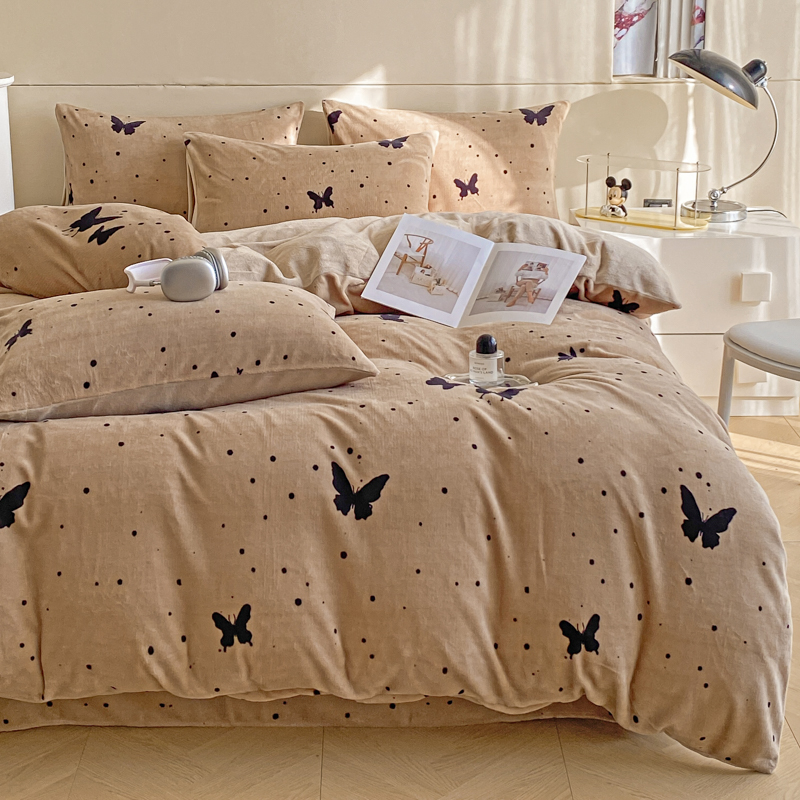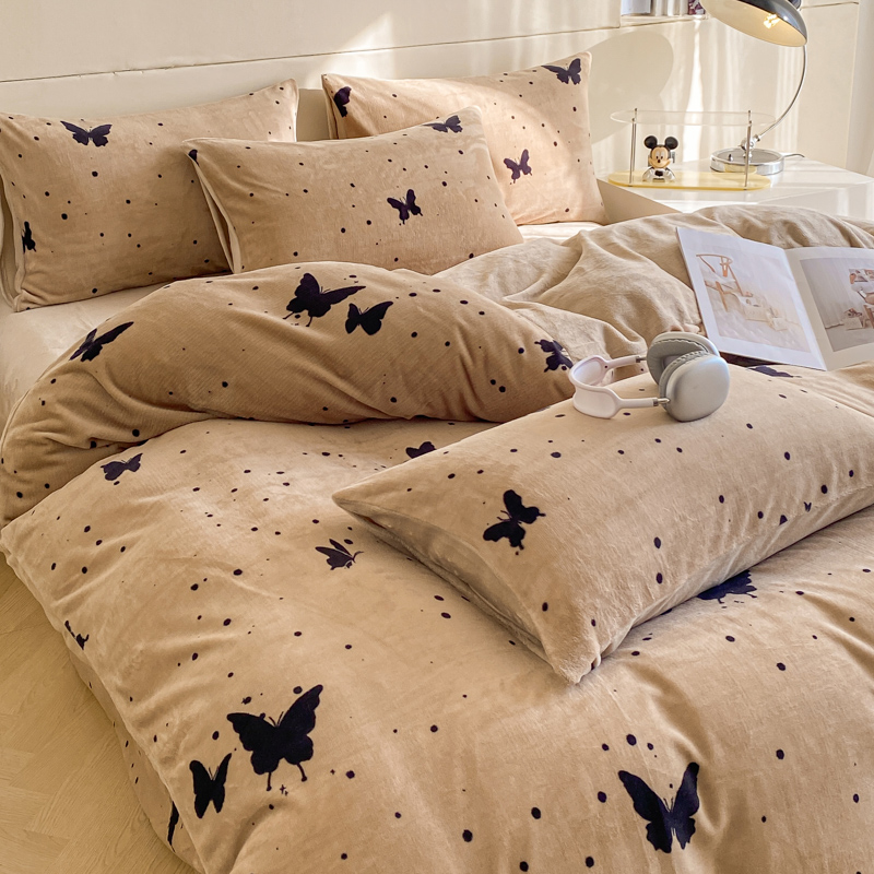 商品名称:斯卡诺家纺 2025新款小清新双面牛奶绒印花四件套 黑蝴蝶