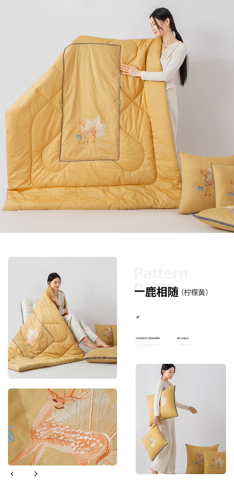 雷人家纺 2023新款全棉喷气13*72刺绣抱枕被 一鹿相随(柠檬黄)