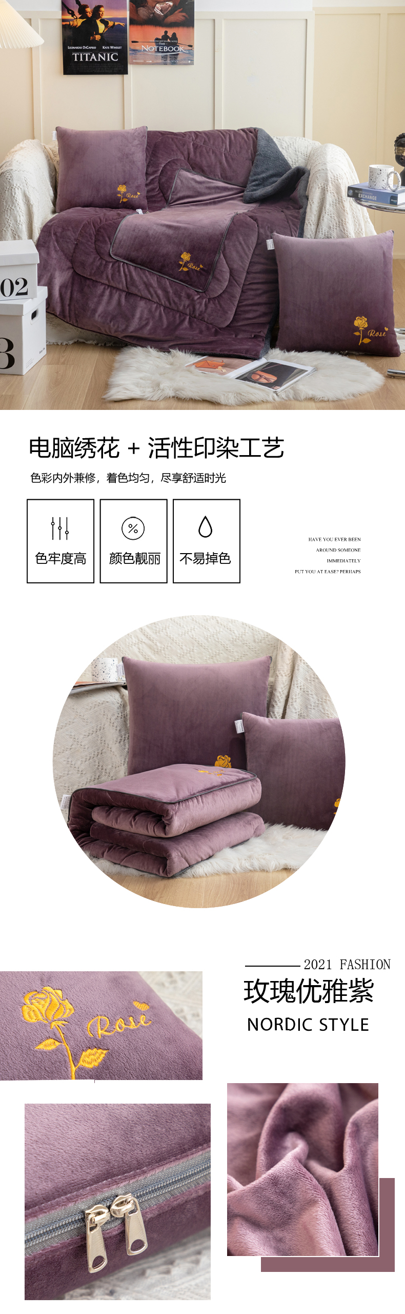 雷人家纺 2021新款宝宝绒保暖加厚双拼绣花抱枕被 玫瑰优雅紫