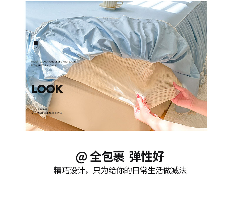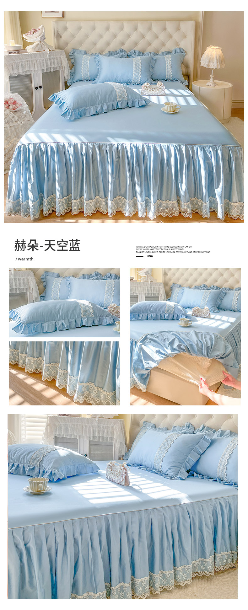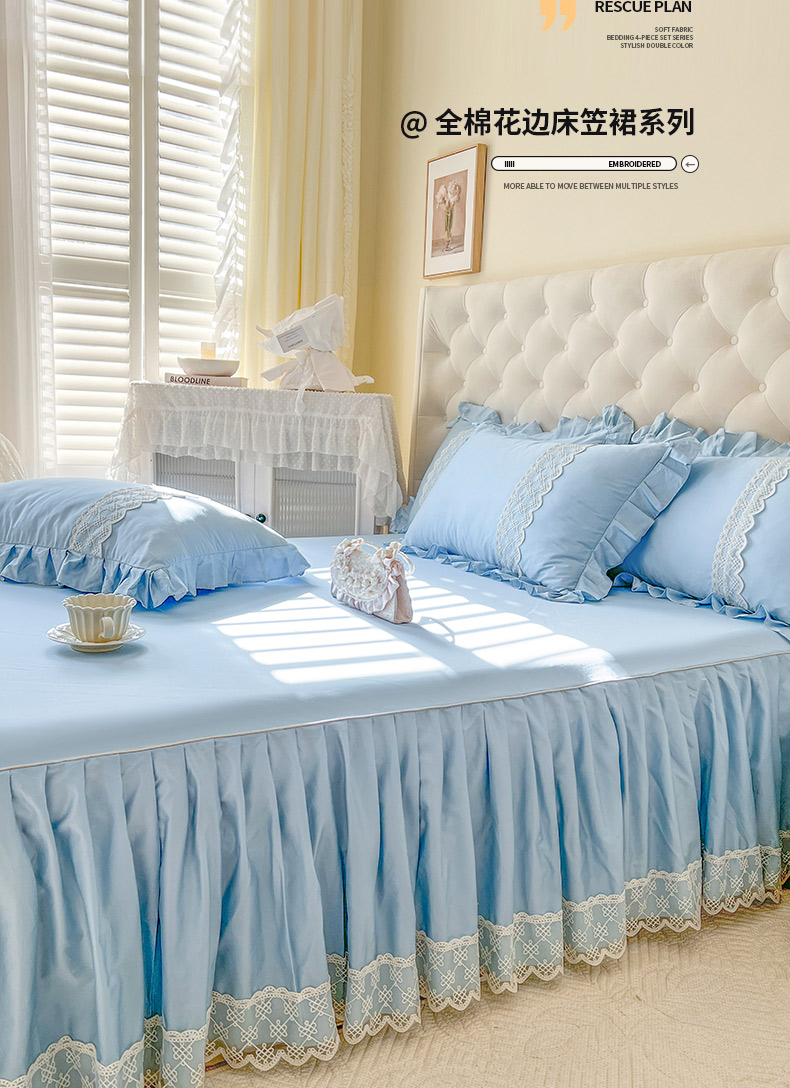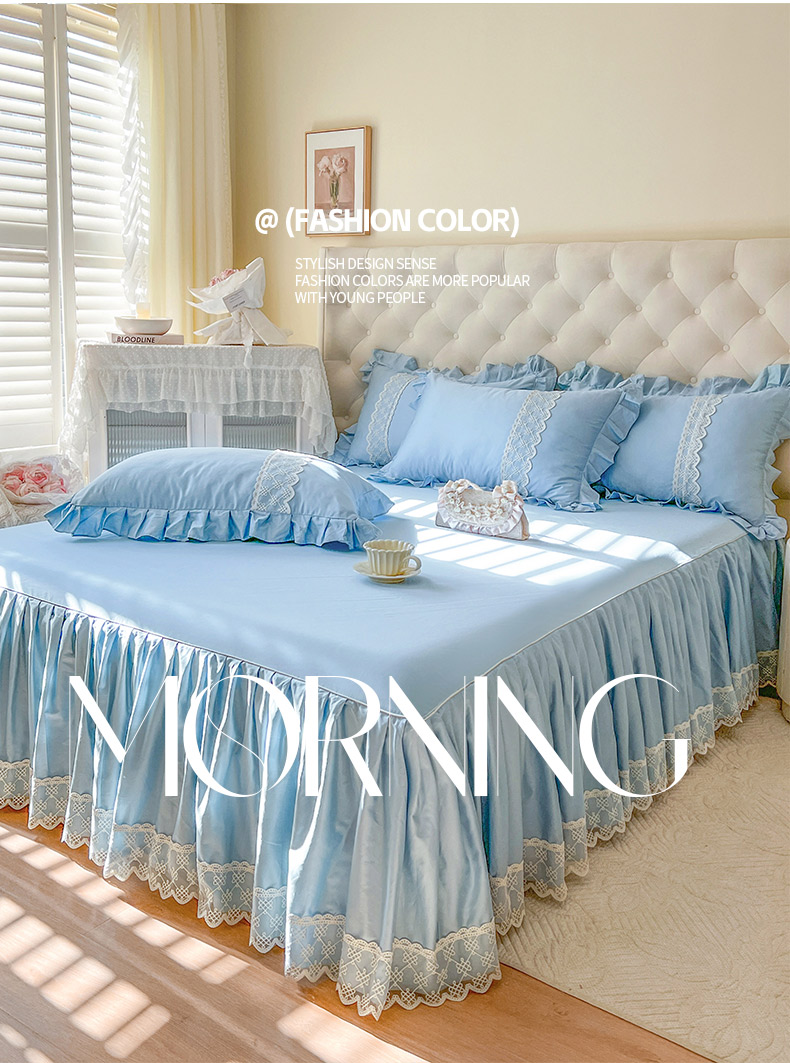 • 91家纺网 家纺一手货源 找家纺 恋尚 2025新款60贡缎长绒棉床笠裙款三件套-赫朵 赫朵-天空蓝