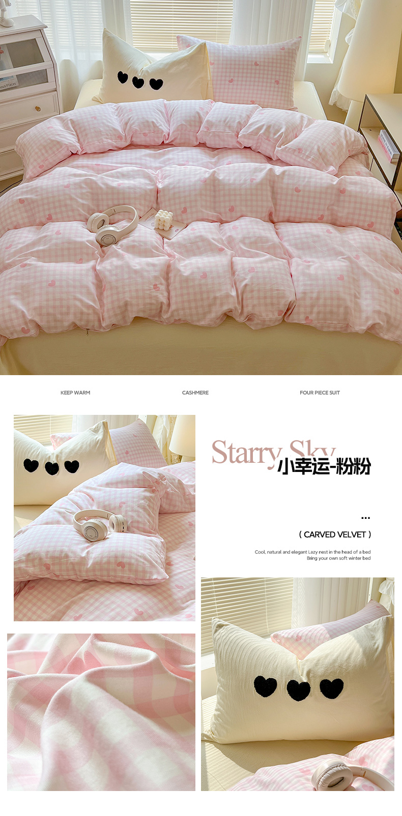 当前位置: 91家纺网 > 商品网购 > 床品套件 > 四件套 > 其它四件套 > 贝扬思家纺 2025新款软糯水洗爱心格系列四件套-小幸运 小幸运-粉粉