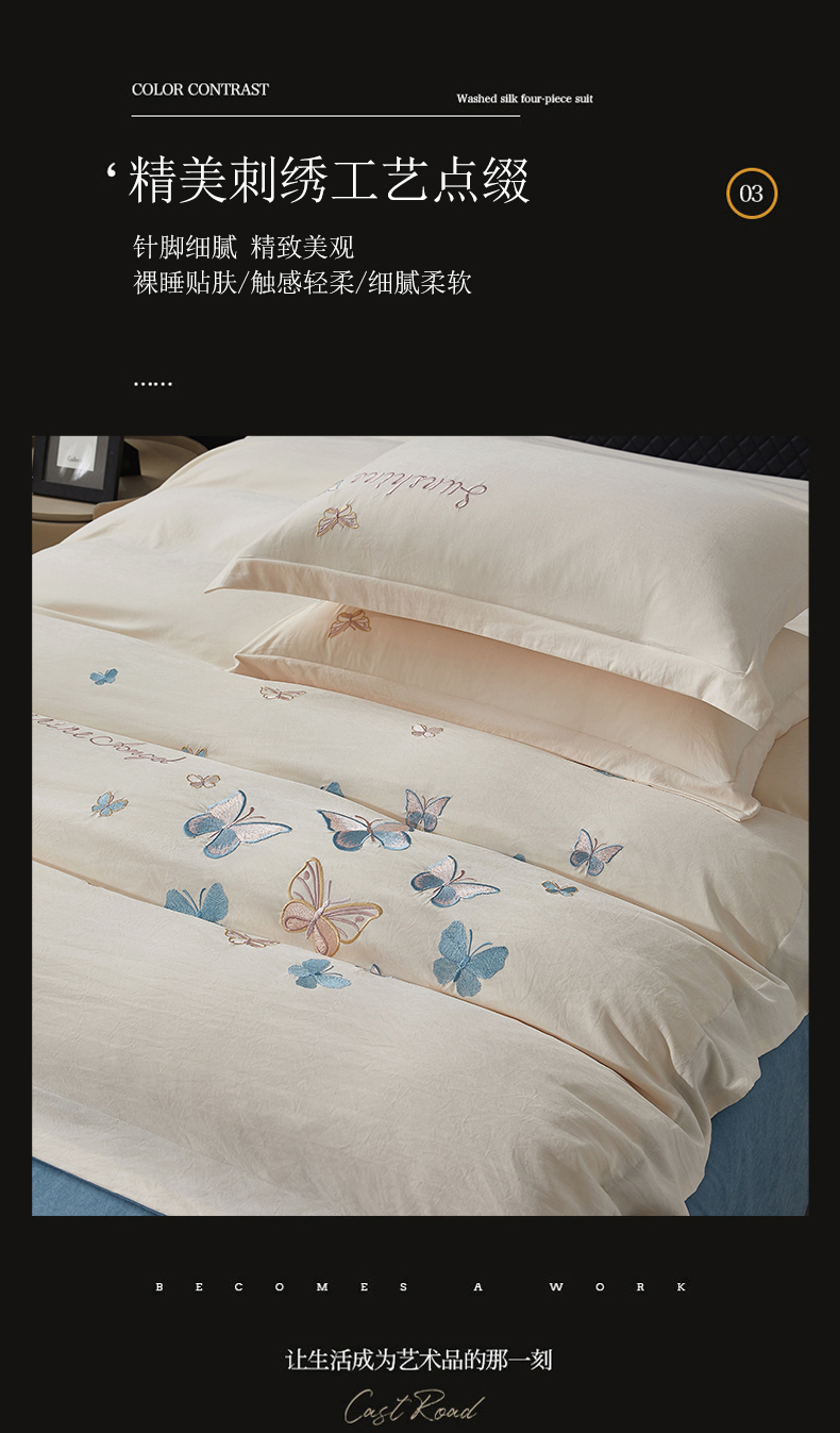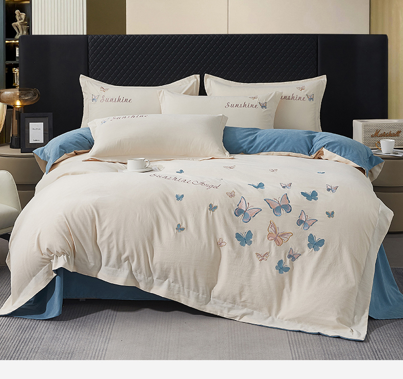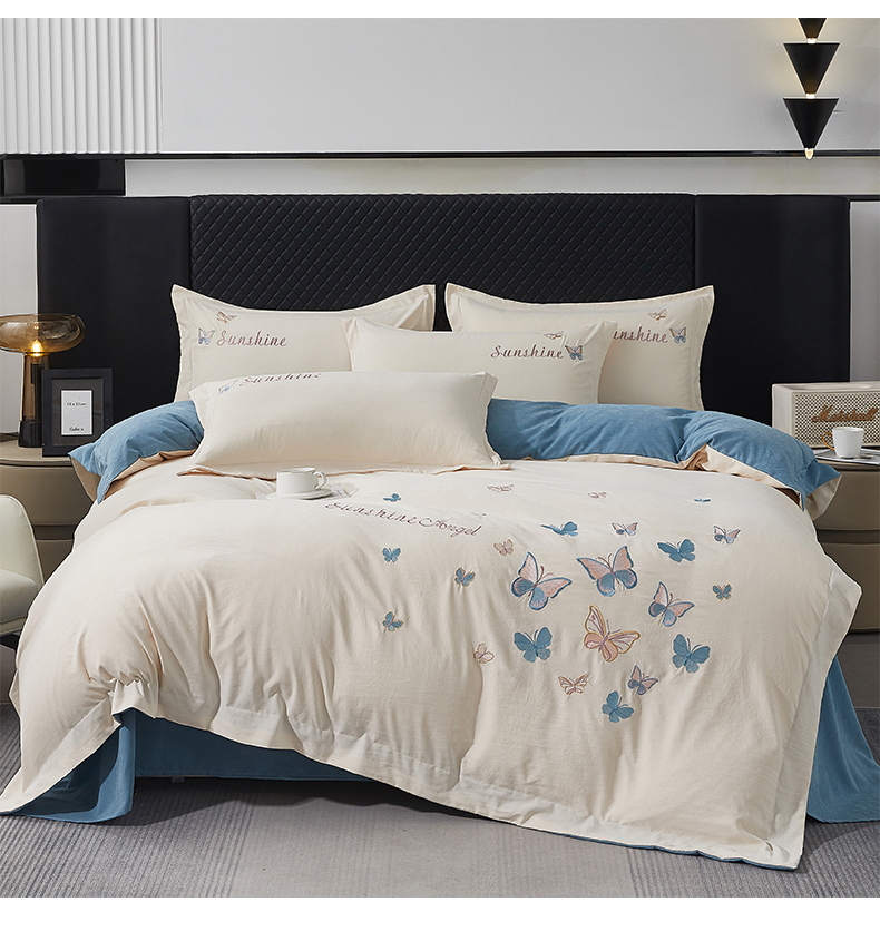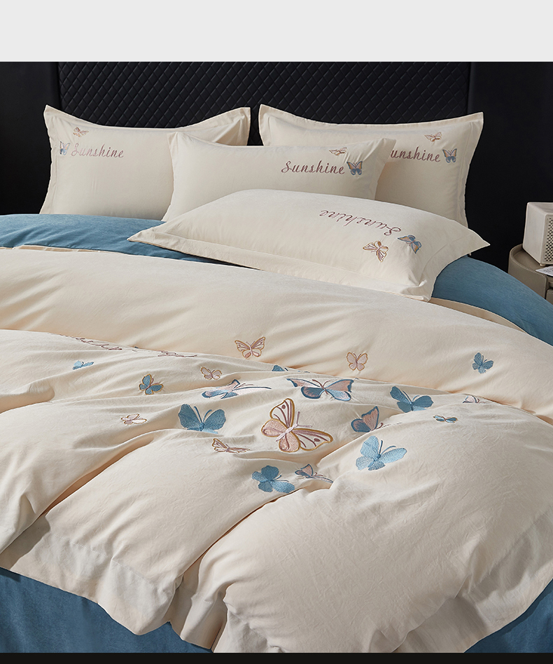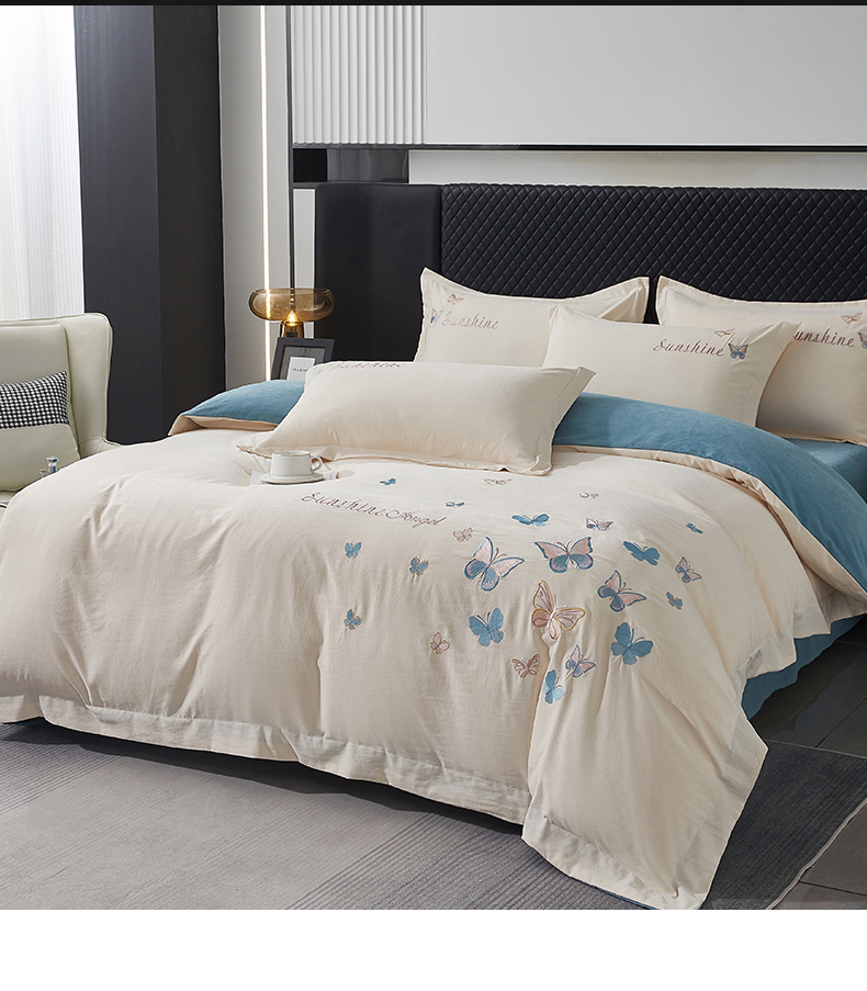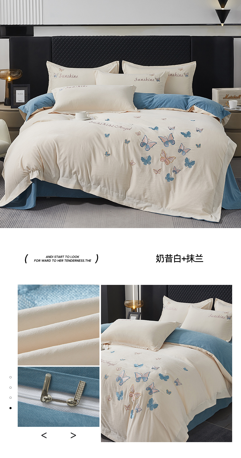 商品名称:(总)莱越家纺 2025新款轻奢刺绣蝴蝶牛奶蛋白棉四件套高档纯色亲肤棉双拼床单被套床笠式