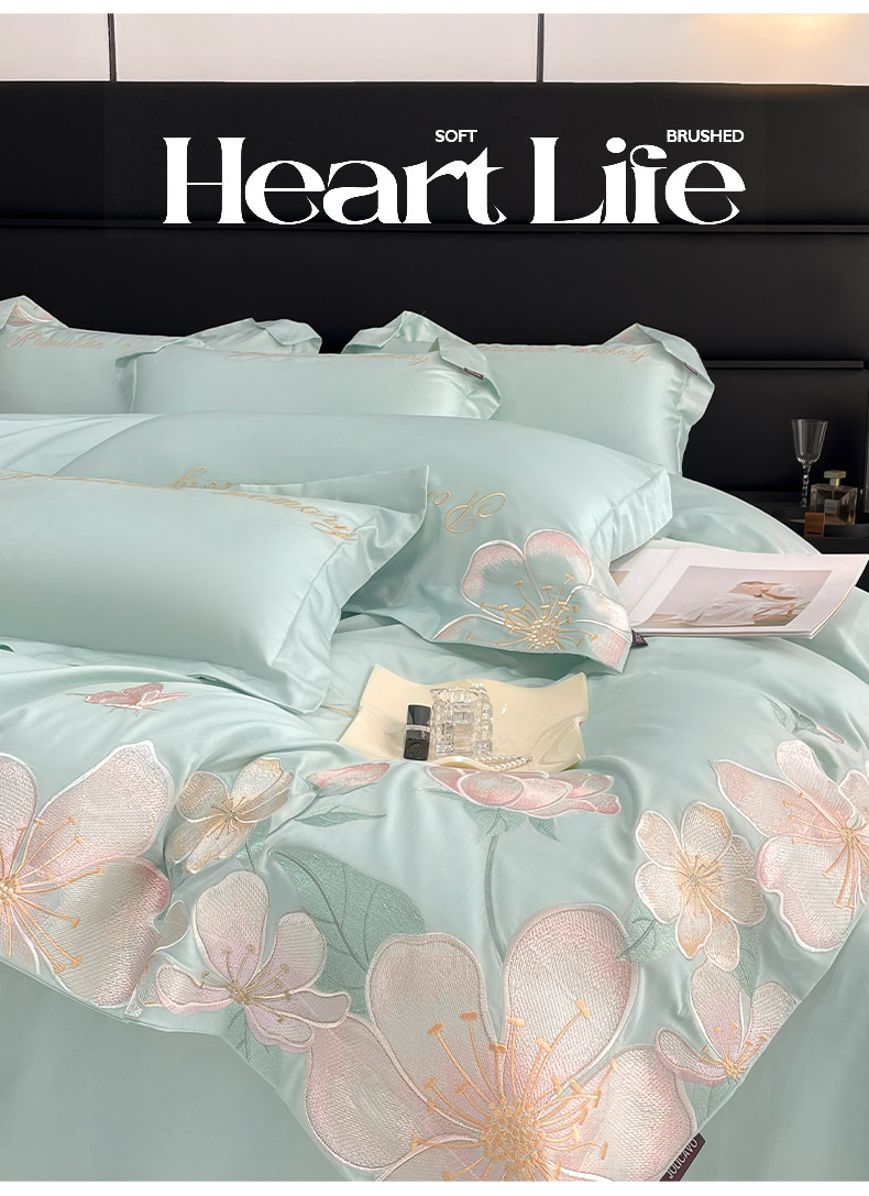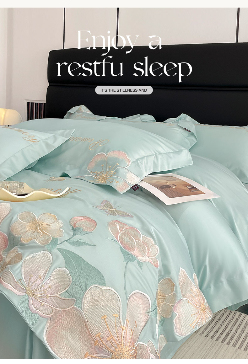 2025春夏A类100支长绒棉四件套纯棉全棉轻奢风床单被套重工刺绣床上用品-花漫屿 花漫屿-茶绿
