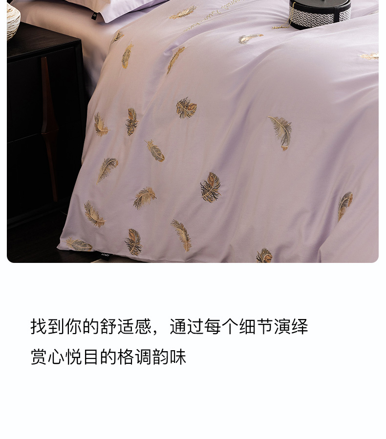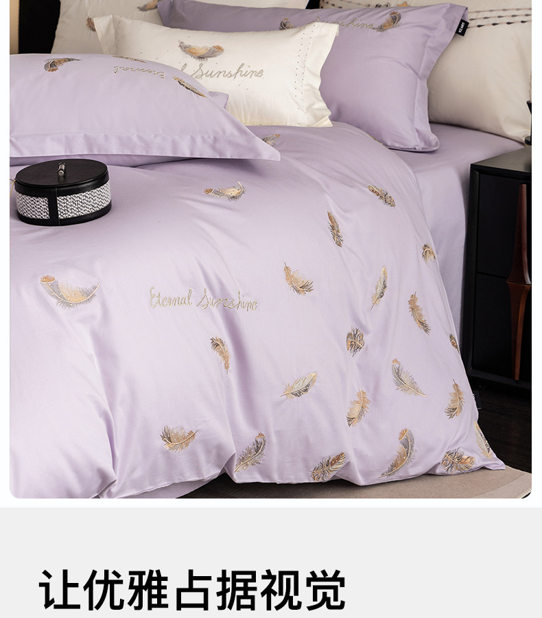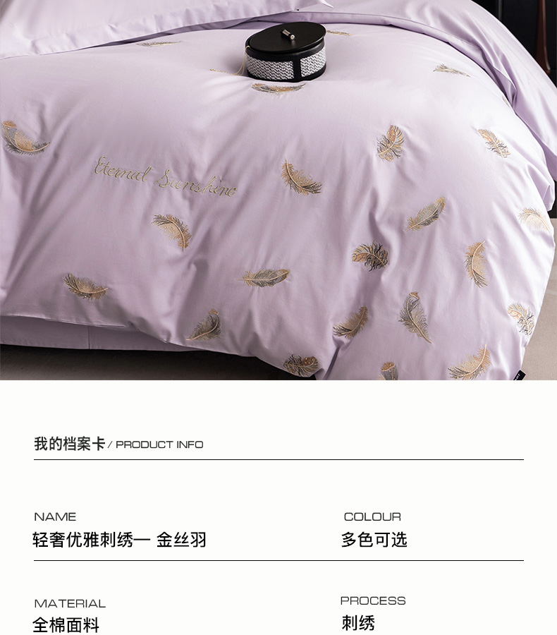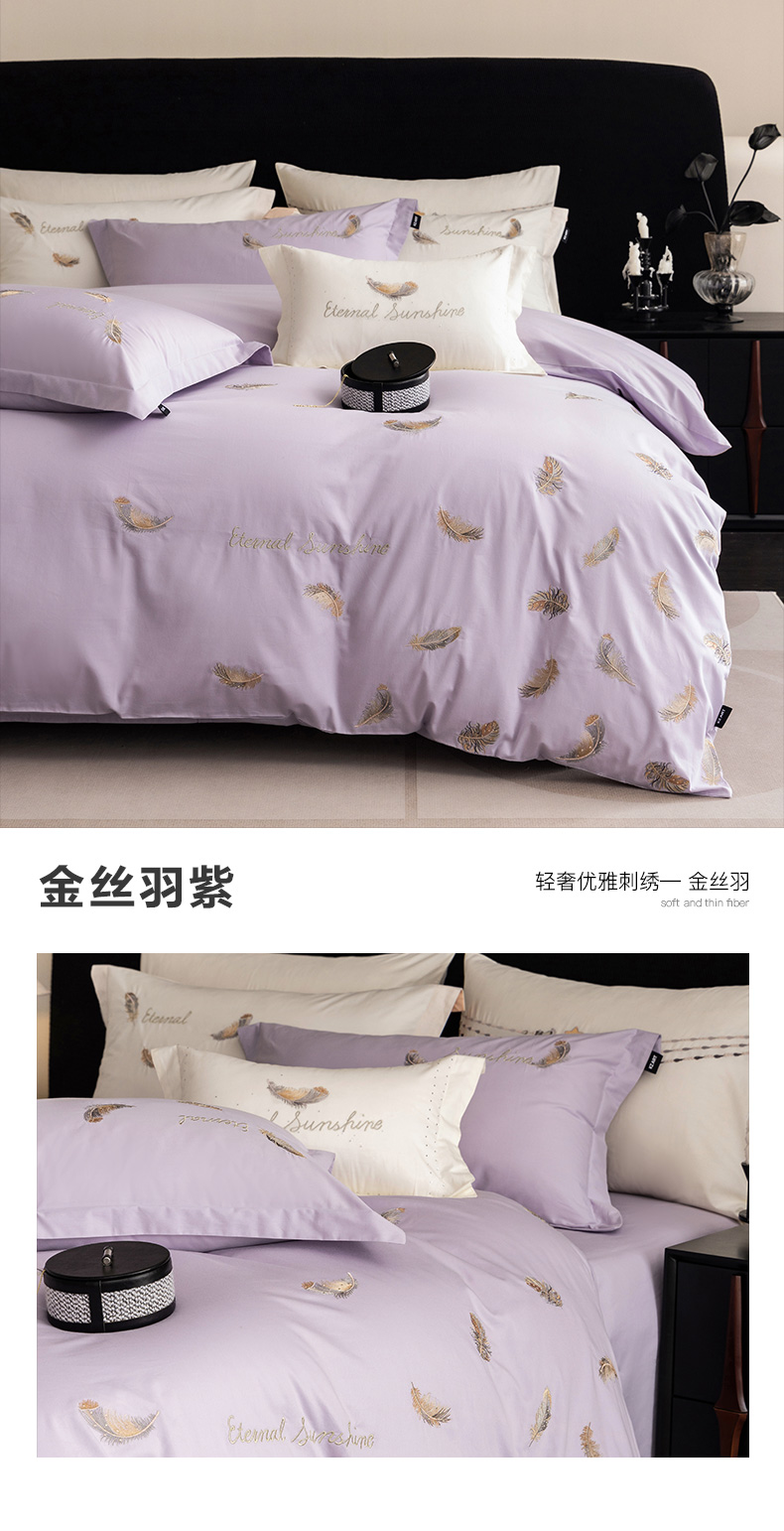 商品名称:卡姿家纺 2025春夏新款轻奢优雅刺绣金丝羽系列四件套 金丝羽紫