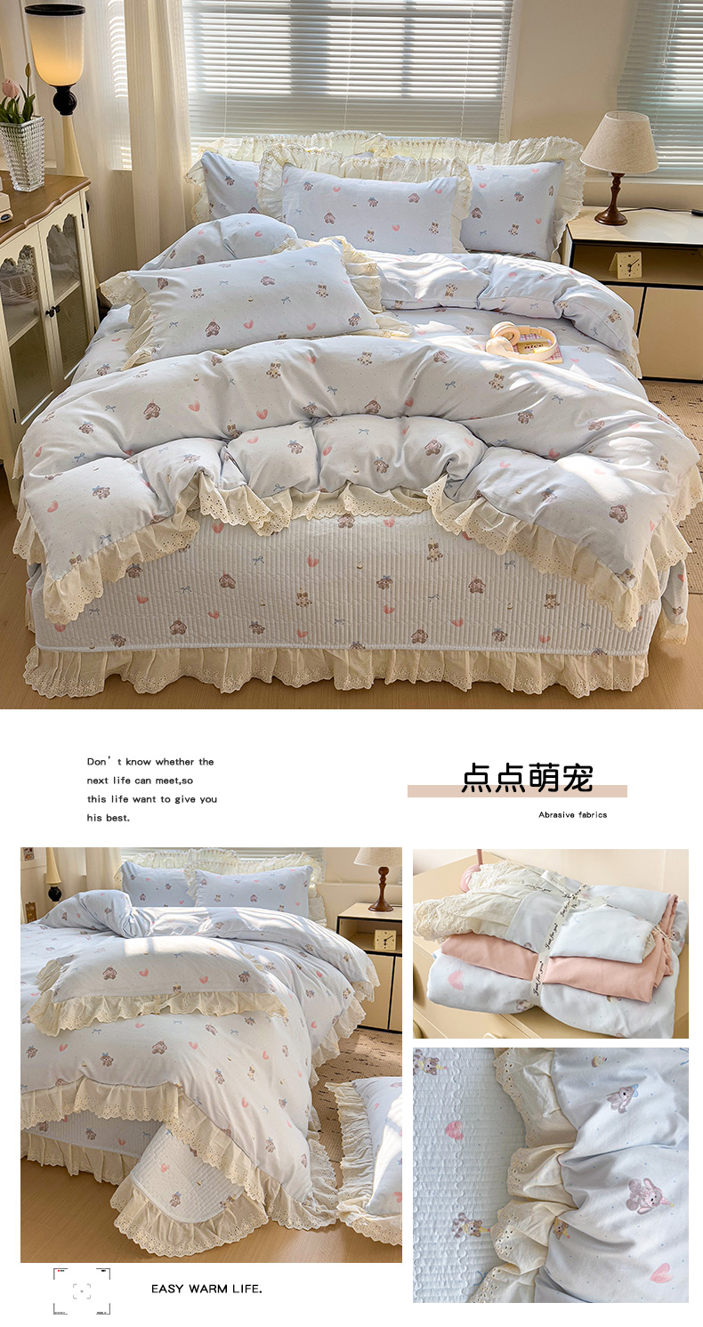 当前位置: 91家纺网 > 商品网购 > 床品套件 > 四件套 > 双层纱四件套 > 富米莱(原臻工厂) 2025新款A类针织双层纱花边款四件套床盖四件套 点点萌宠